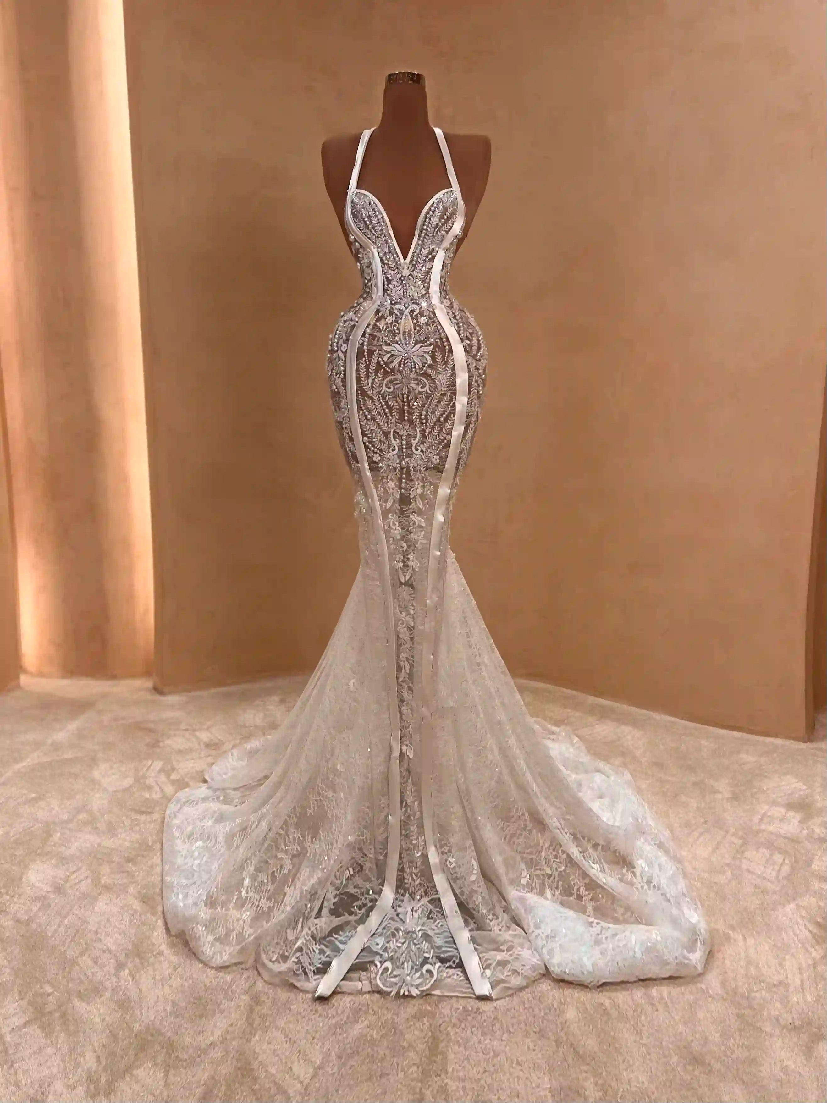 A white bridal gown with a deep v-neckline, sleeveless design, and a long train, adorned with silver embellishments and beads.