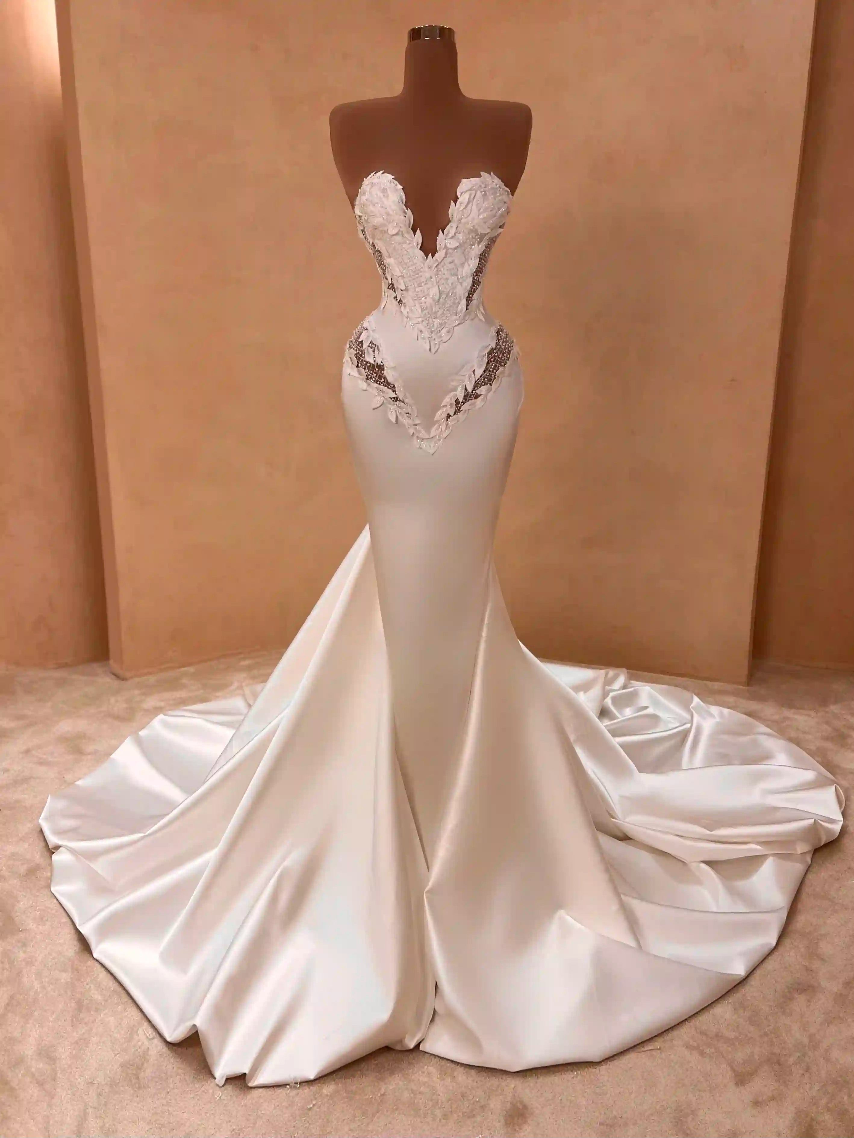 Discover two stunning bridal gowns crafted for elegance and bold style. The first features a deep V-cut neckline, long sleeves, and sophisticated side cutouts, combining classic coverage with modern allure. The second is a strapless mermaid silhouette with a V-cut front and side cutouts, accentuating curves for a dramatic, flattering fit. Both designs offer unique options for brides seeking a blend of timeless grace and contemporary detail on their special day.