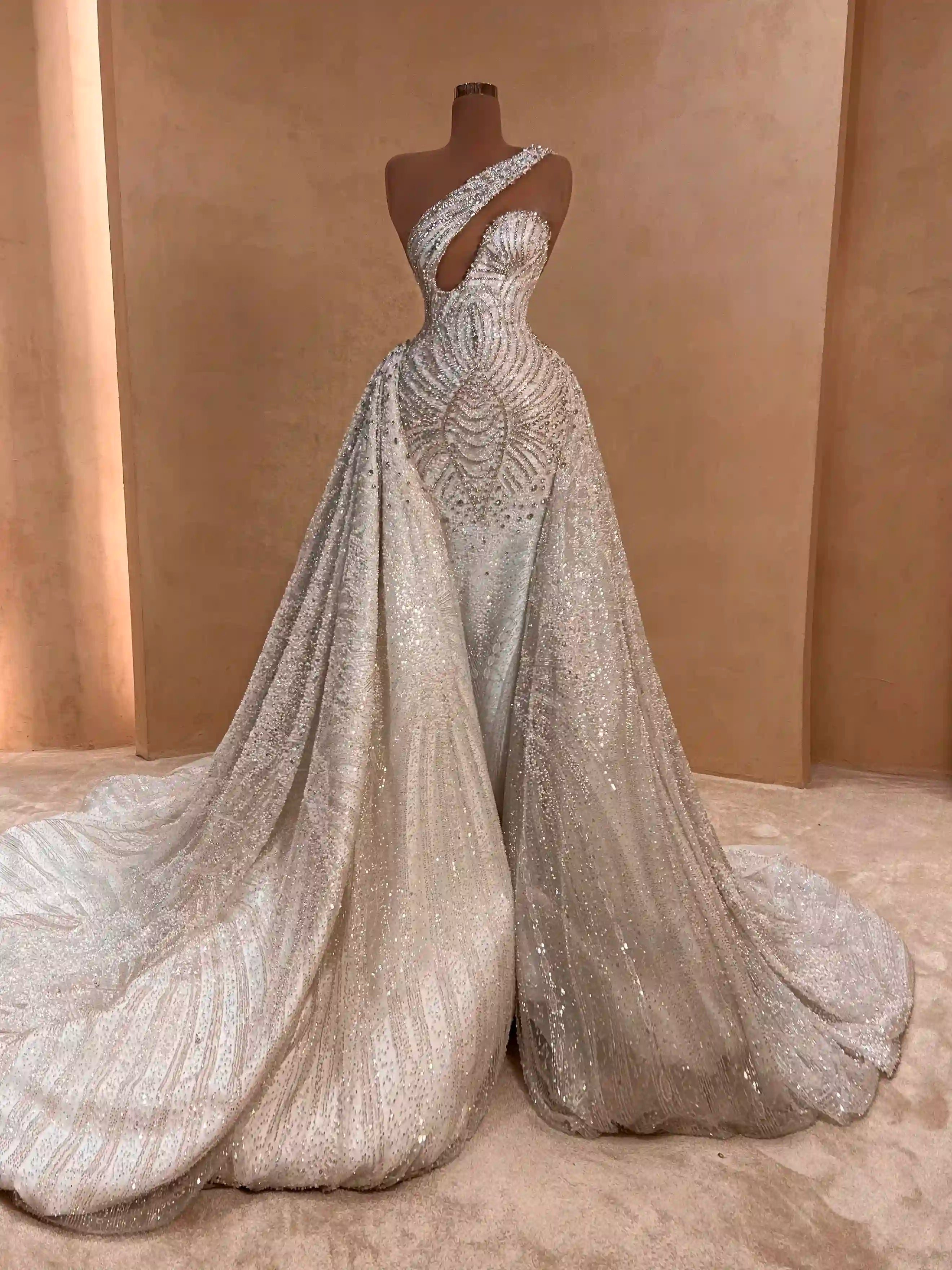 A white bridal gown with sequins and intricate embellishments, featuring a one-shoulder neckline and voluminous skirt.