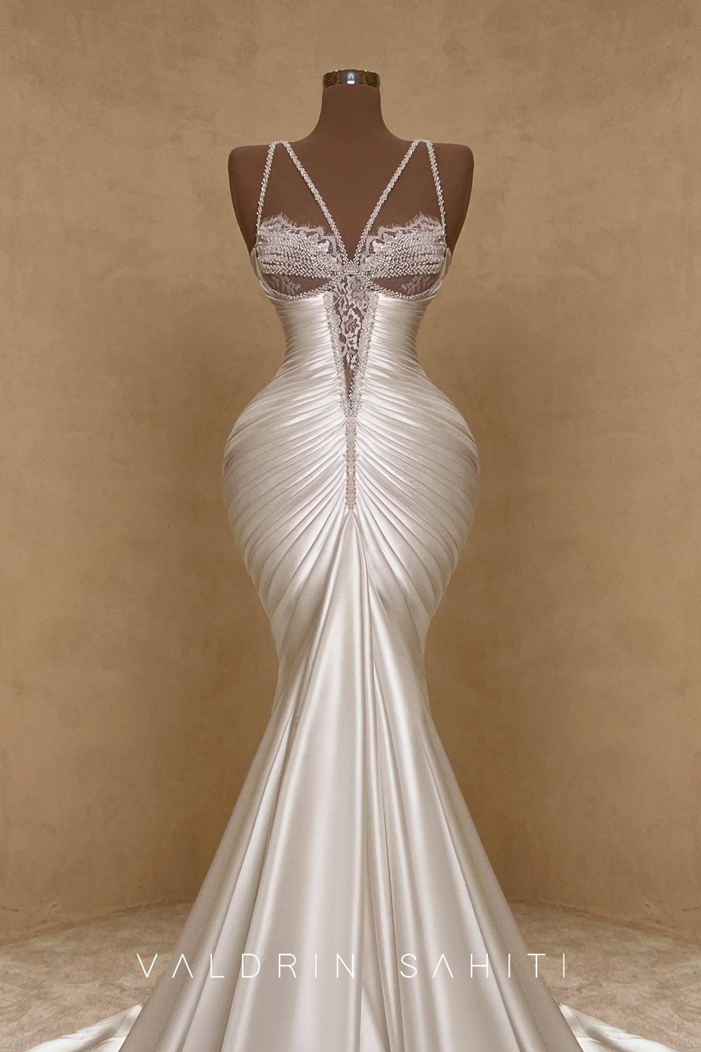 A vision of divine elegance, this satin and lace bridal gown by Valdrin Sahiti is the essence of romance and modern couture.