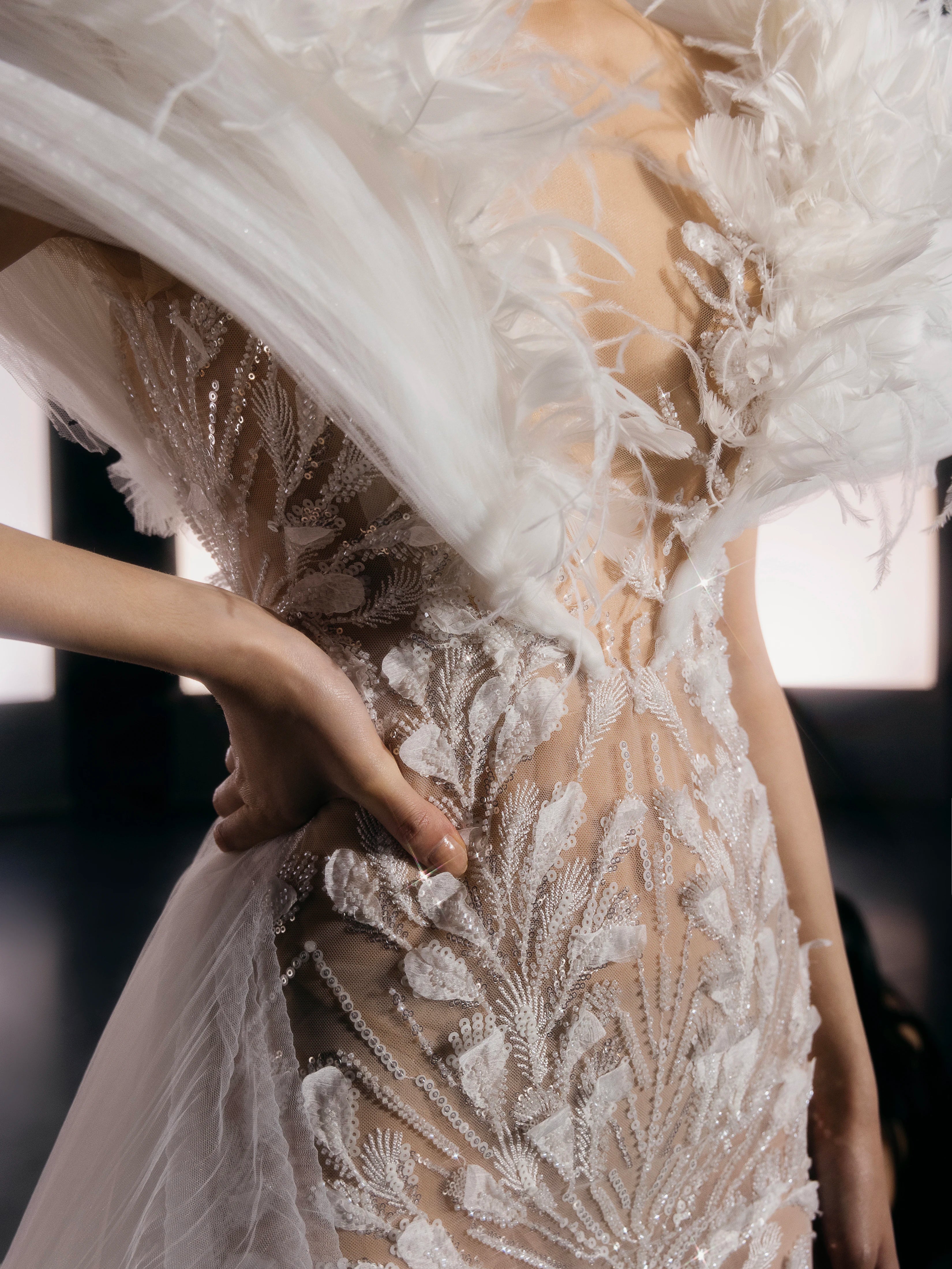 Long Floral Fabric with Voluminous Tulle Shoulders with 3D Flowers and Mesh Train