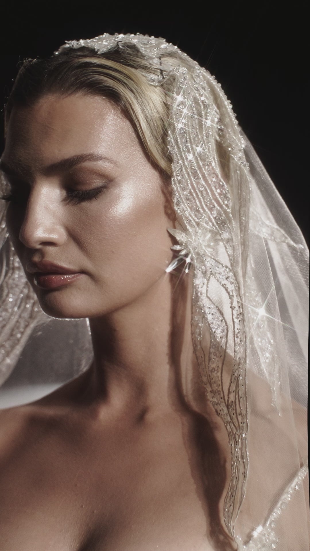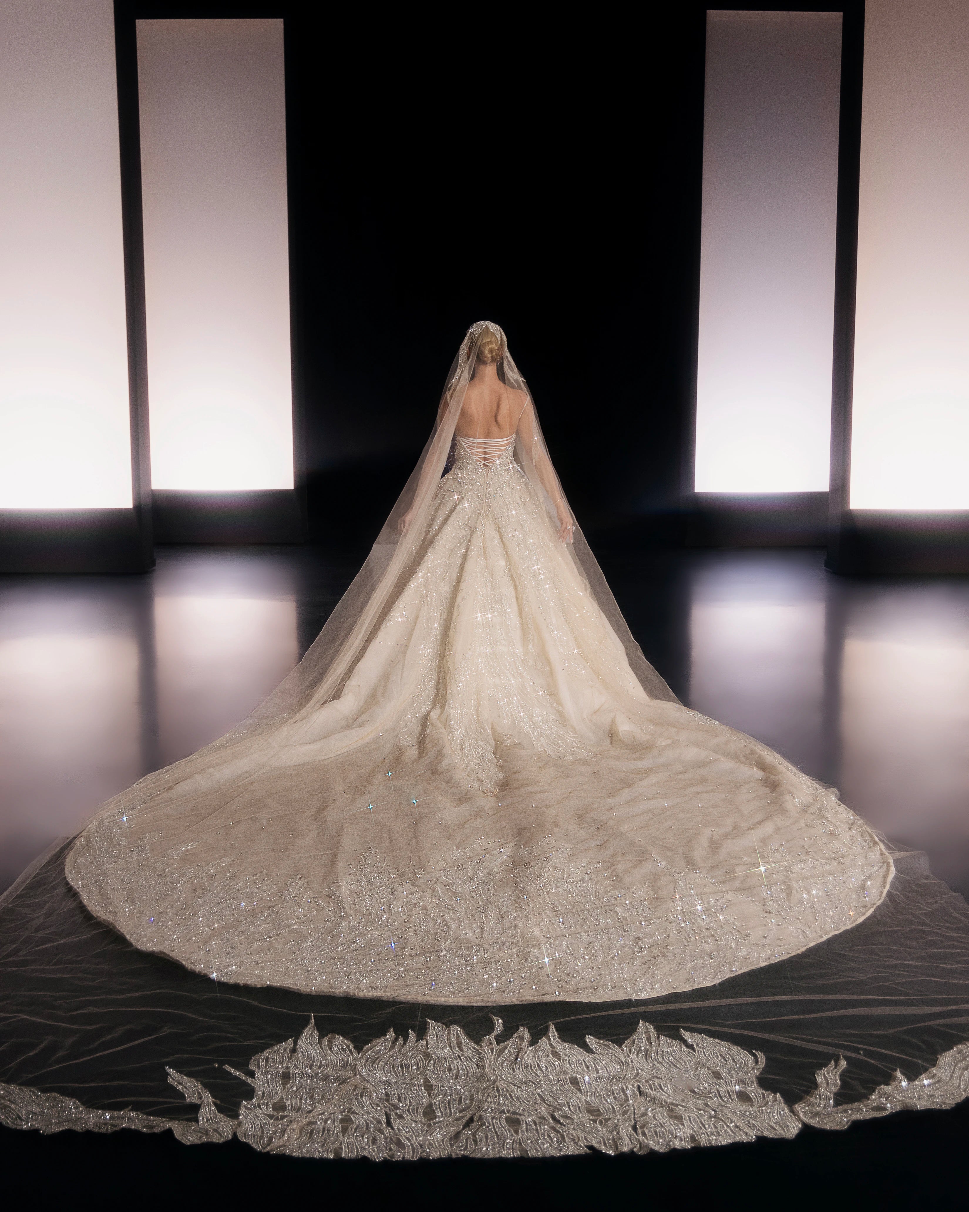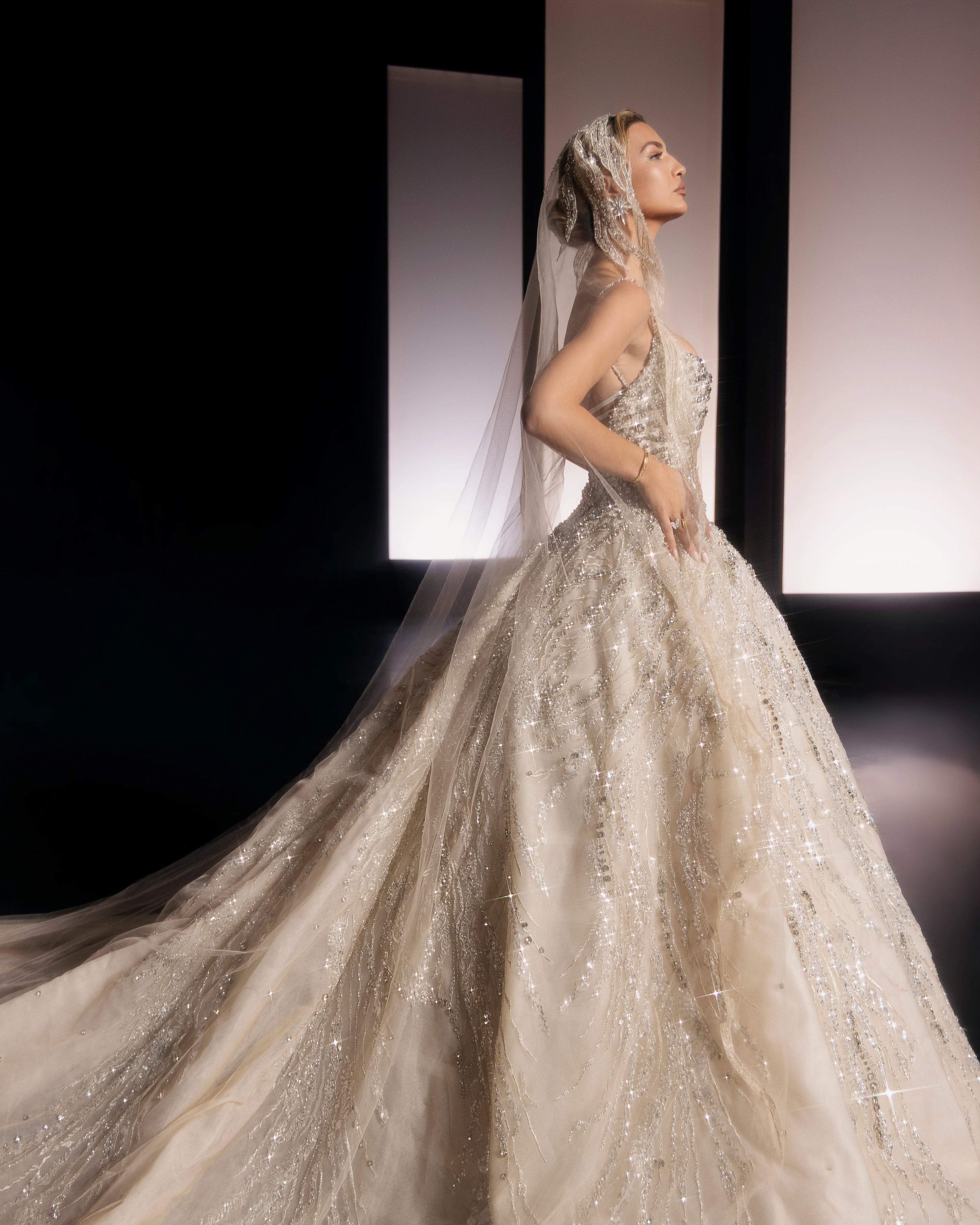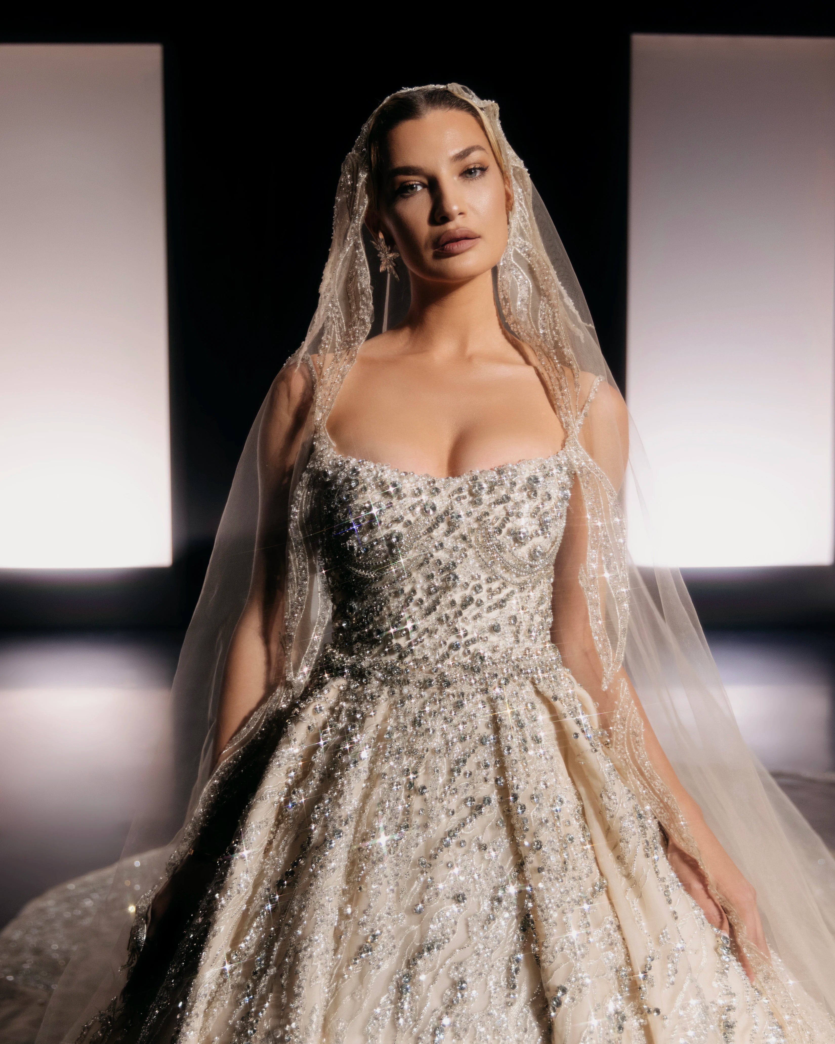 Cream Ball Gown Fully Embroidered with Rhinestones and Thin Shoulder Straps