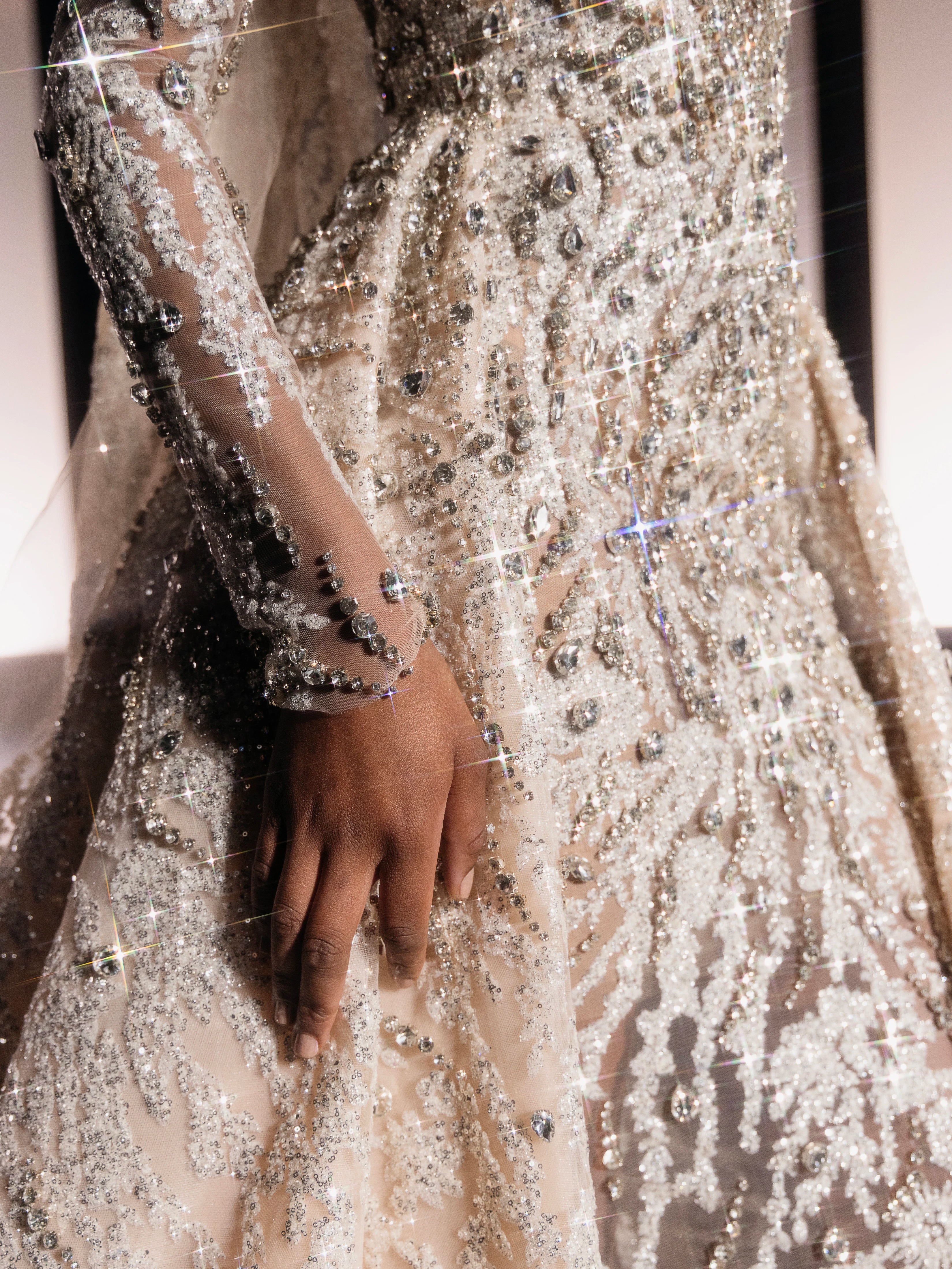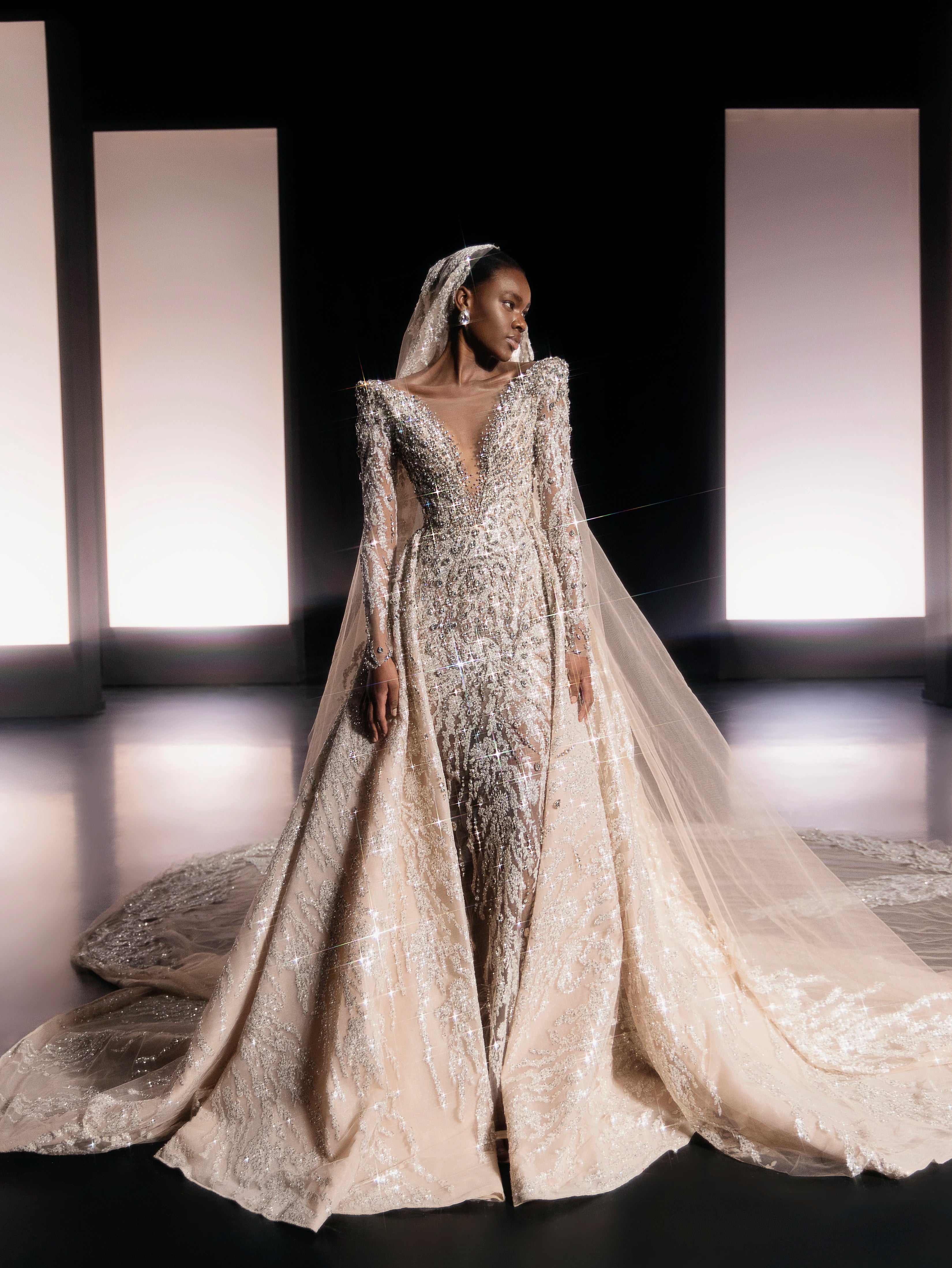 Long Tan V-Neck Dress with Long Sleeves and Rhinestone Fabric, including Detachable Train