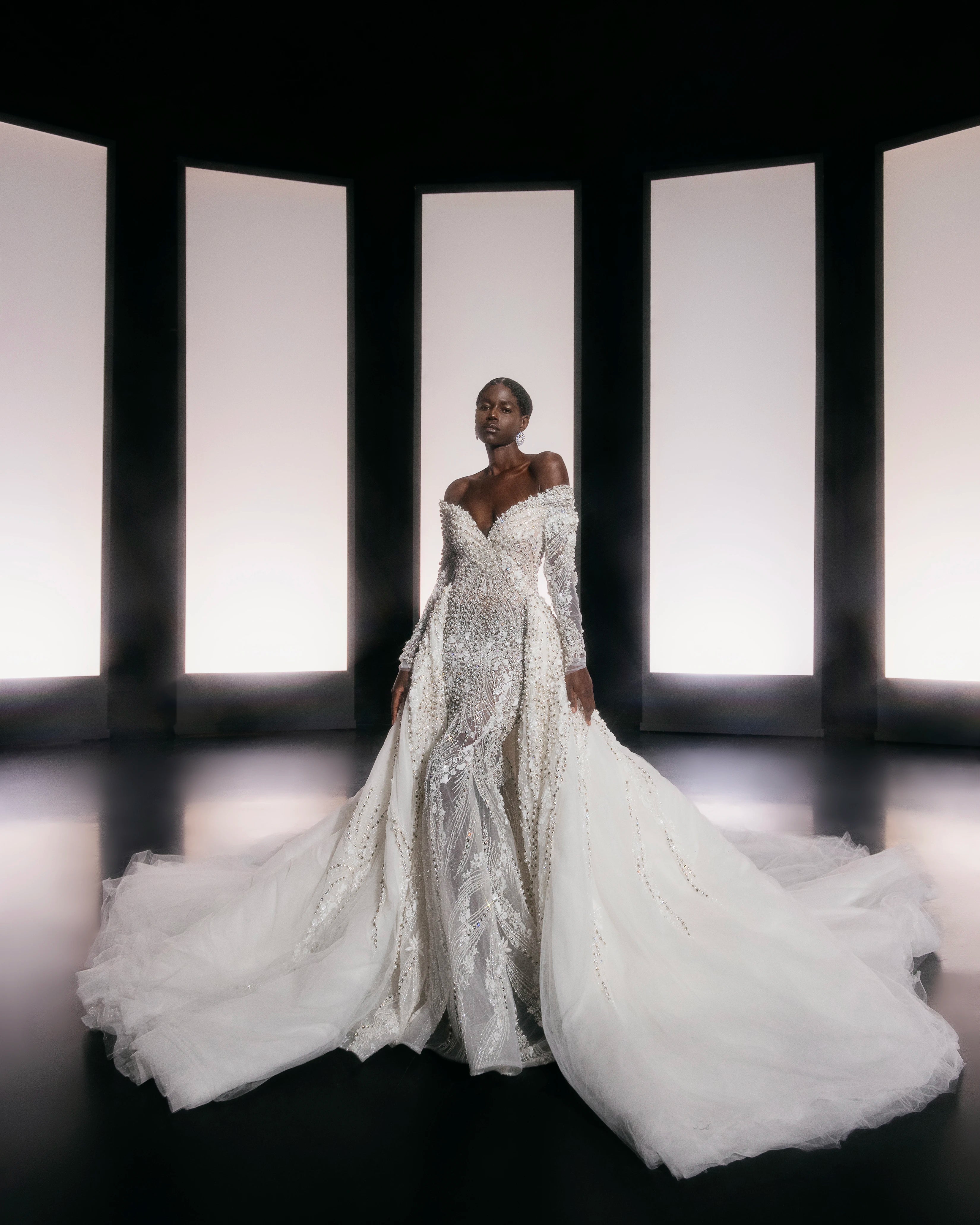 Long Off-The-Shoulder Dress with Floral Fabric Embroidered with Pearls and Detachable Mesh Train.