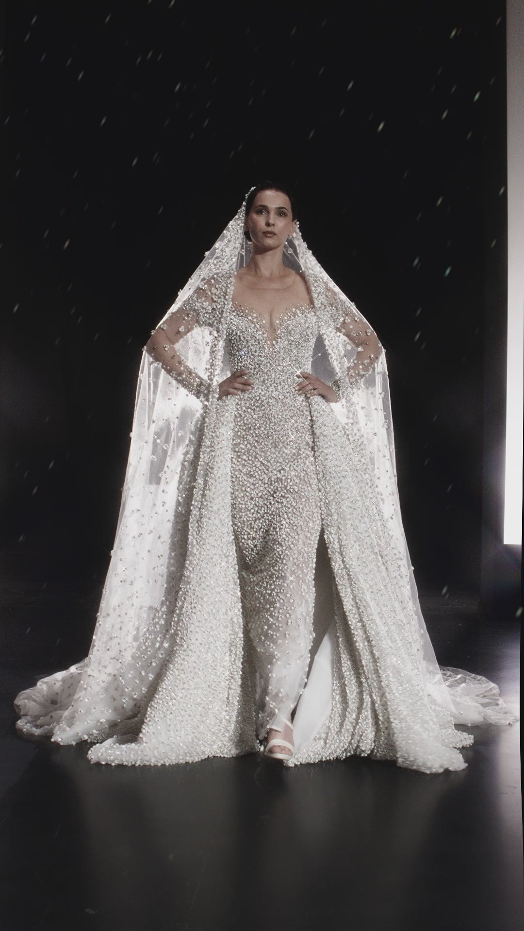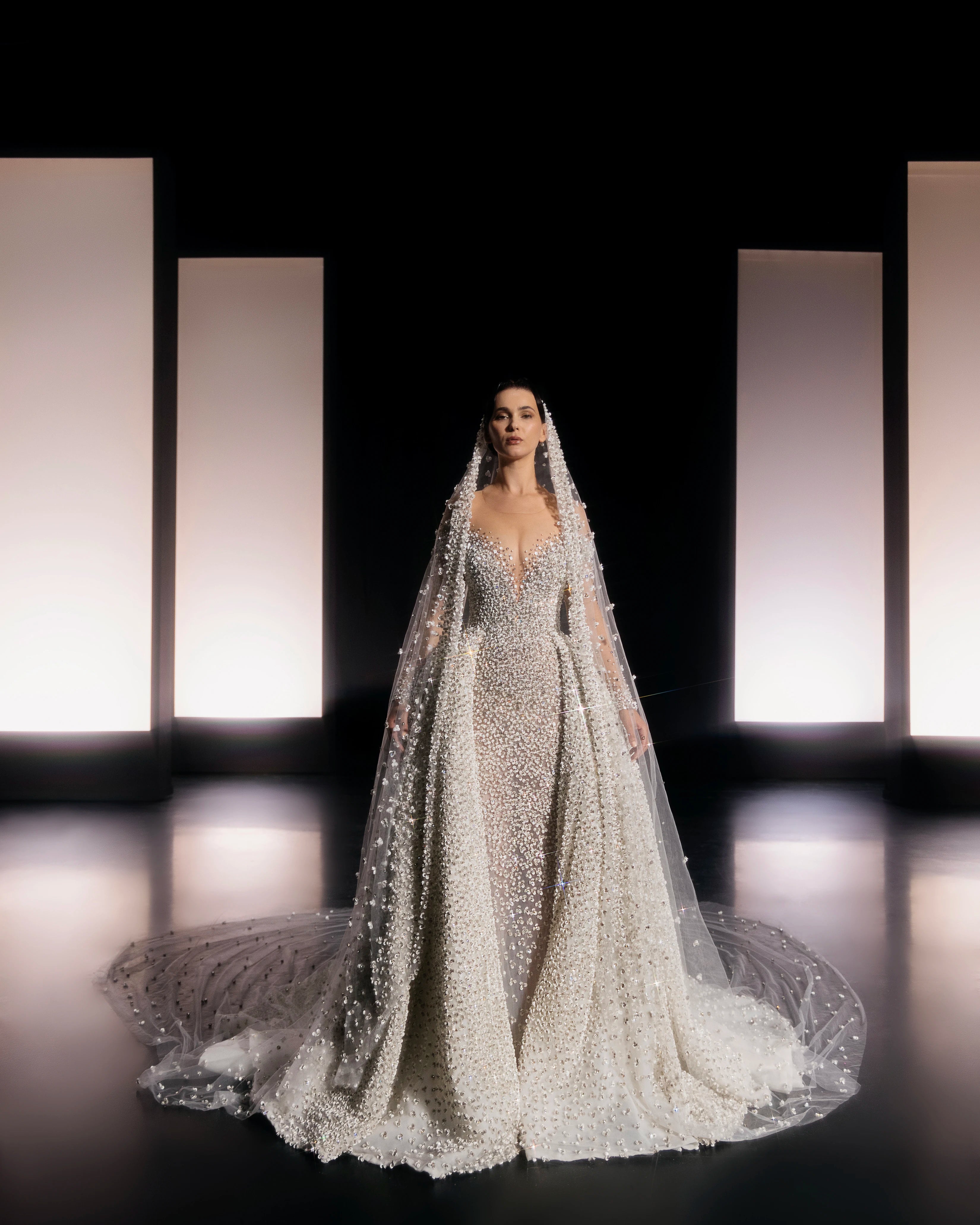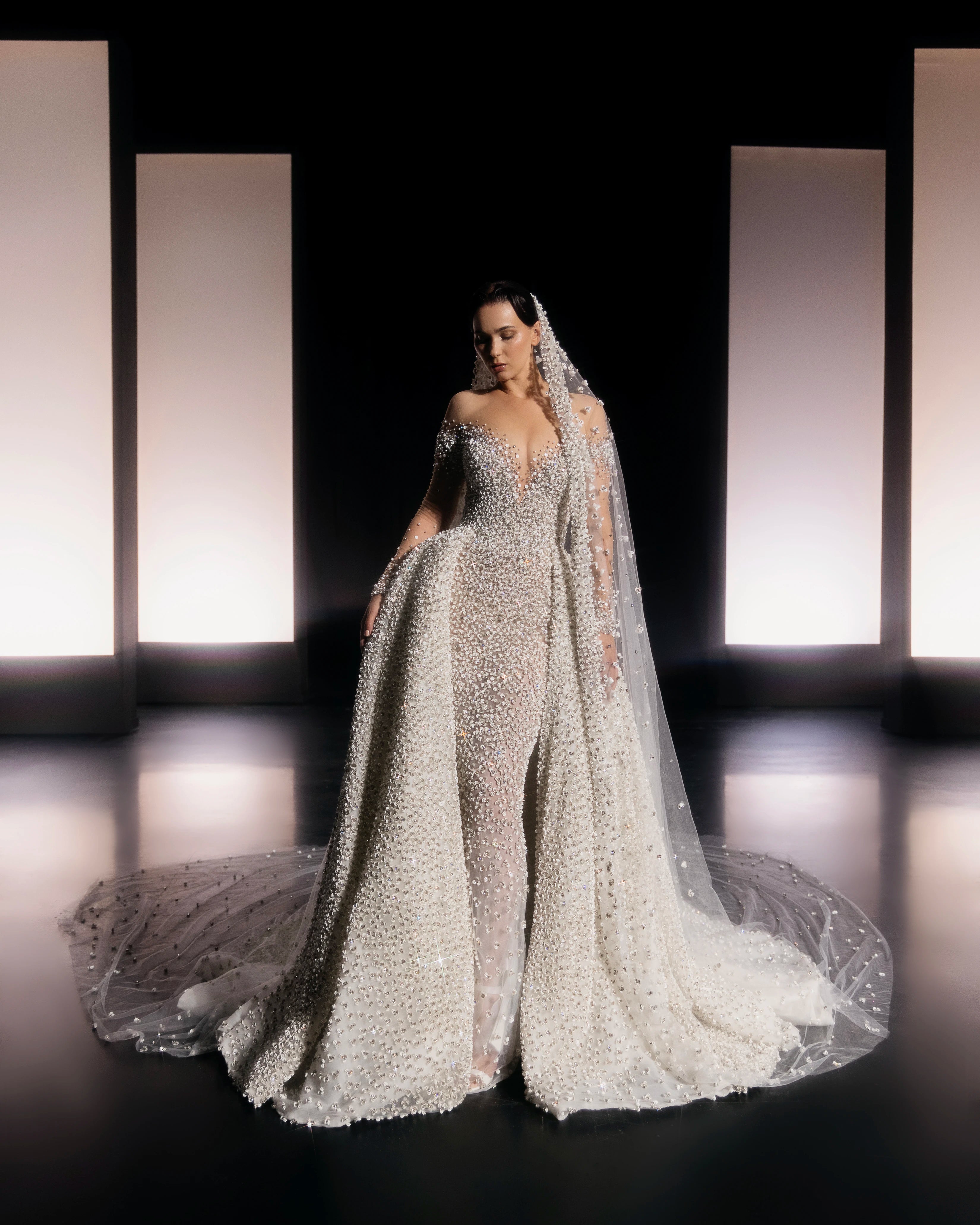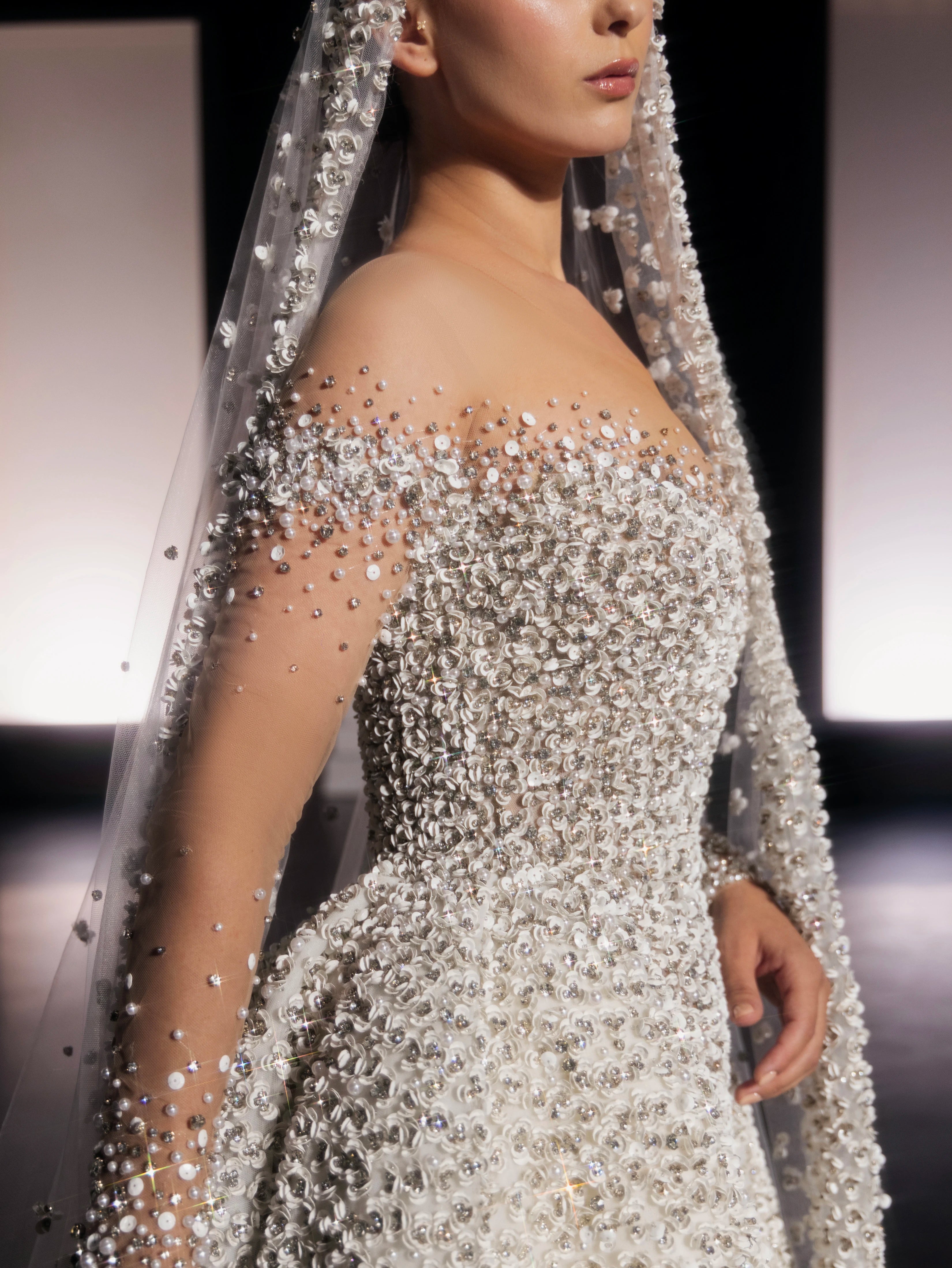 - Sheer embellished cathedral veil attached at shoulders
