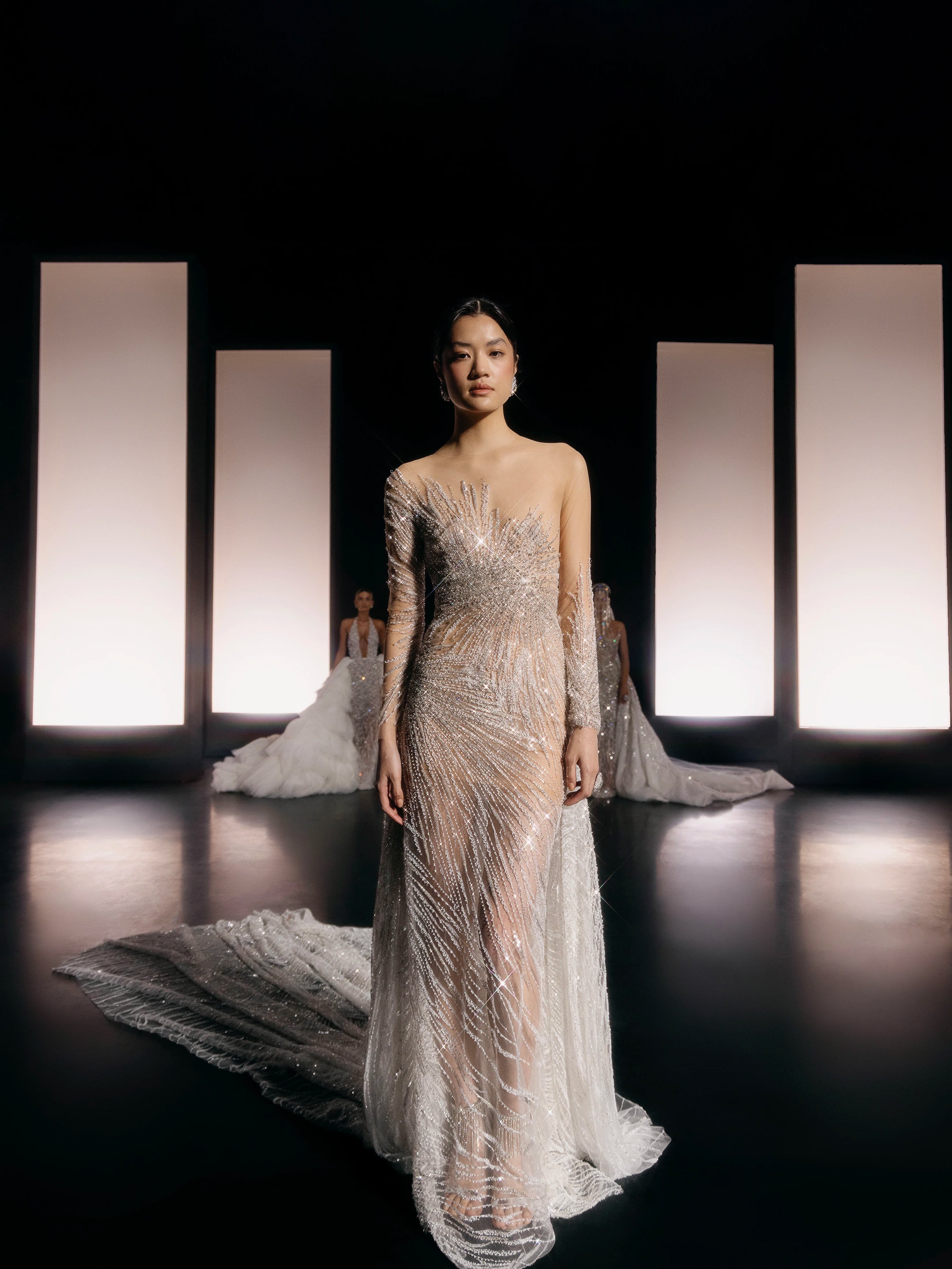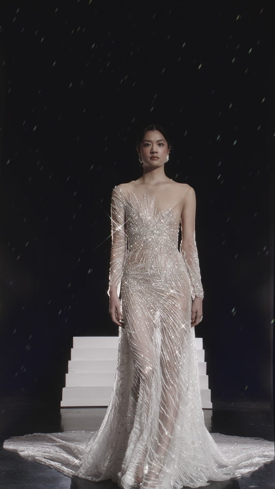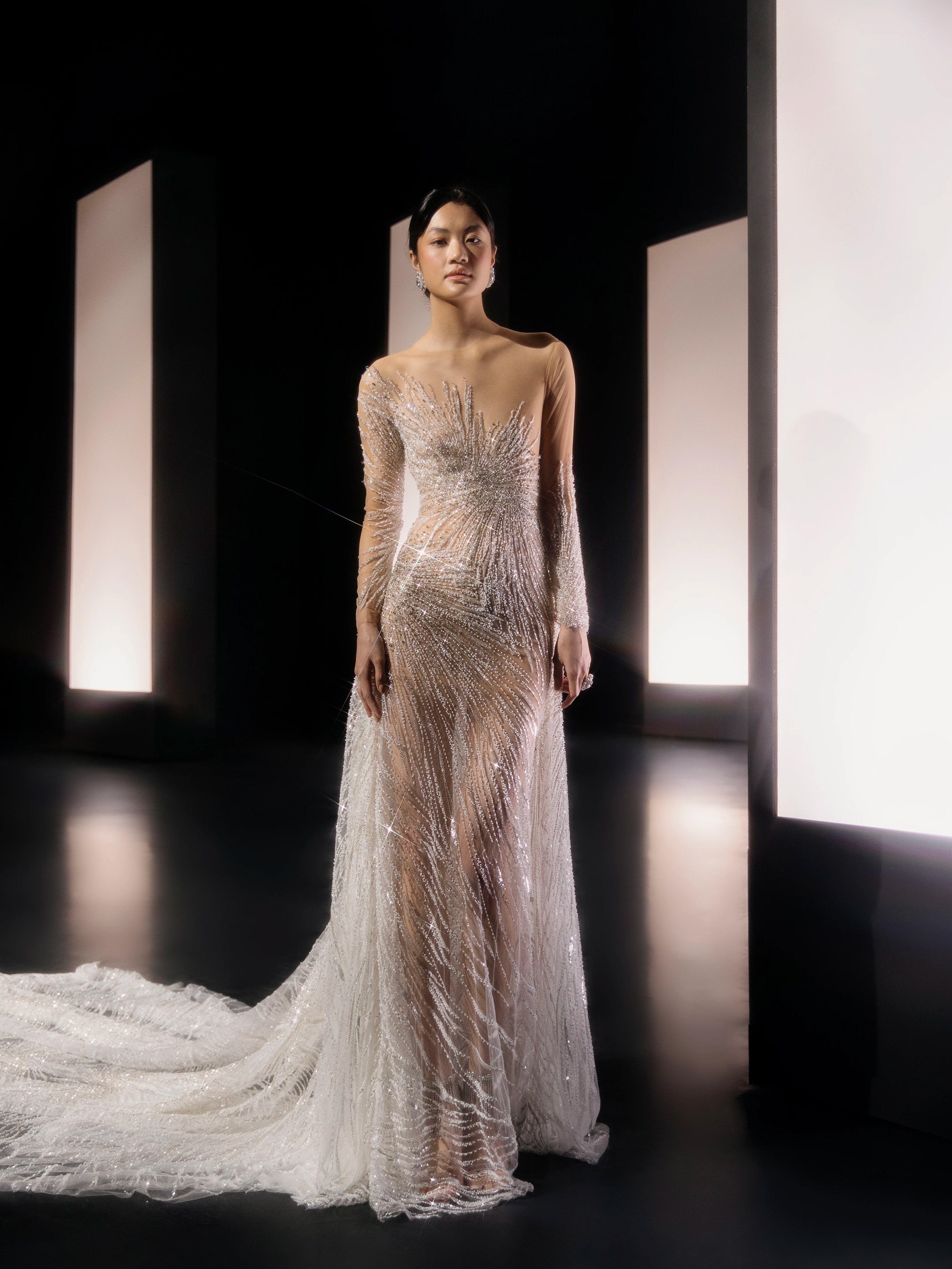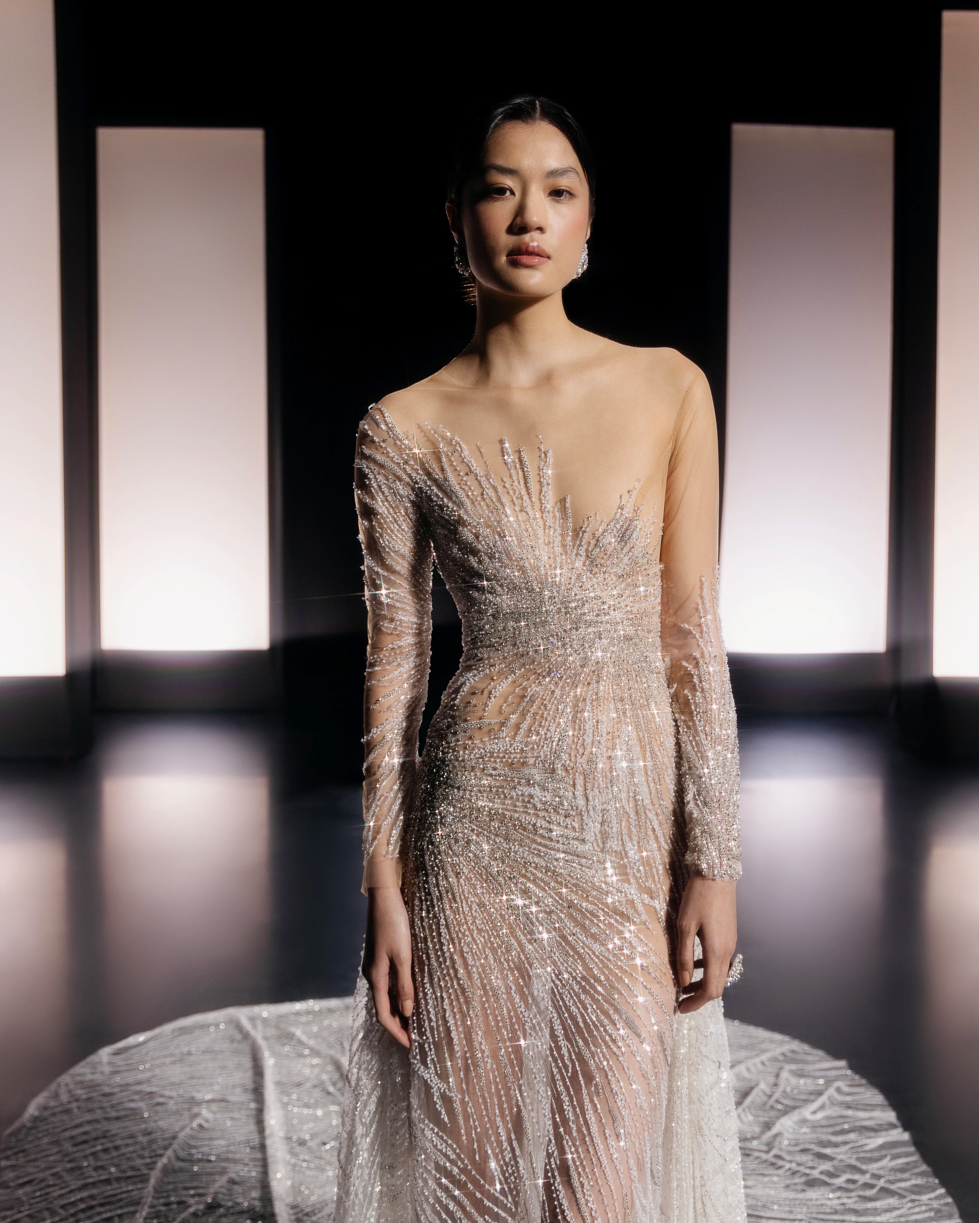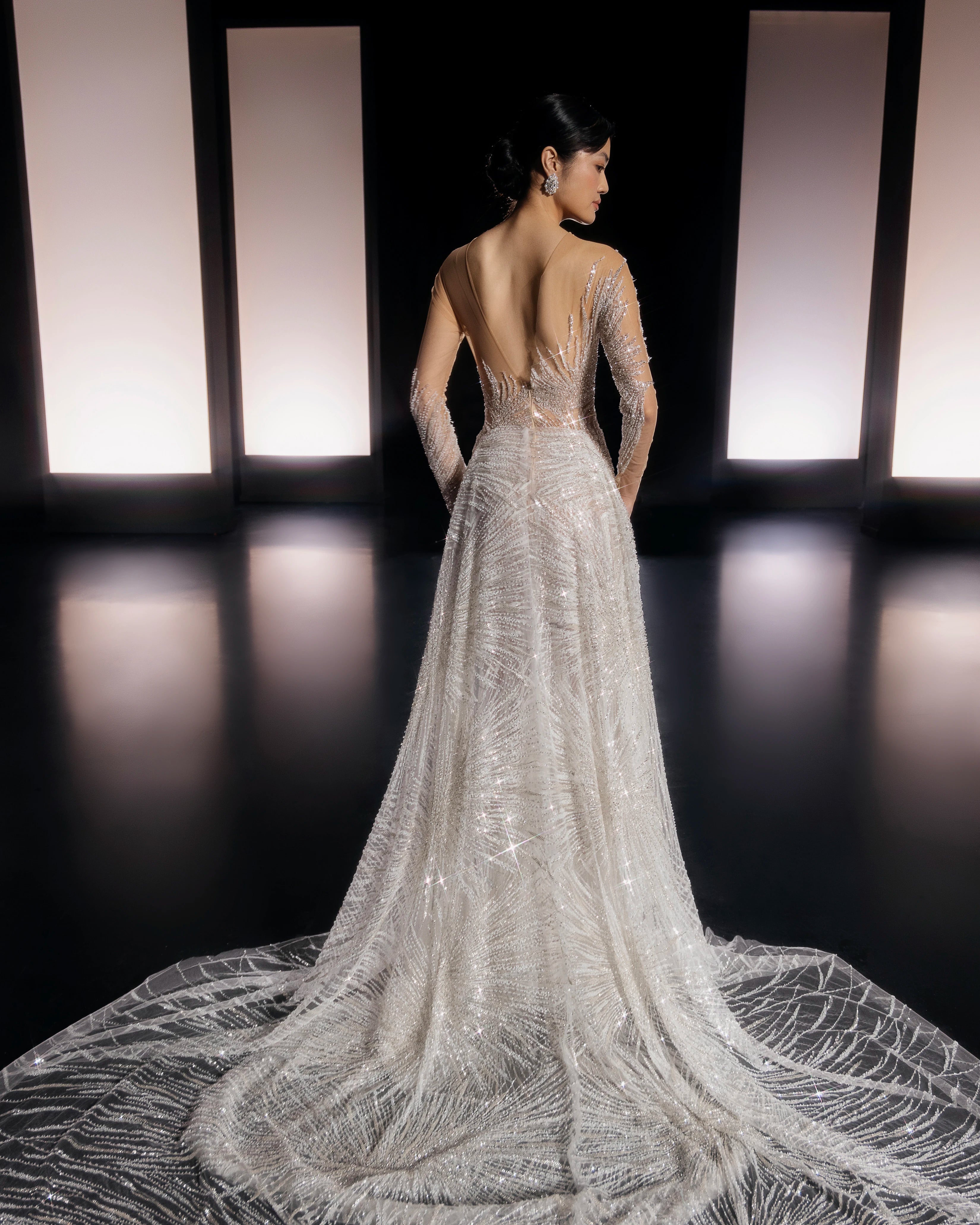 Long Asymmetrical Dress with Rhinestone Fabric and Detachable Train