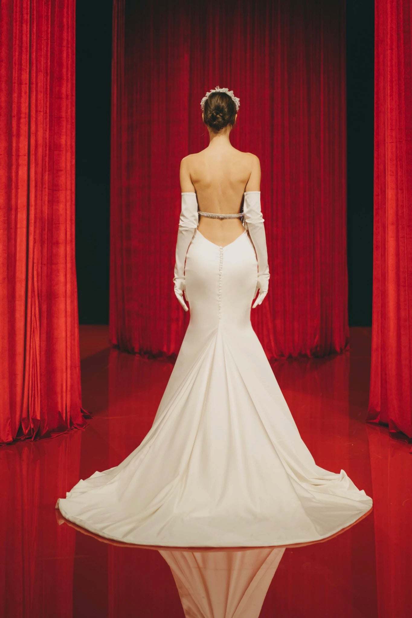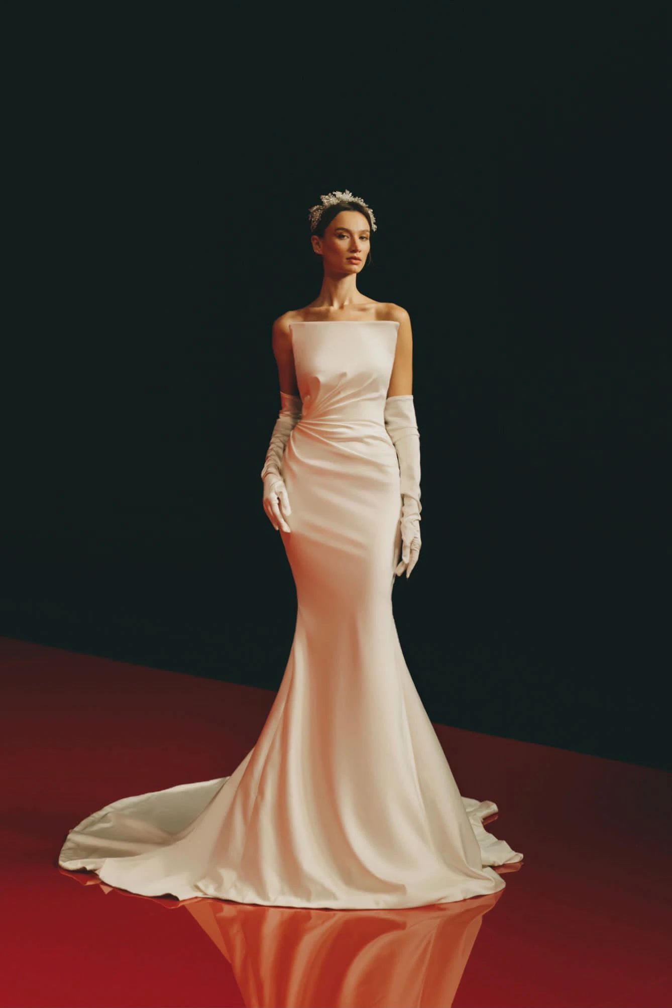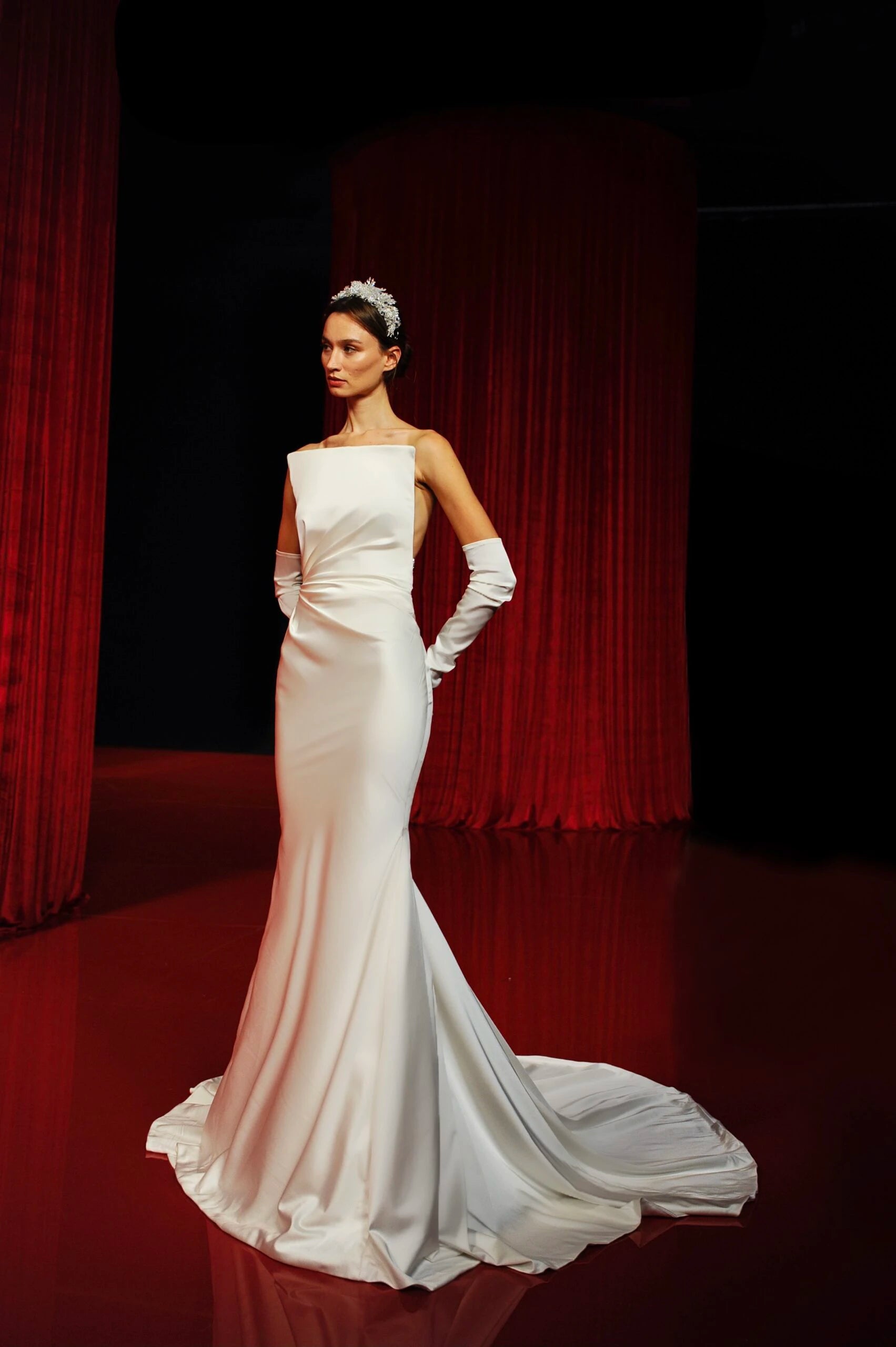 SQUARE DRAPED BODICE TO THE SIDE SILK DRESS, WITH A DETAILED STRIPE, WITH SILVER CRYSTALS AND STONES, WITH SILK LONG GLOVES AND LONG TRAIN.