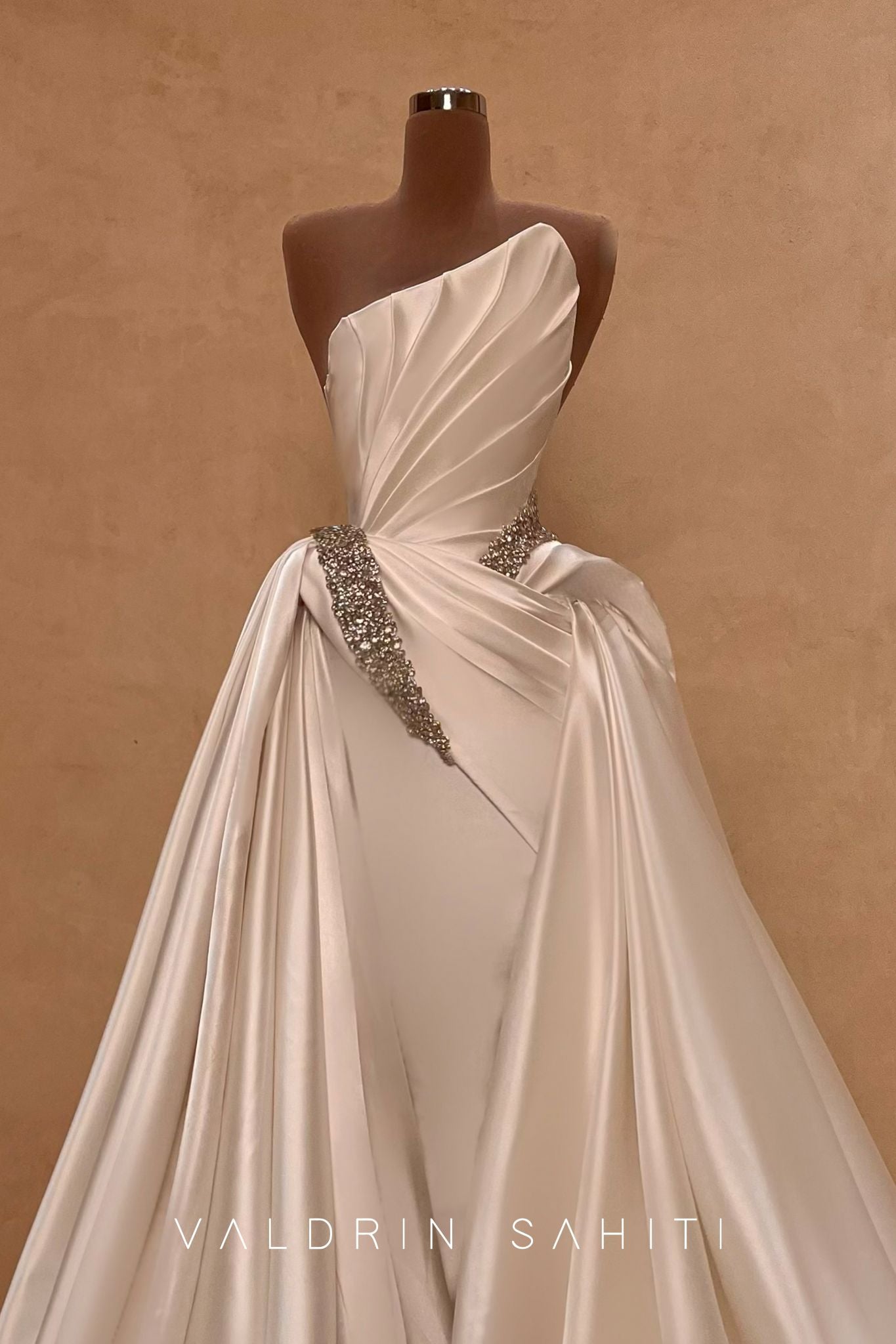 This luxurious haute couture gown by Valdrin Sahiti features an asymmetrical one-shoulder neckline and a sculpted bodice that flows seamlessly into a voluminous satin skirt. The design showcases intricate pleating and crystal embellishments at the waist, creating a dramatic, regal silhouette. Crafted in a rich champagne-white satin, the gown exudes timeless elegance - perfect for high-fashion editorials, red carpet appearances, or a statement bridal look.