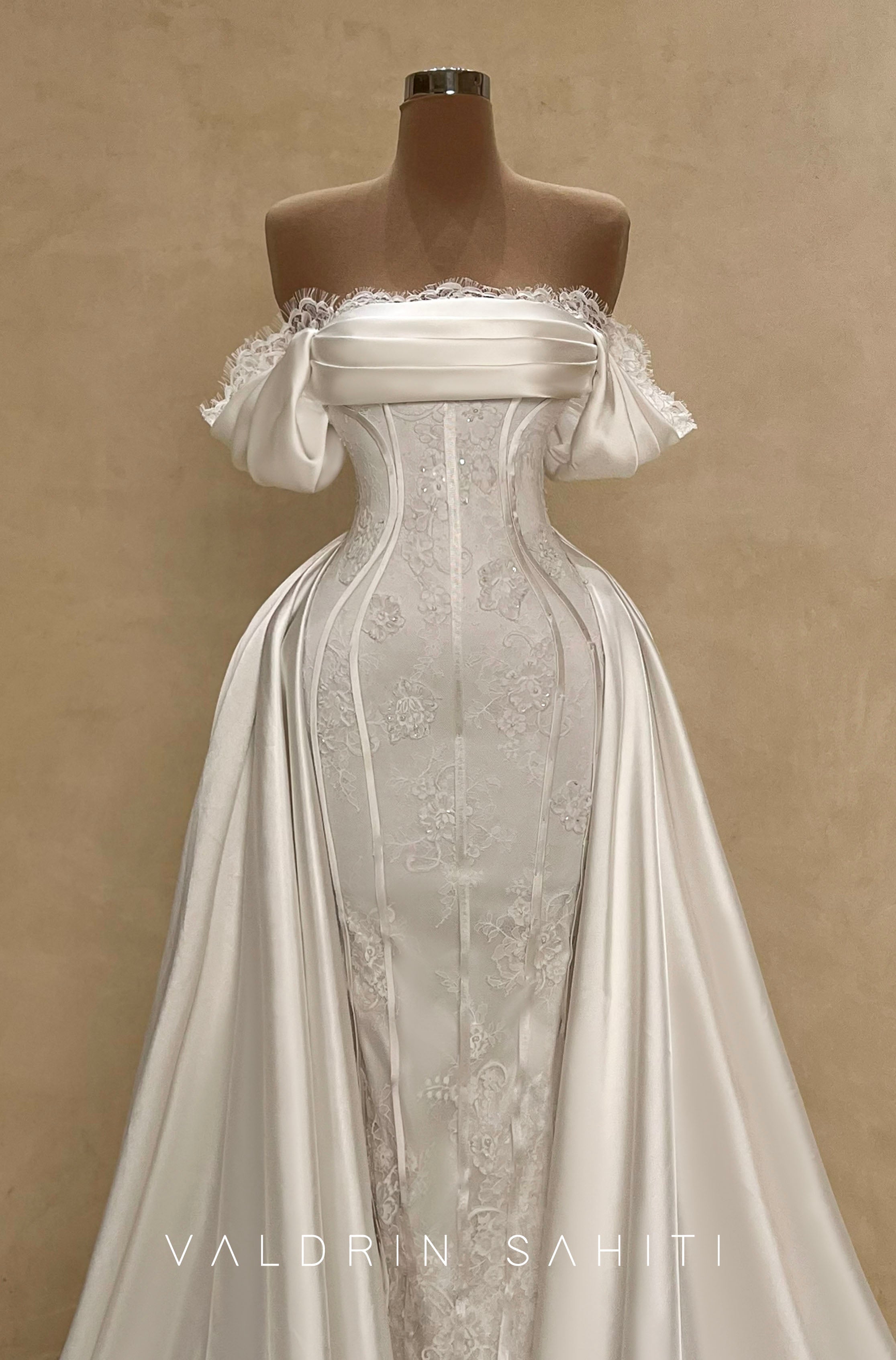 Elevate your bridal look with this sculptural masterpiece from Valdrin Sahiti’s couture collection. This gown features a delicately boned corset bodice adorned with sheer lace embroidery that flatters the figure and defines the waistline with precision. The off-shoulder neckline is wrapped in soft satin folds and subtle lace trim, exuding romantic sophistication.