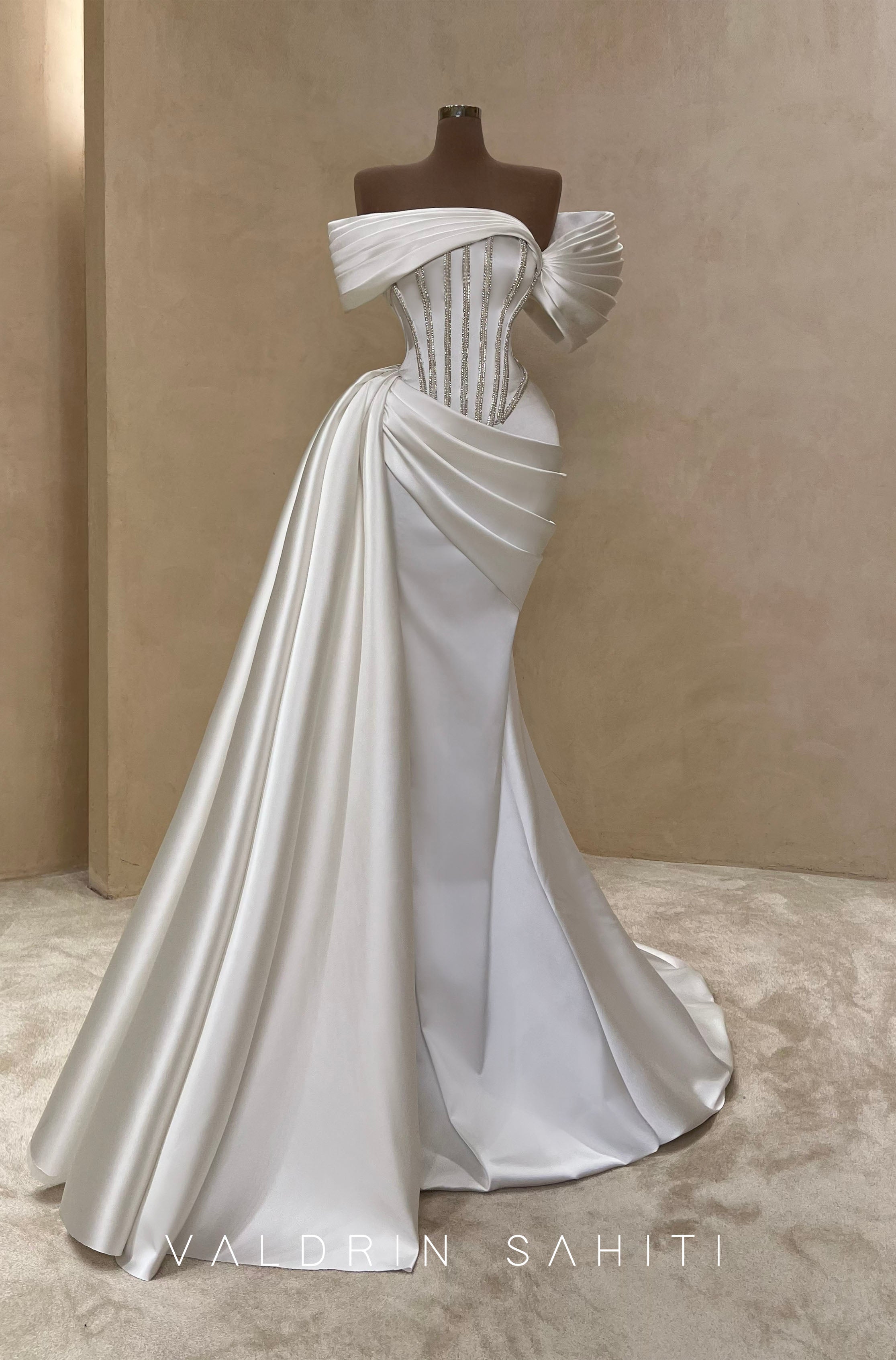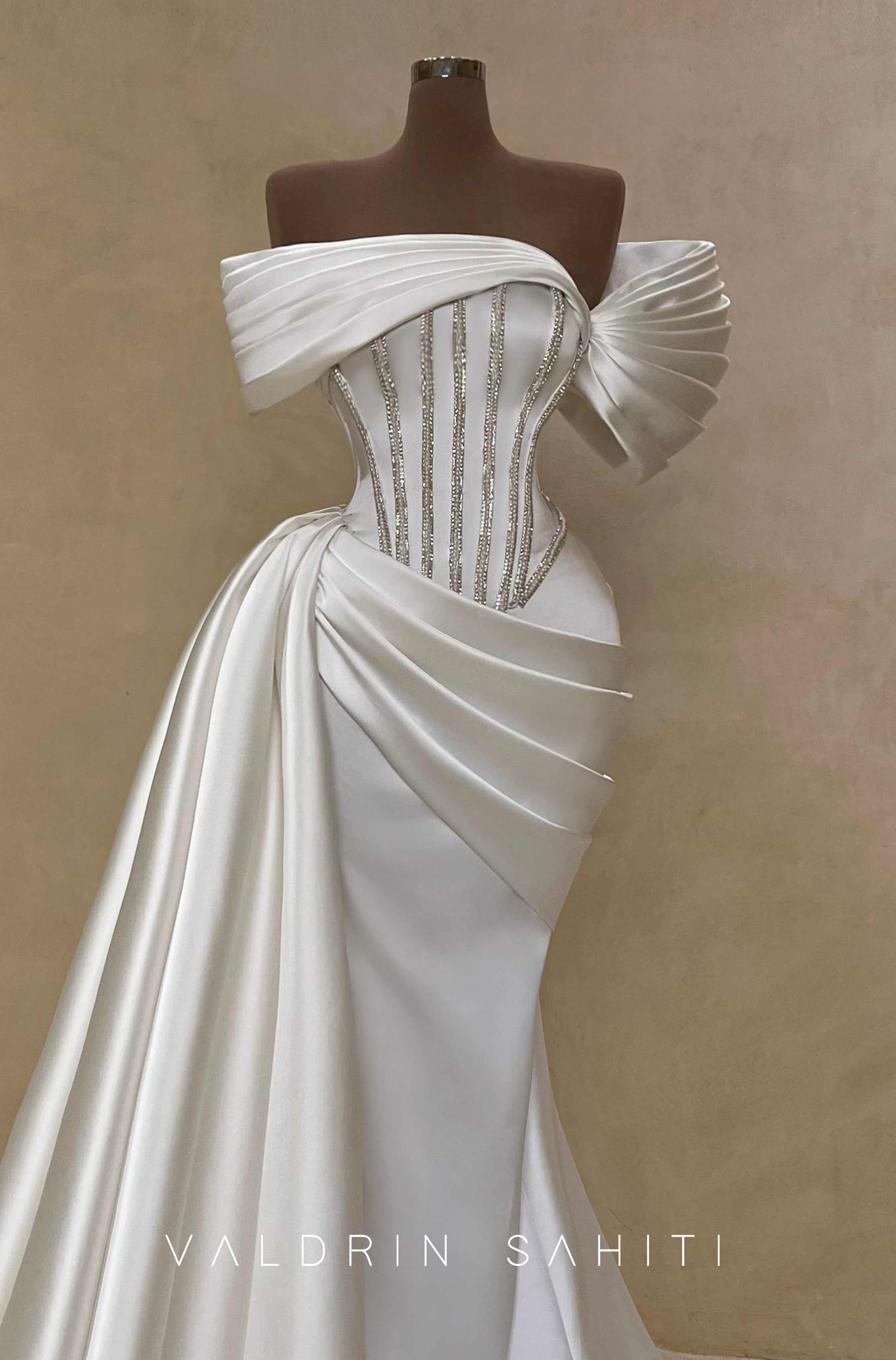 Where timeless bridal charm meets sculptural sophistication — the Sculpted Elegance Gown is designed for the modern bride who desires classic glamour with a high-fashion twist. The corseted bodice, embellished with delicate beading, contours the silhouette to perfection, while the asymmetric off-shoulder neckline and meticulously pleated satin draping elevate the design with architectural grace.