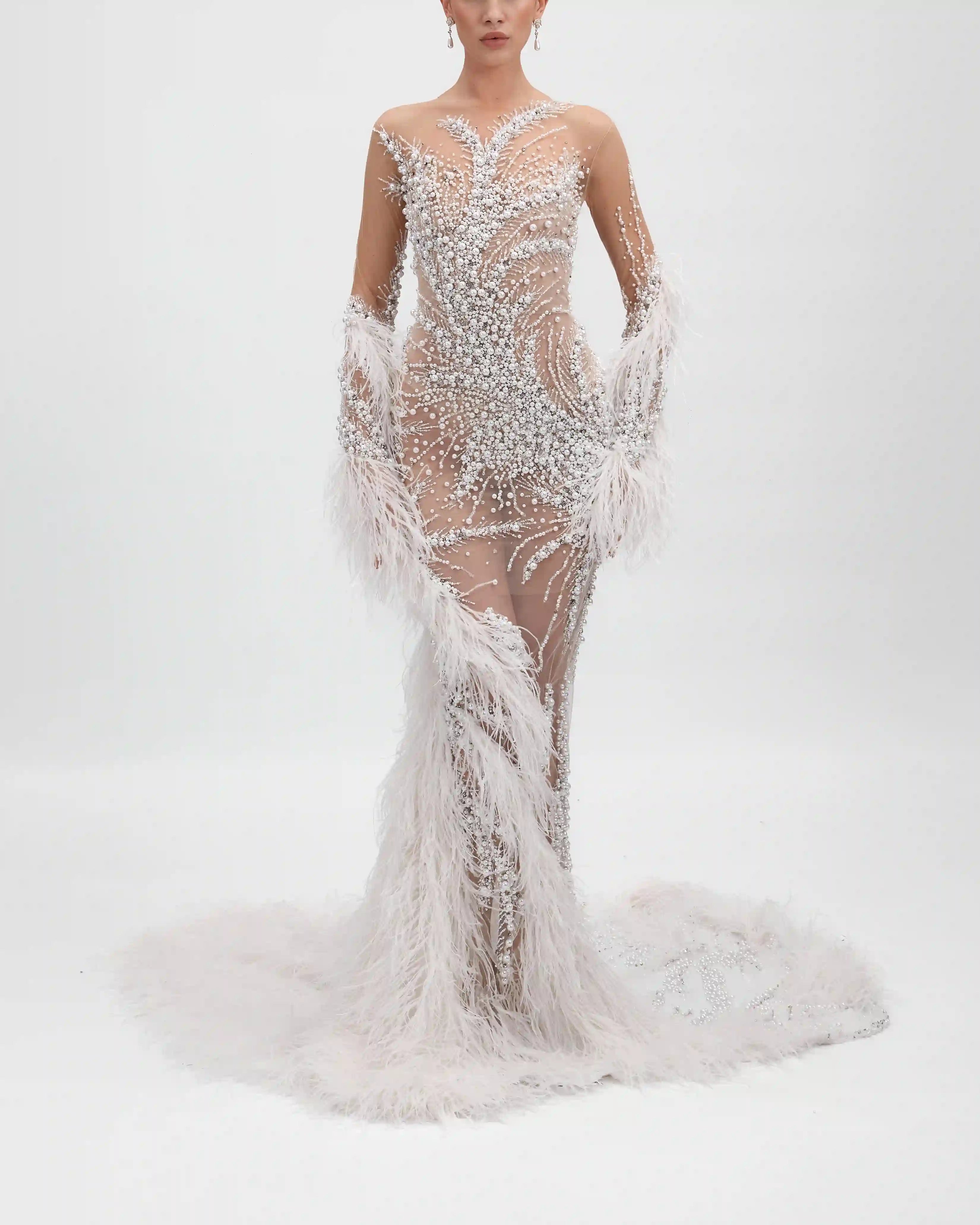 This elegant Bridal IVYENVY '25 - 08 dress features a flowing A-line silhouette crafted from delicate fabrics that drape gracefully, creating a timeless and sophisticated bridal look. The design showcases a subtle yet refined neckline with gentle embellishments that enhance its understated charm. Perfect for brides seeking a classic style with expert craftsmanship and a flattering fit, this gown combines comfort with enduring elegance for a memorable wedding day.