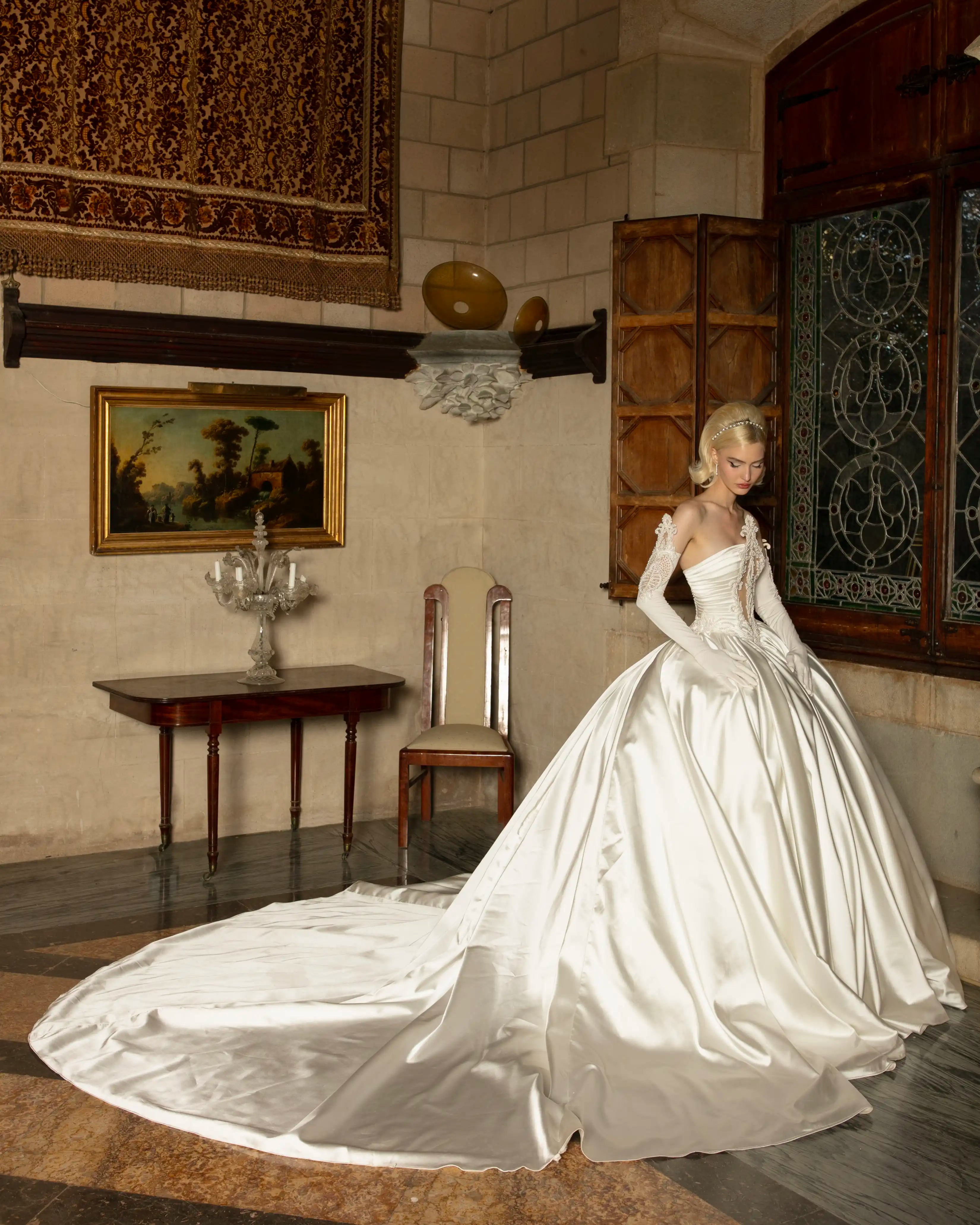 Timeless elegance meets regal drama in this voluminous satin bridal gown. Featuring a structured off-shoulder corset bodice with delicate lace appliqué and sheer sleeves, this dress celebrates femininity and grandeur. The dramatic ballgown skirt, crafted from lustrous satin, flows into a cathedral-length train - perfect for making a statement down the aisle. A fairy-tale look for the bride who dreams in couture.