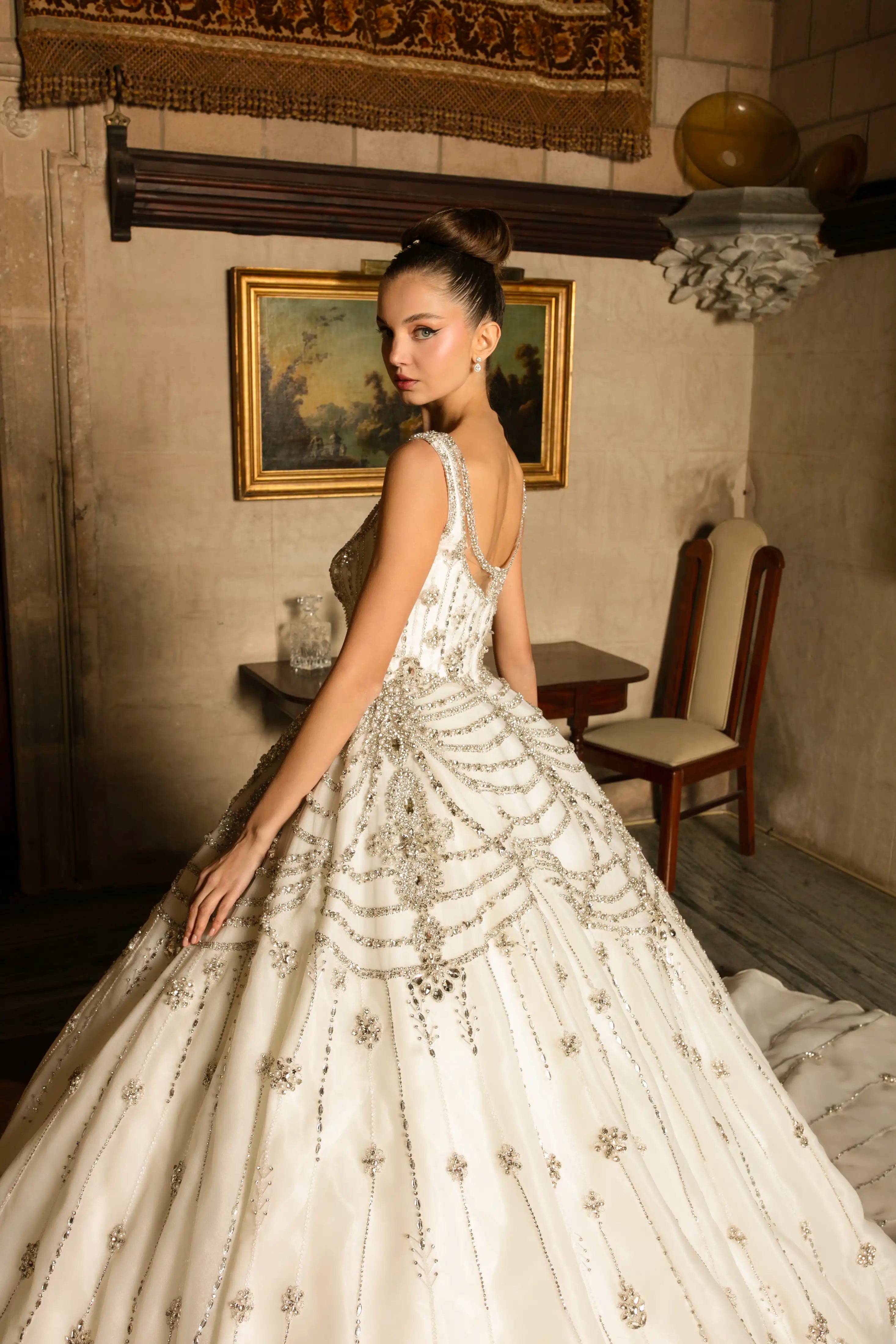 A true work of art, this embellished bridal ballgown is designed for brides who dream in haute couture. Featuring a structured scoop neckline and a fitted bodice, the gown is lavishly adorned with hand-placed crystal beading, embroidery, and sequin detailing. The voluminous tulle skirt adds drama and elegance, while the open back adds a modern edge. Perfect for a grand ballroom wedding or a majestic celebration.