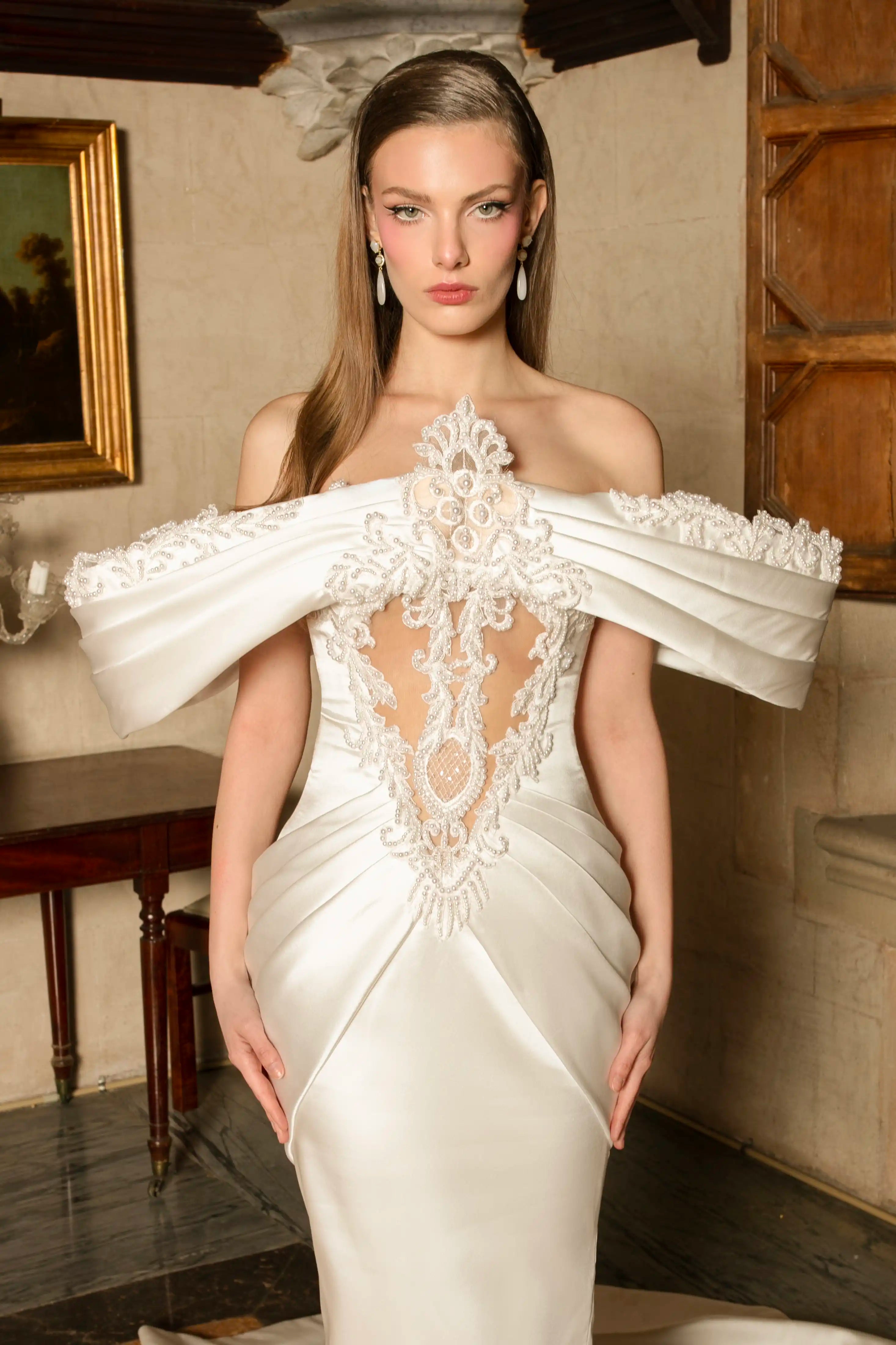 Fierce meets feminine in this sculpted satin bridal gown, crafted for the bride with bold elegance. Featuring an off-shoulder corset bodice with sheer illusion panels and intricate beading, the gown hugs the figure before flaring into a clean, dramatic train. The pleated off-shoulder neckline adds texture and drama, while the structured silhouette ensures a show-stopping entrance. A modern masterpiece for the bride who commands attention.