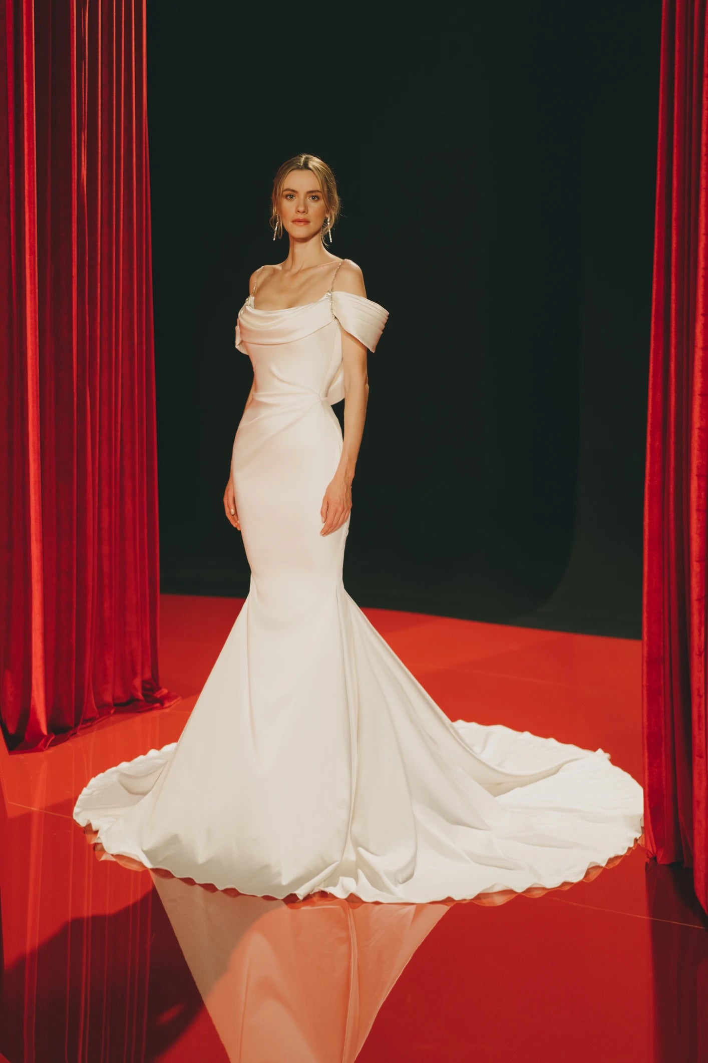 OFF SHOULDERS SILK DRESS, WITH PLEATED SHOULDERS, SILVER CRYSTALS AND STONES.