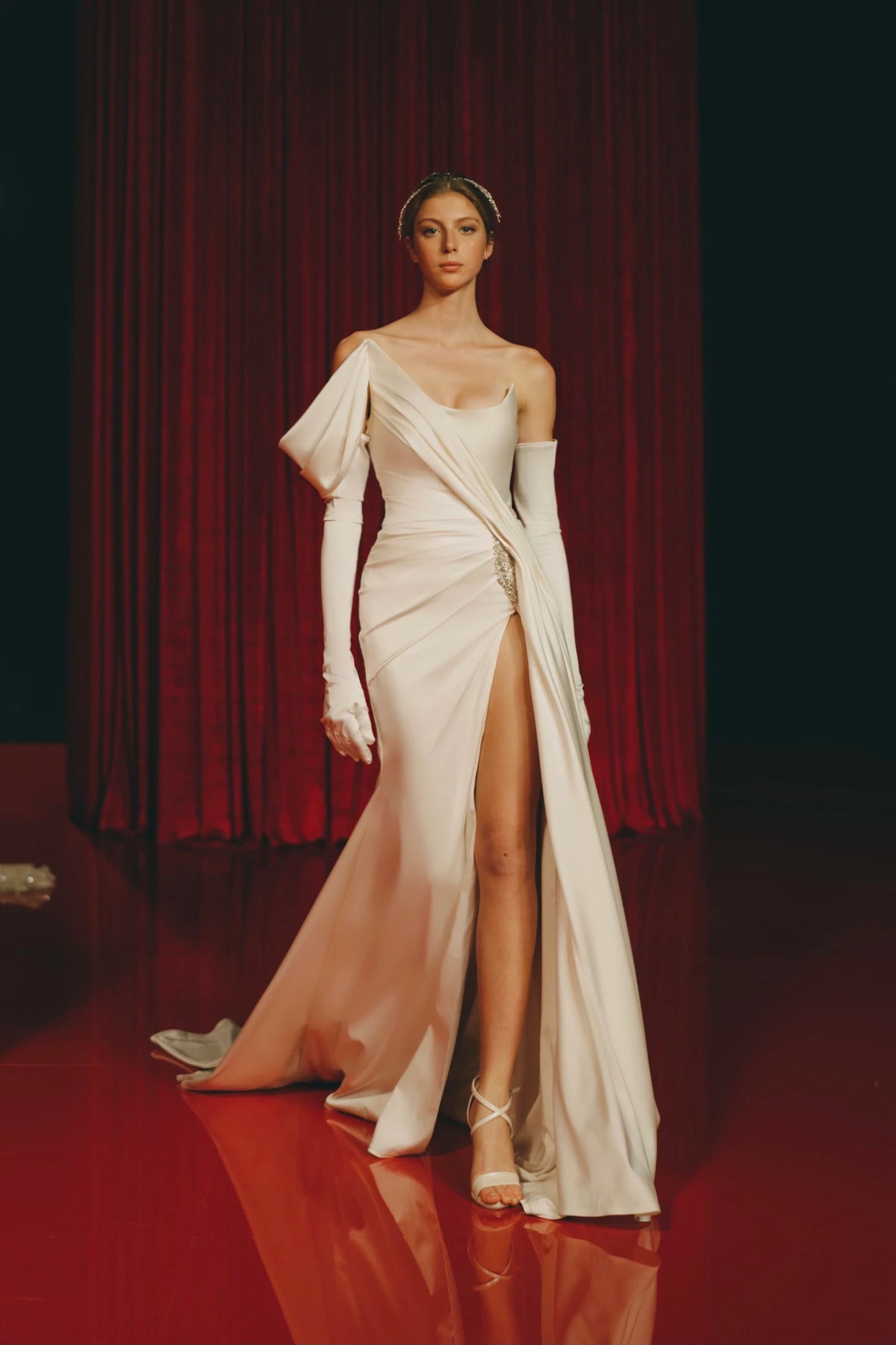 ASYMMETRICAL SILK SCARF, ATTACHED TO ONE SHOULDER, CREATING THE STRUCTURED DETAIL. DRAPED BODICE TO ONE SIDE, WITH A HIGH SLIT, PEARLS AND SEQUINS ATTACHED TO THE DRAPPED BODICE, A LONG TRAIN AND SILK GLOVES.