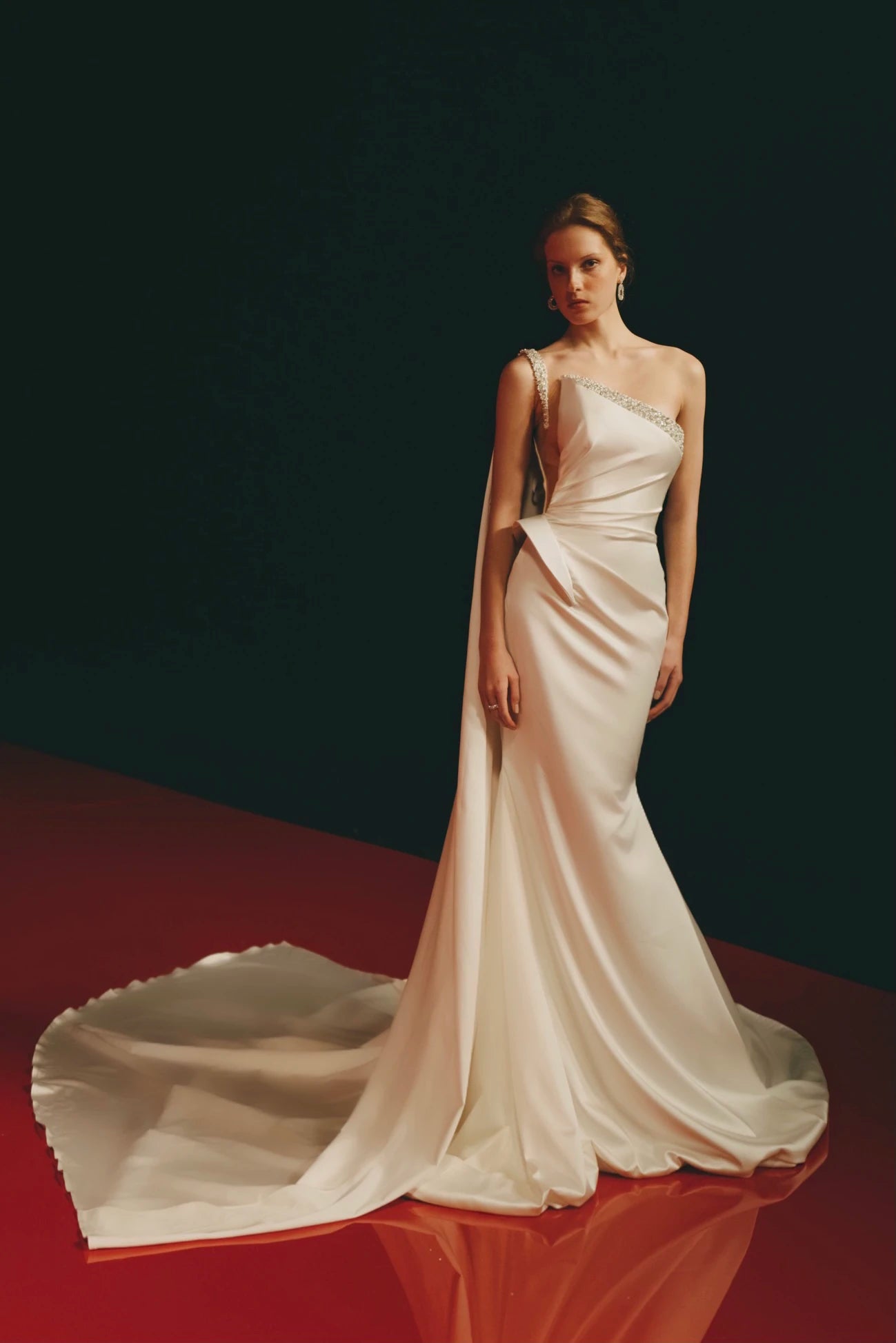 ASYMMETRICAL ONE SHOULDER SILK DRESS, DETAILED WITH SILVER CRYSTALS AND STONES, NUDE MESH CUT-OUT ON THE SIDE WITH OVERLAP DRAPING, HOLDED ONTO THE STRUCTURED DETAIL AND A LONG CAPE ATTACHED TO ONE SHOULDER STRAP.