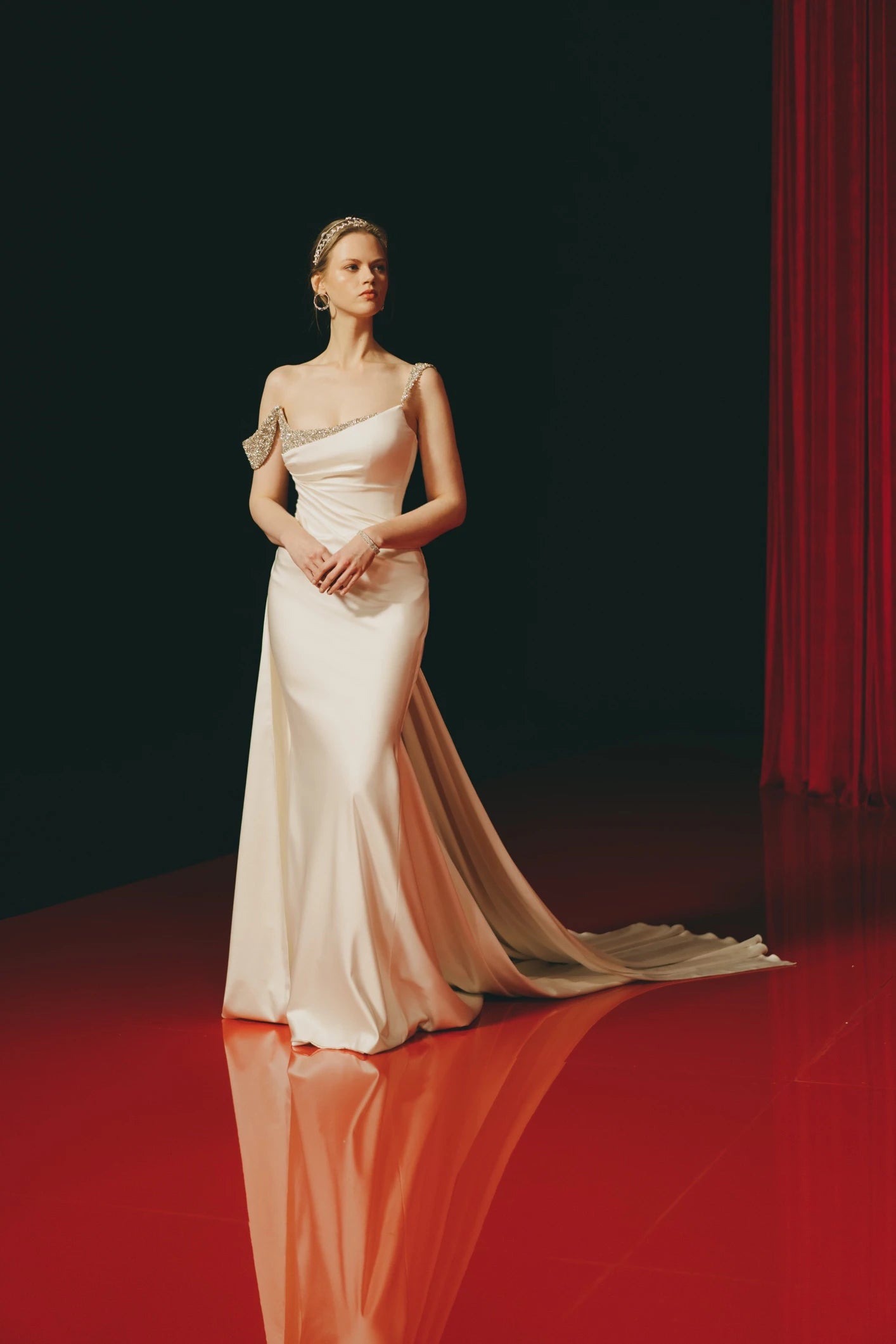 ONE SHOULDER DETAIL WITH SILVER CRYSTALS AND STONES, OFF SHOULDER SILK DRESS WITH DRAPED BODICE ON THE SIDE AND A LONG TRAIN.