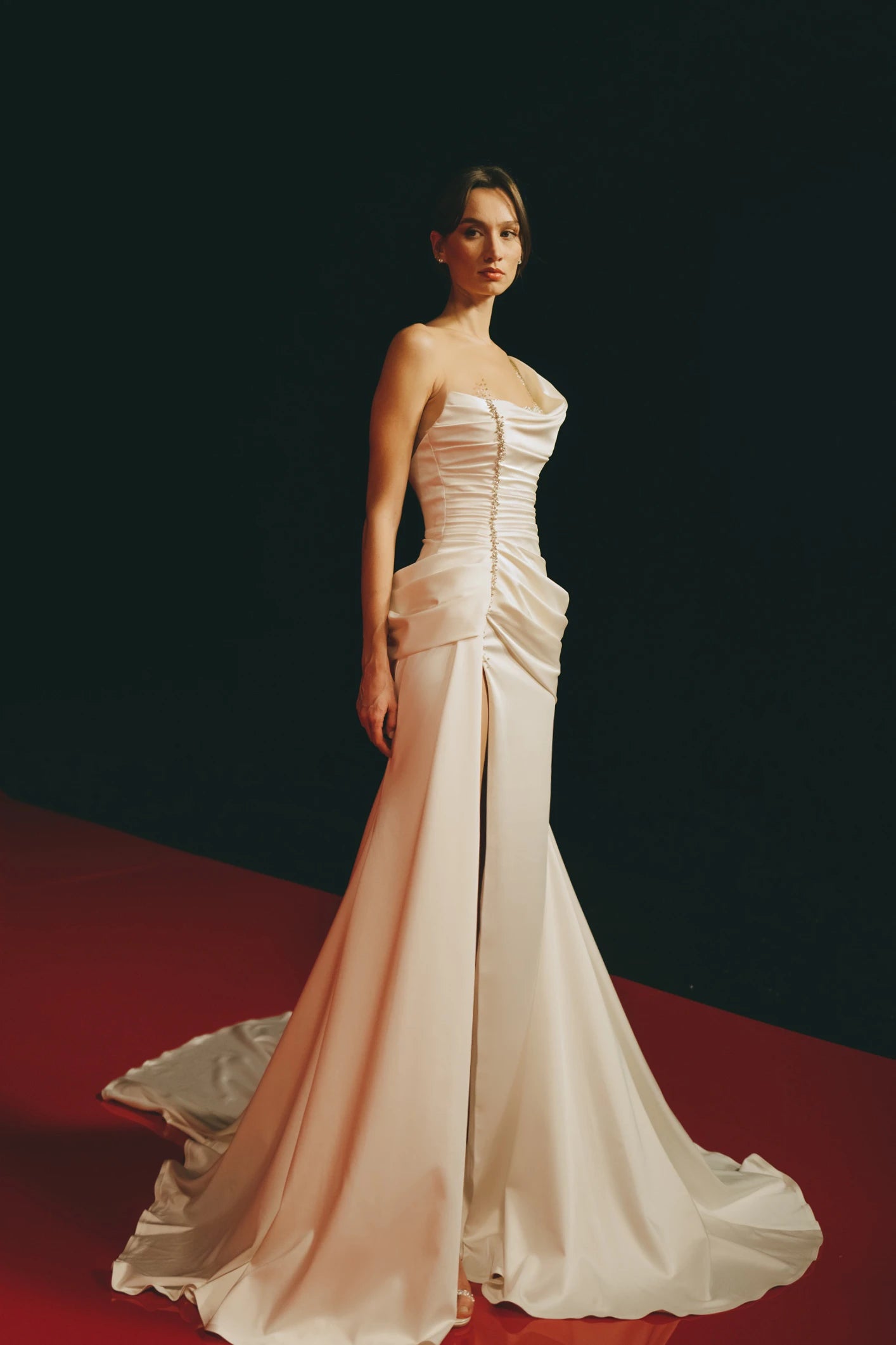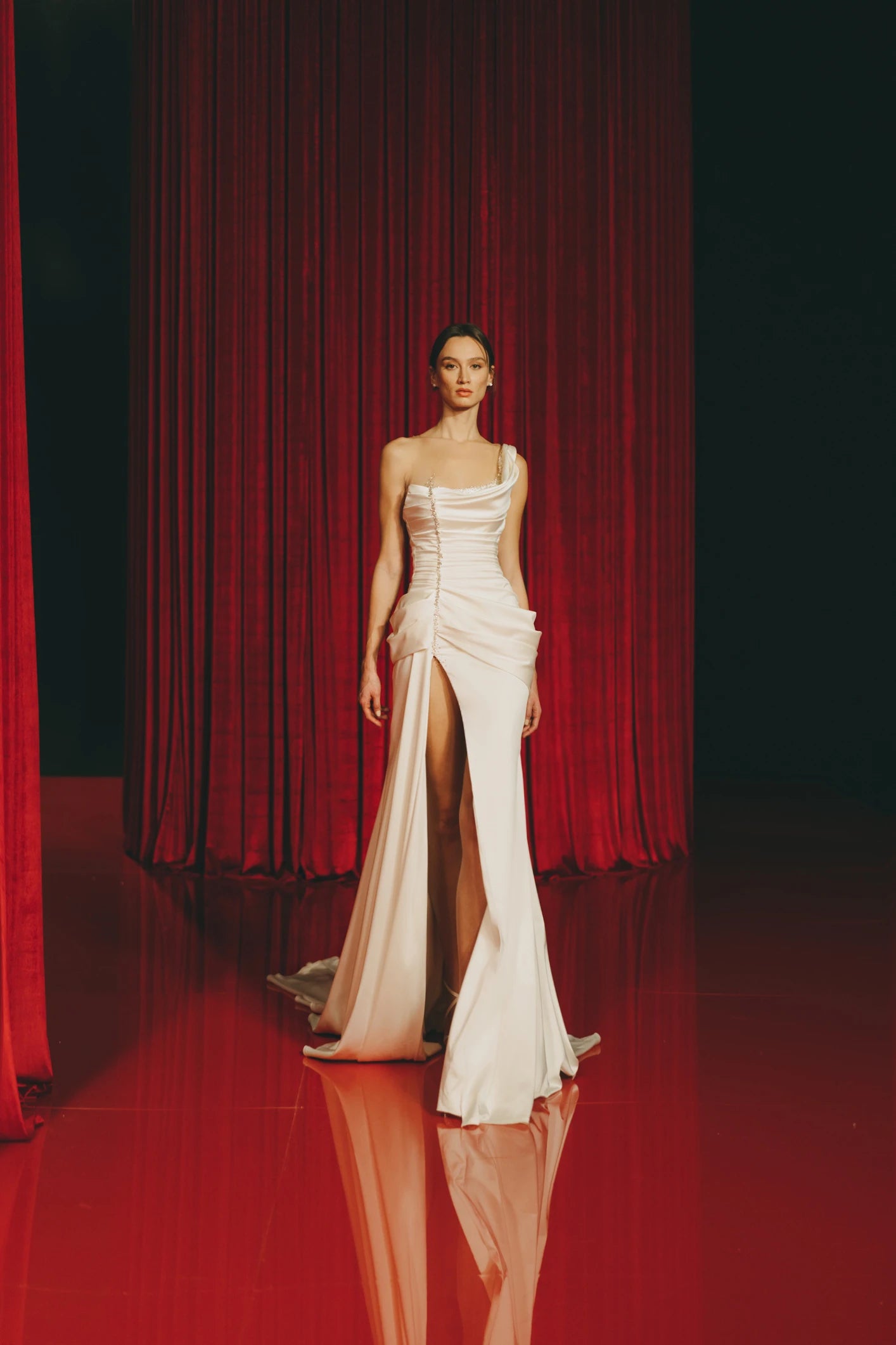 DRAPED SILK BODICE WITH ONE STRAP, DETAILED WITH SILVER CRYSTALS AND STONES ON THE SIDE AND A HIGH-THIGH SLIT WITH LONG TRAIN.