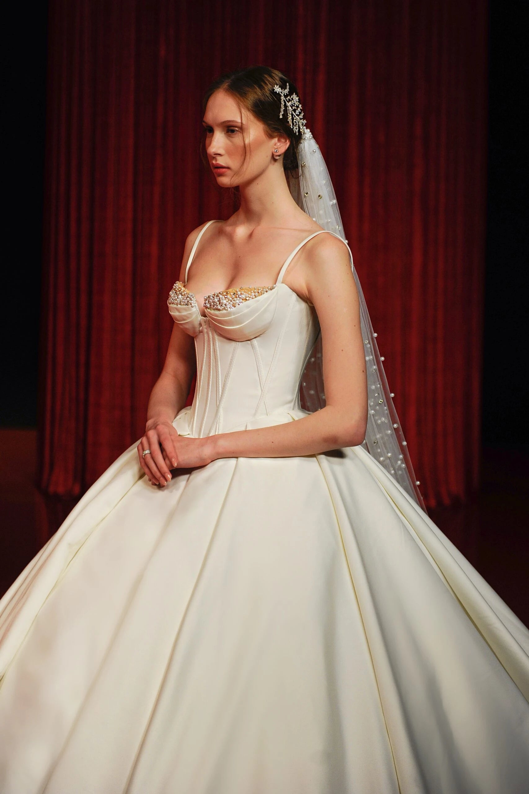 OFF SHOULDERS SILK GOWN, DEEP V DRAPED BODICE, WITH PEARL DETAILS, CASCADING ONTO THE WAIST, WITH A LONG TRAIN.