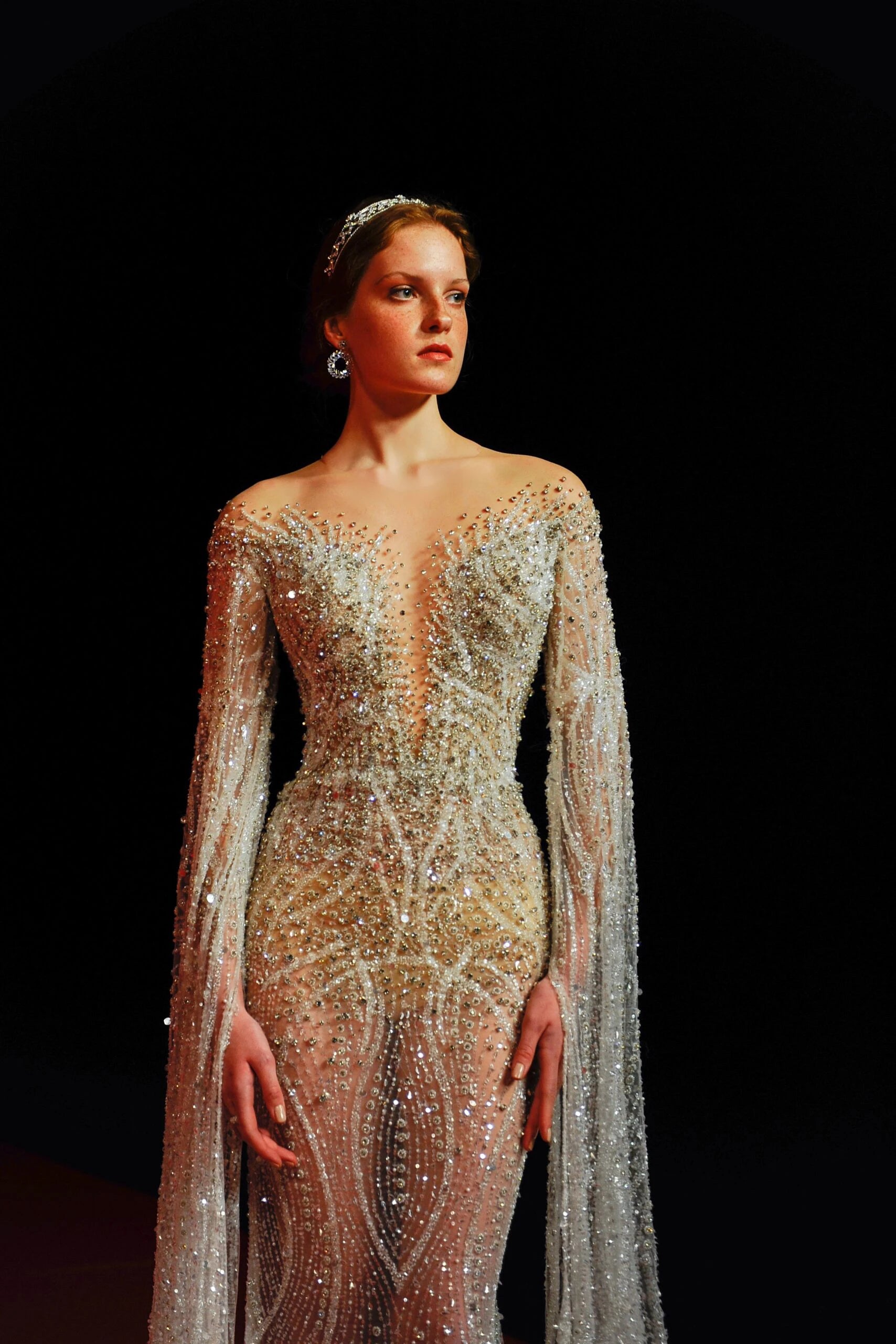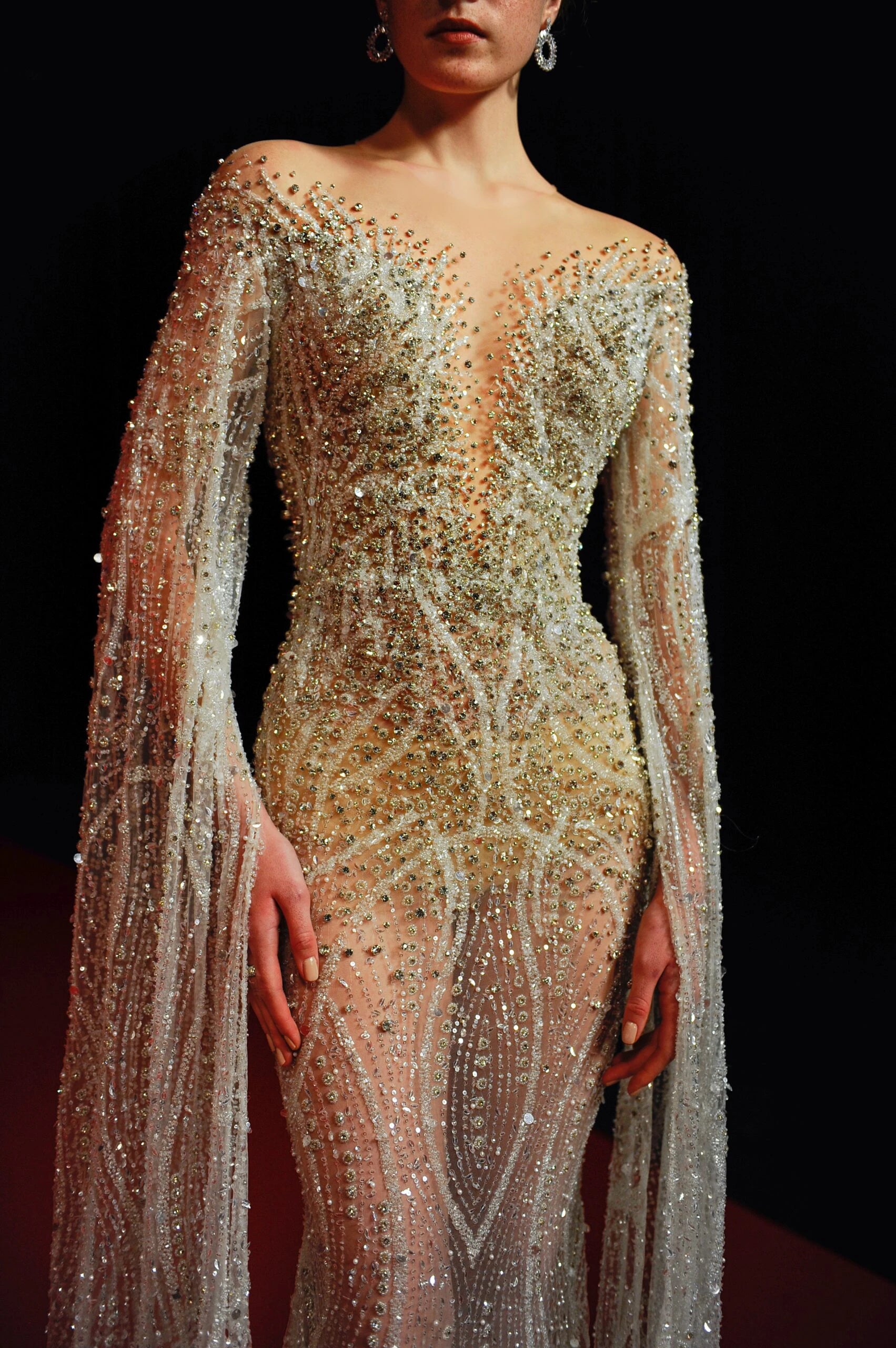 LONG SLEEVED CAPE GOWN, EMBROIDERED WITH SILVER SEQUINS, BEADS AND STONES. DEEP V SHAPED BODICE WITH A NUDE MESH ON THE BACK, WITH WHITE BUTTONS ATTACHED.