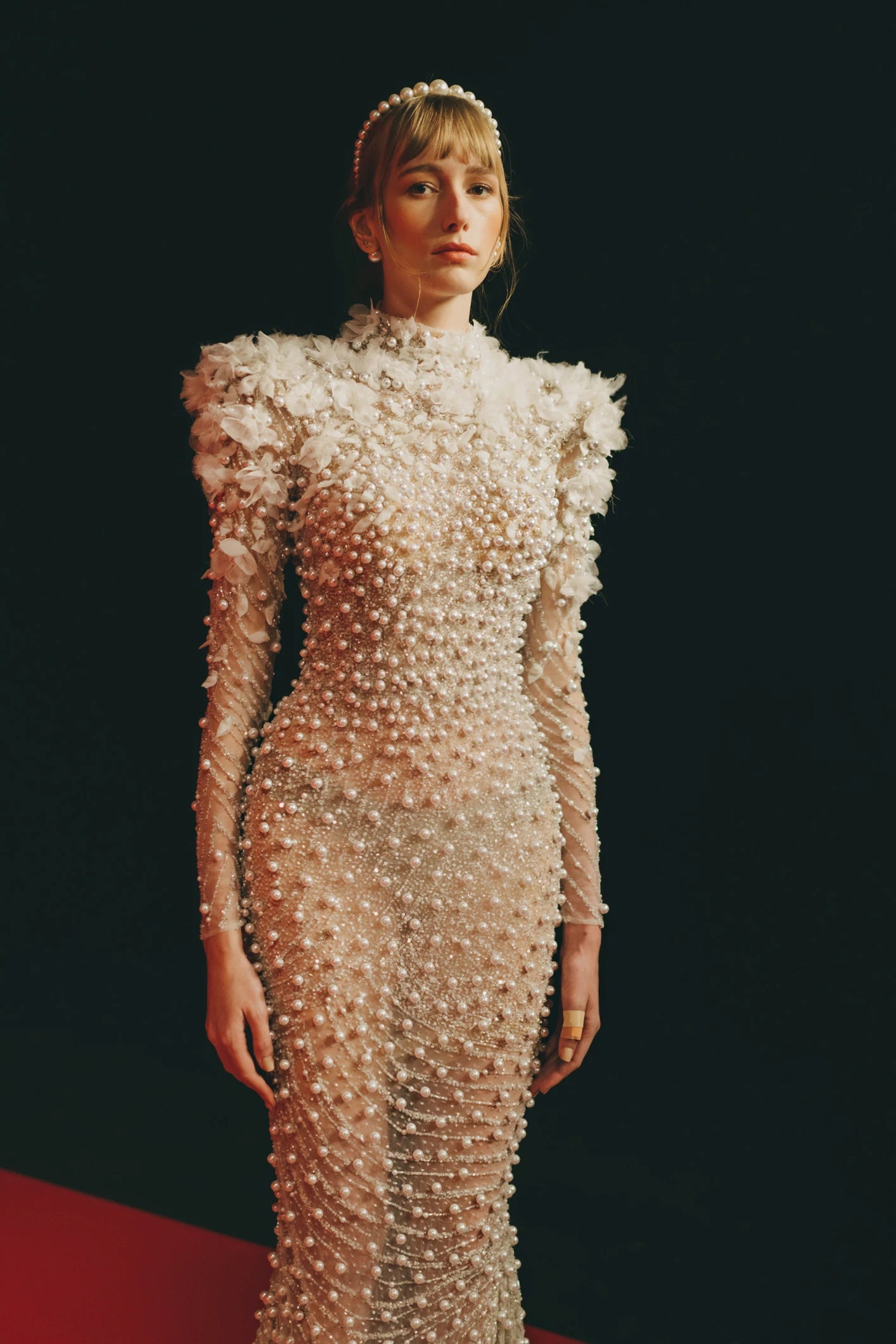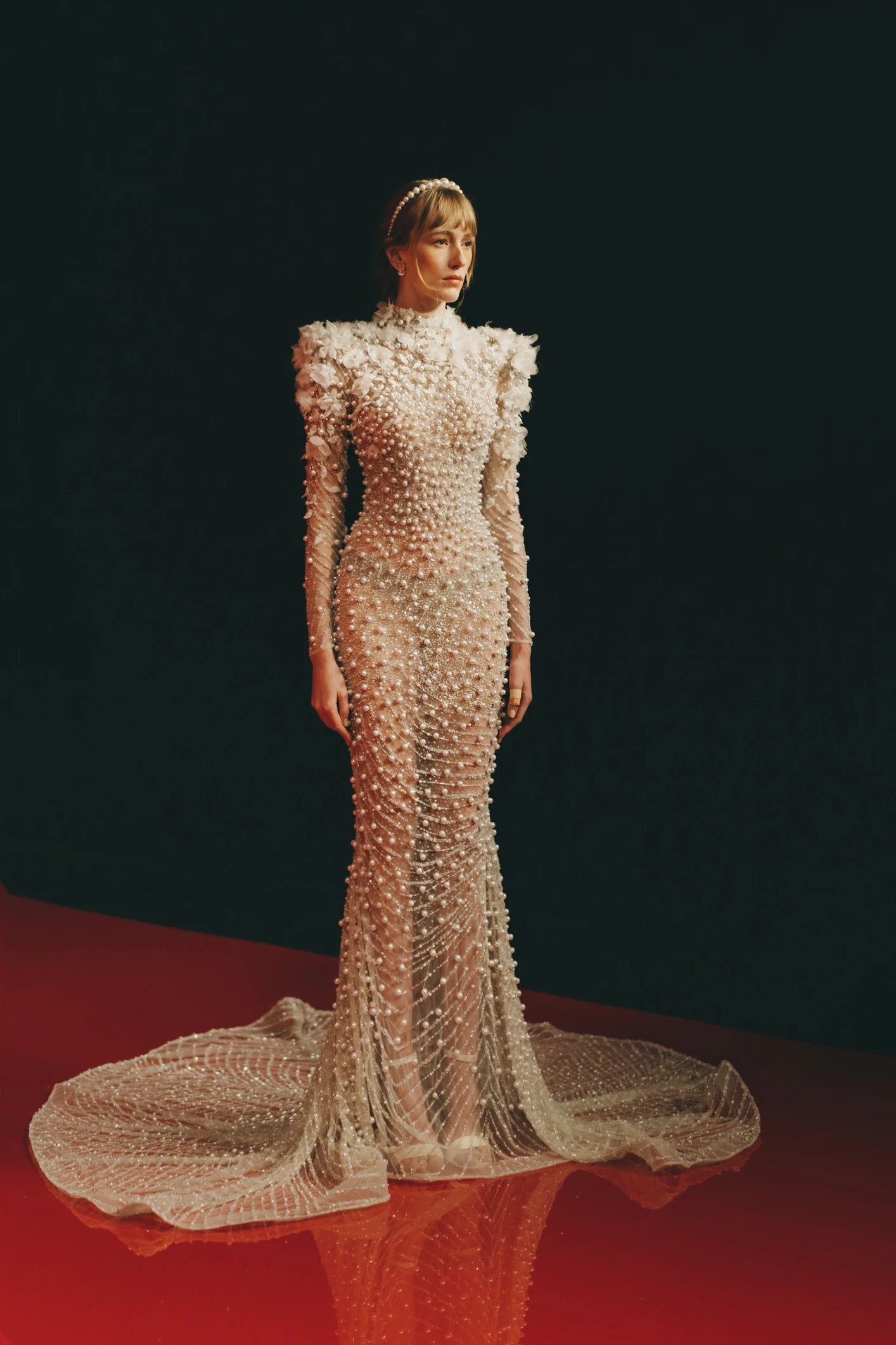 LONG STRUCTURED SLEEVED DRESS WITH 3D FLORAL, EMBROIDERED WITH BEADS AND PEARLS, CASCADING ONTO THE DRESS AND A LONG TRAIN.