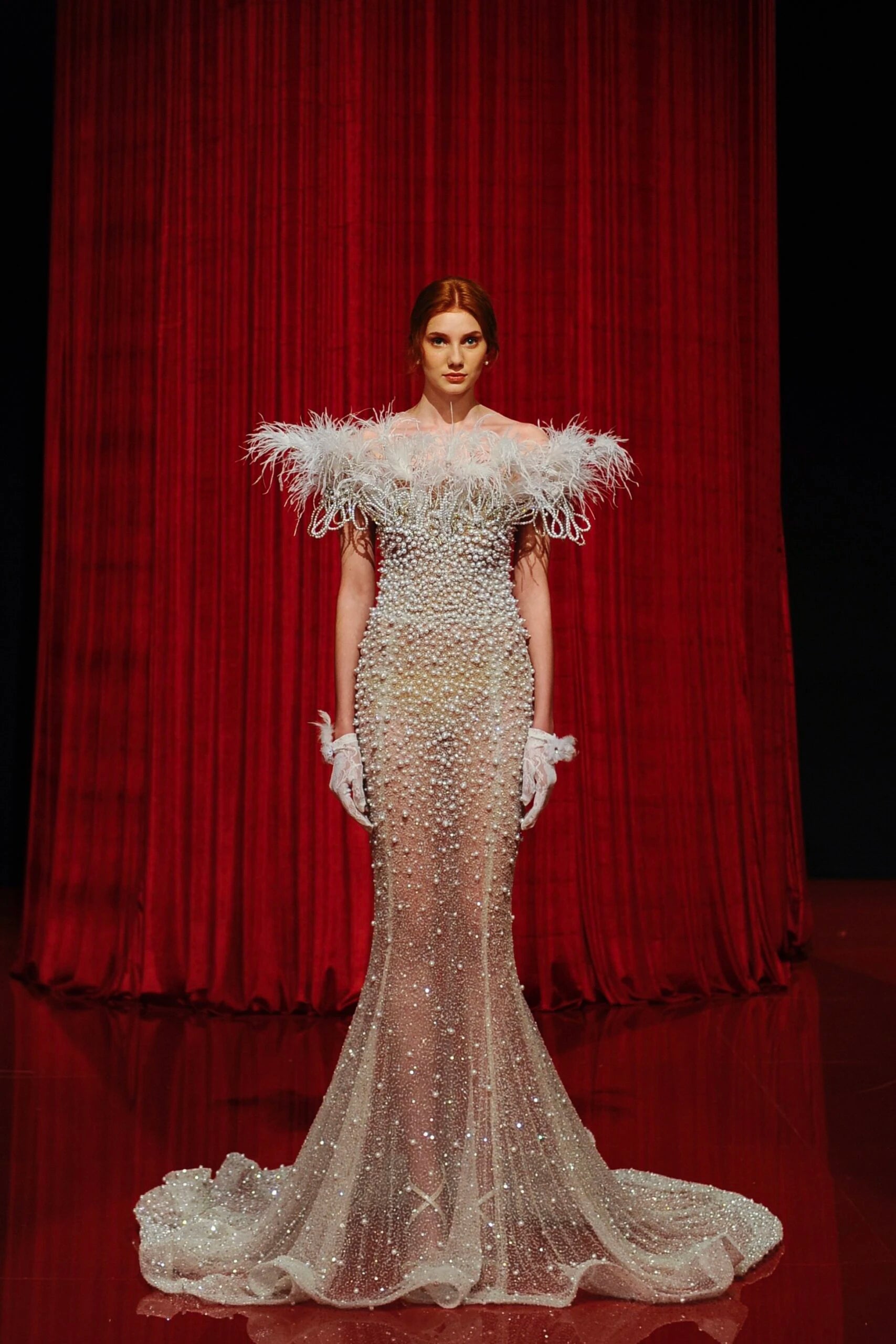 OFF SHOULDERED MERMAID SHAPED DRESS, WITH FEATHERS AND PEARLS EMBROIDERY, CASCADING ONTO THE SKIRT AND A LONG TRAIN ON THE BACK.