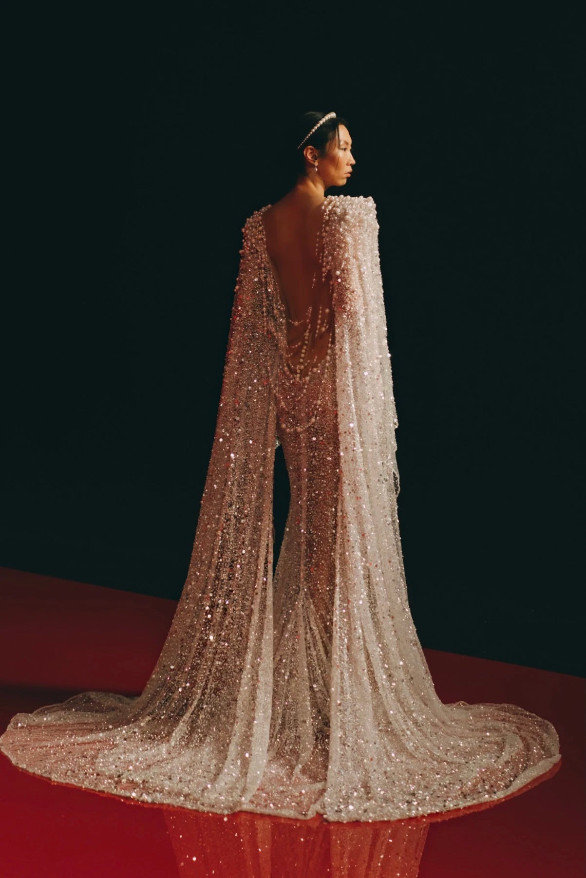LONG CAPE FULLY EMBROIDERED IN IVORY SEQUINS AND PEARLS, WITH SILK THREADS, MERMAID SHAPED DRESS, WITH A DEEP V SHAPED FRONT AND BACK AND A LONG TRAIN.