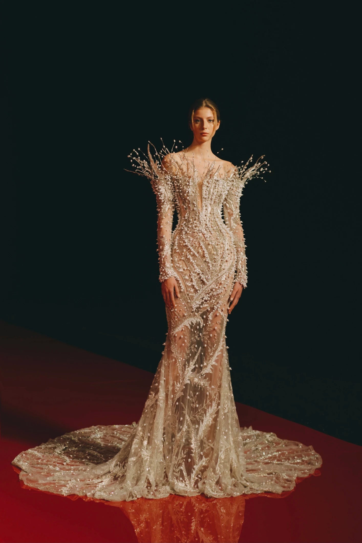 OFF SHOULDERS MERMAID SHAPED DRESS WITH PEARLS AND SILVER SEQUINS, FULLY EMBRORDERED WITH SILK THREADS AND 3D DETAILS ON THE UPPER PART.