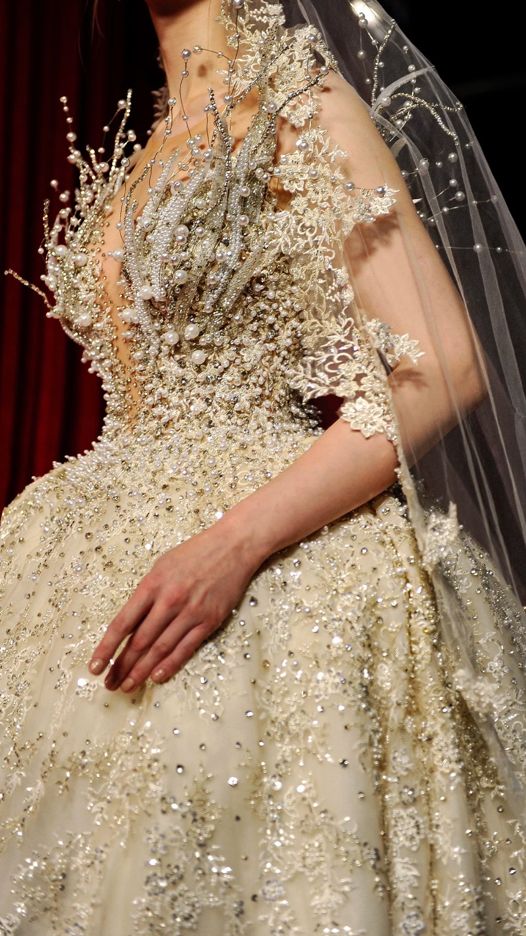 DEEP V-NECK HEART SHAPED GOWN, FULLY EMBROIDERED IN SILK THREADS, WITH PEARLS AND FLORAL LACE, WITH SILVER BEADS. 3D DETAILS AND A LONG TRAIN.