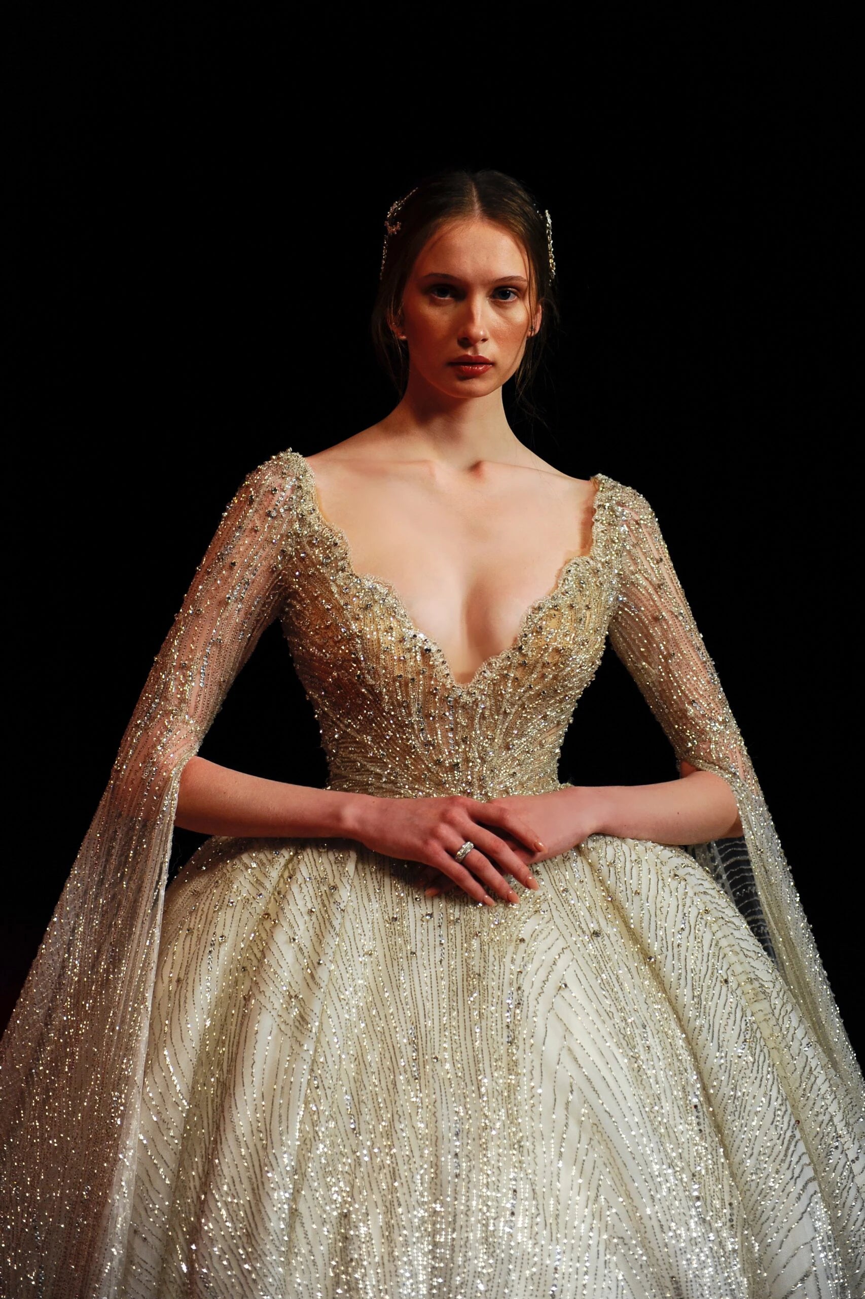 DEEP V SHAPED GOWN FRONT AND BACK, WITH LONG CAPE SHOULDERS AND A LONG TRAIN. EMBROIDERED WITH SILVER SEQUINS, CRYSTALS AND BEADS.
