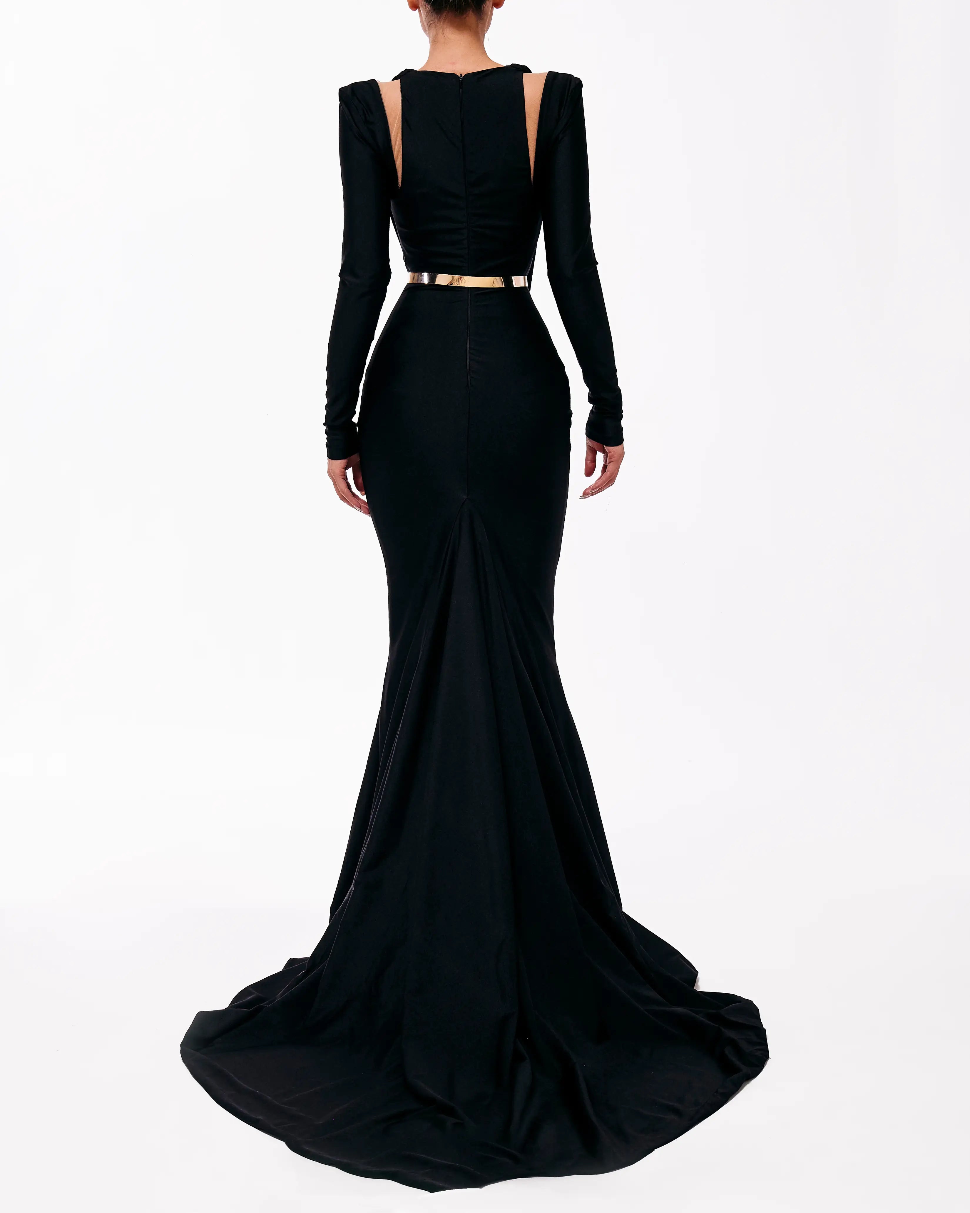 Ultra-Deep V-Neck Black Dress with Long Sleeves, Cut-Outs, and Gold Accent Metal Pieces
