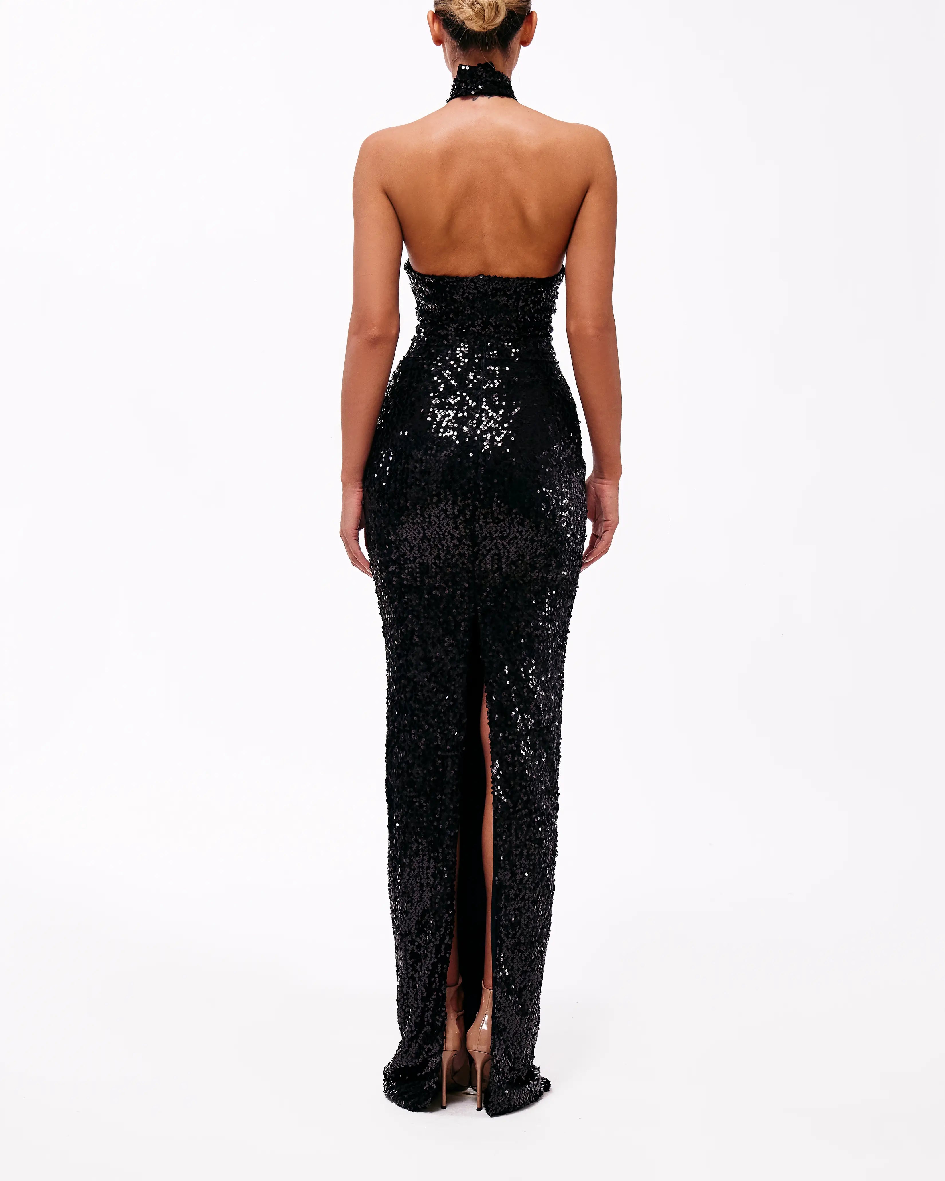 Halter Top Black Sequin Dress with Chest and Midriff Cut-Outs
