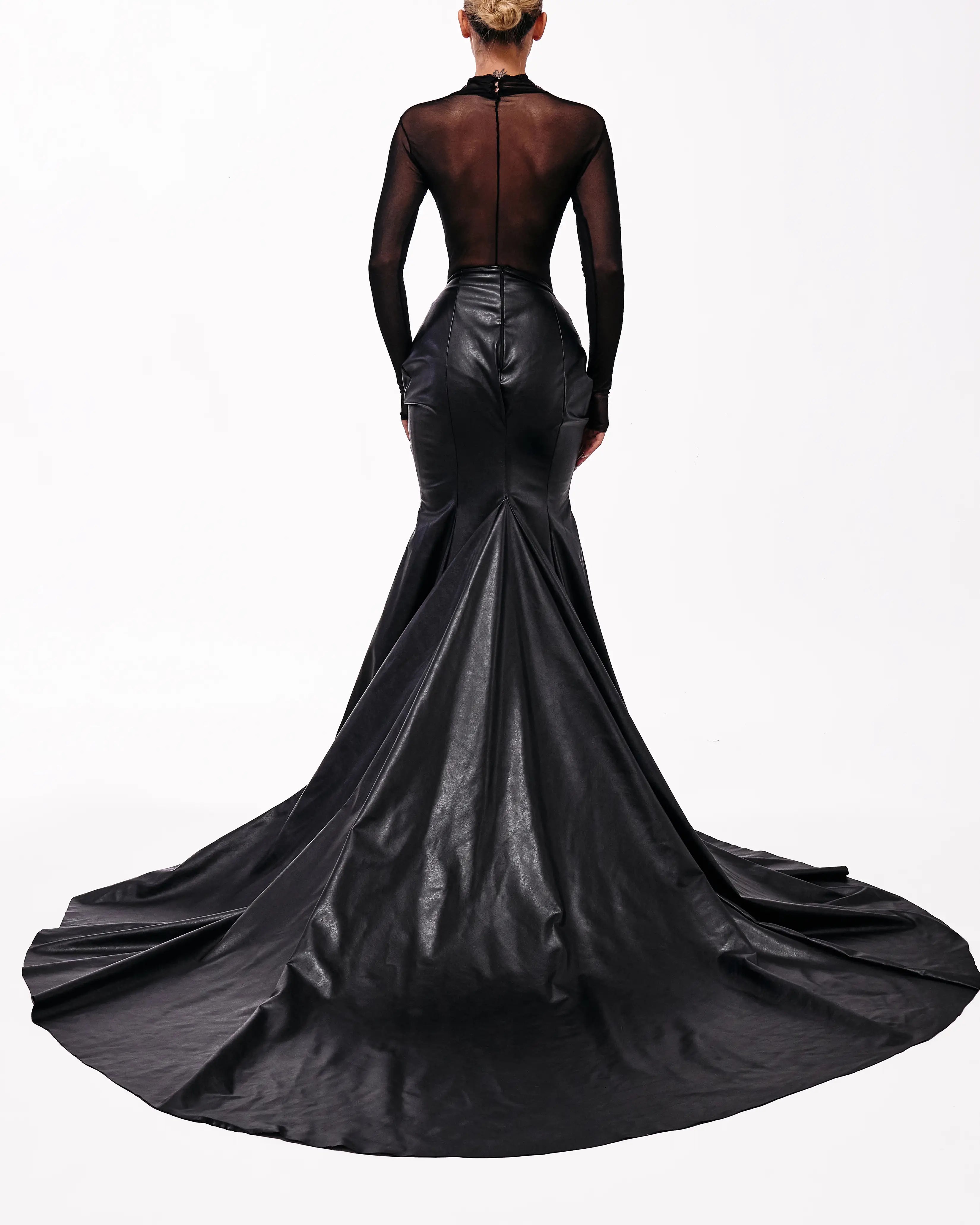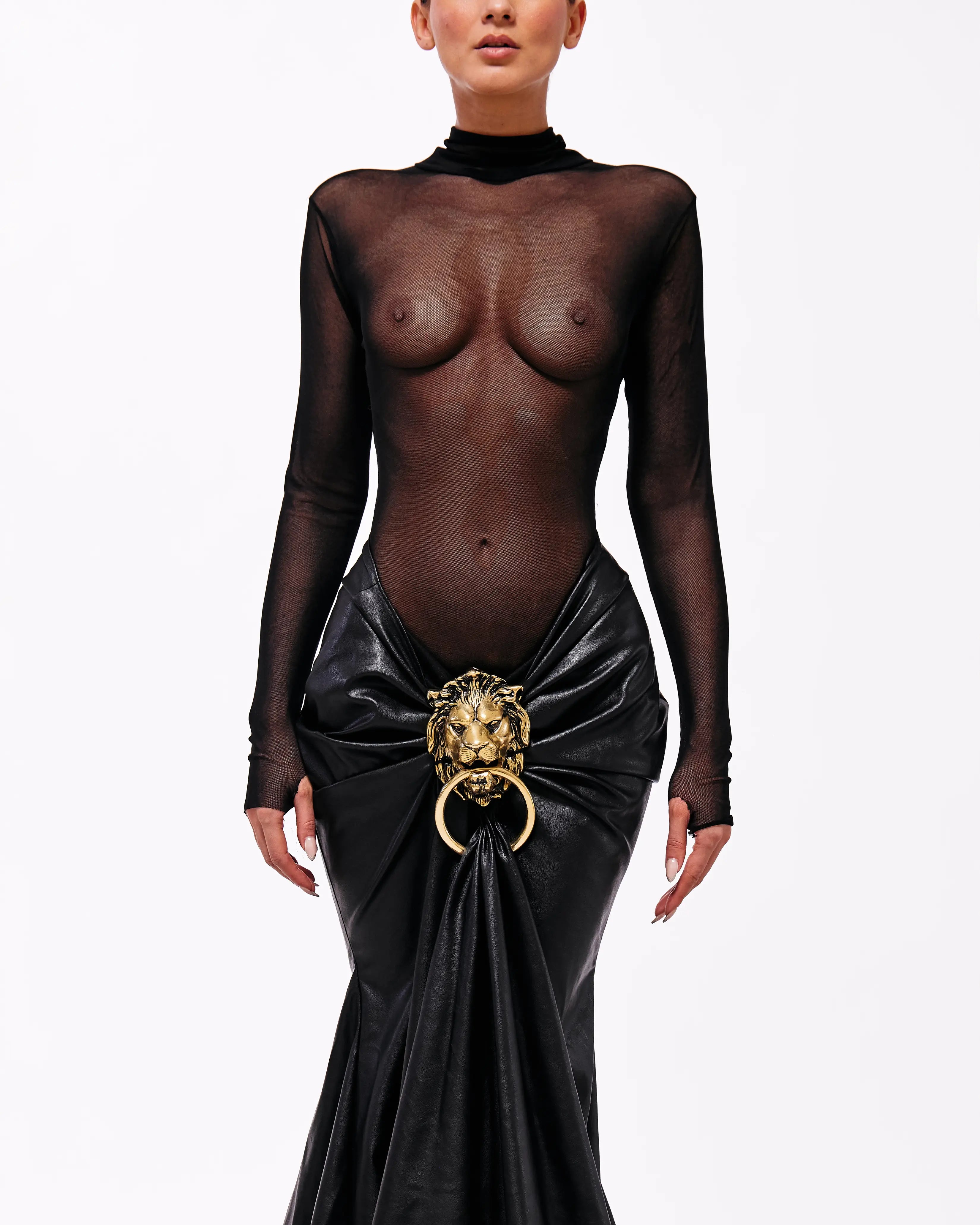 Long Sleeve Transparent Black Tulle Dress with Gold Lion Chain Detail and Leather Skirt