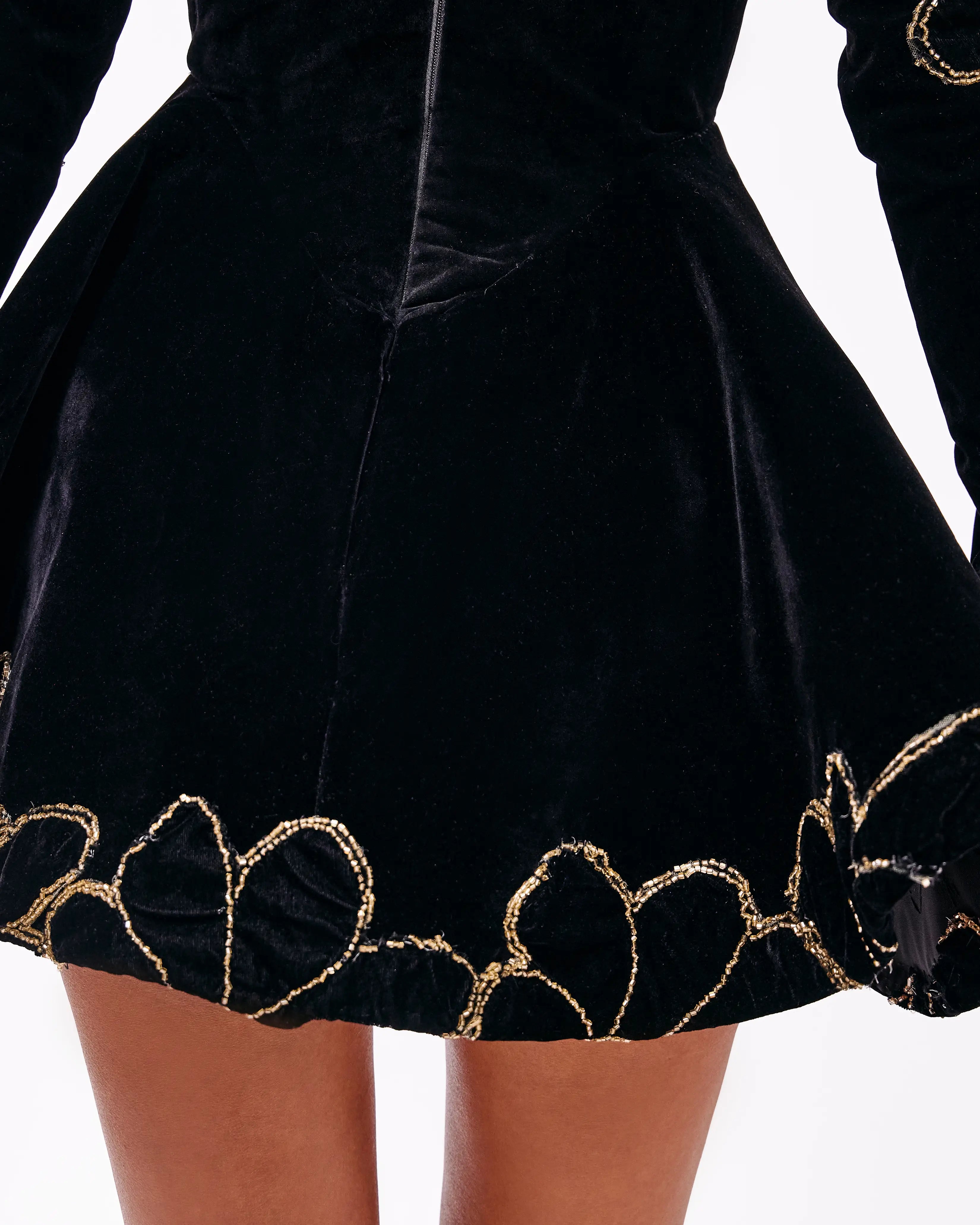 Off-The-Shoulder Asymmetrical Top Black Velvet Dress with Voluminous Skirt and Gloves, including Silver and Gold Rhinestones