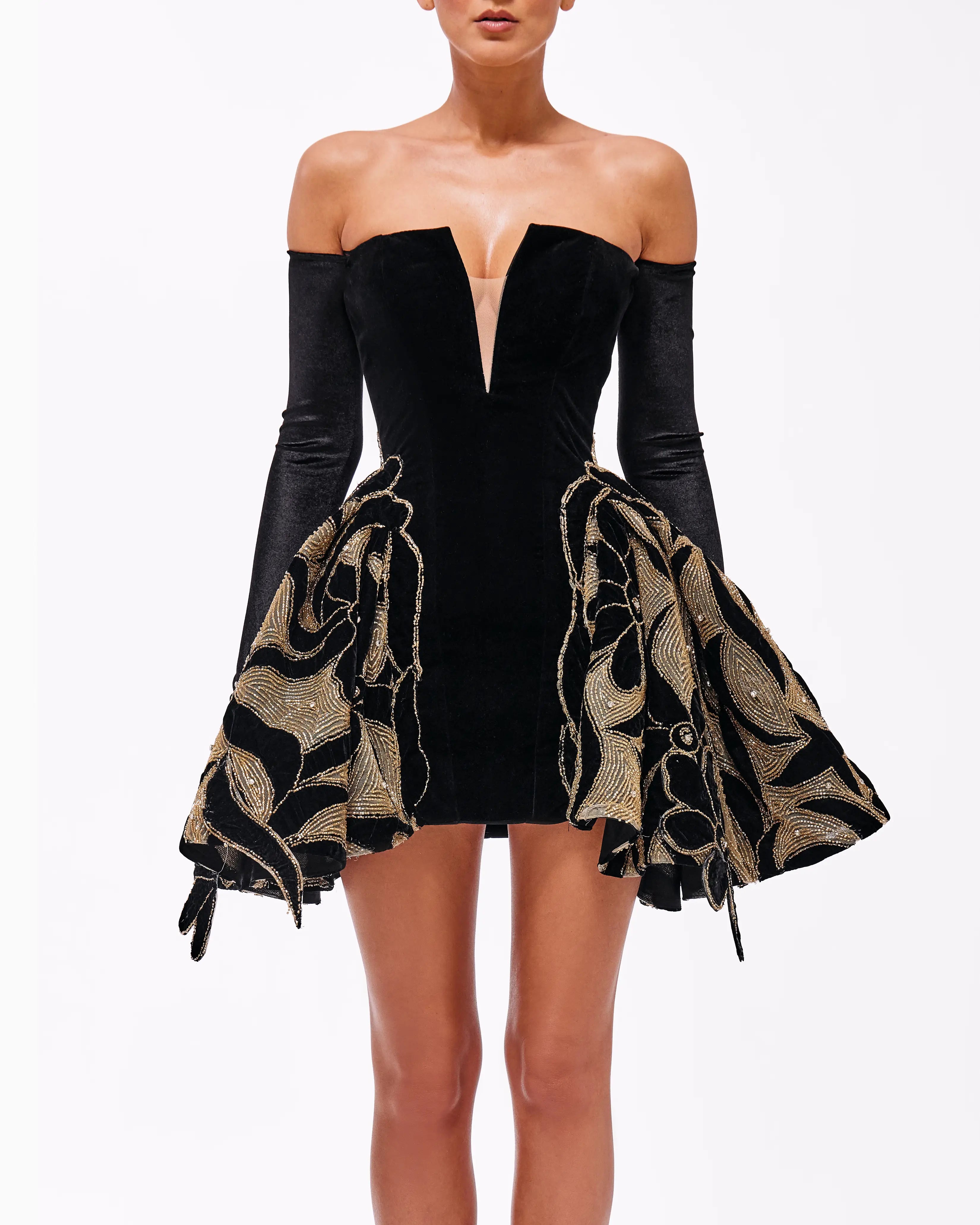 Off-The-Shoulder Black Velvet Dress with Voluminous Skirt, including Silver and Gold Rhinestone Embellishments