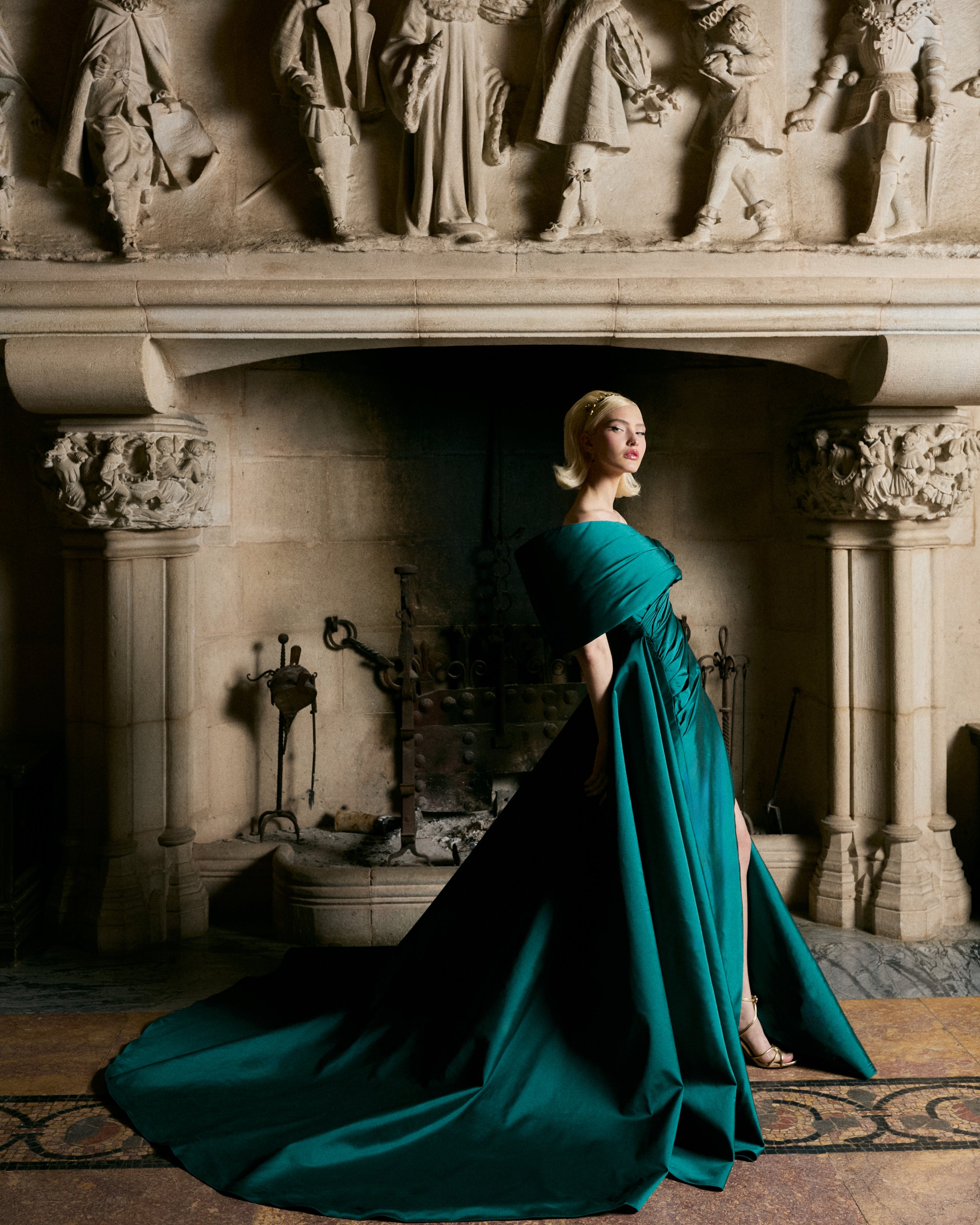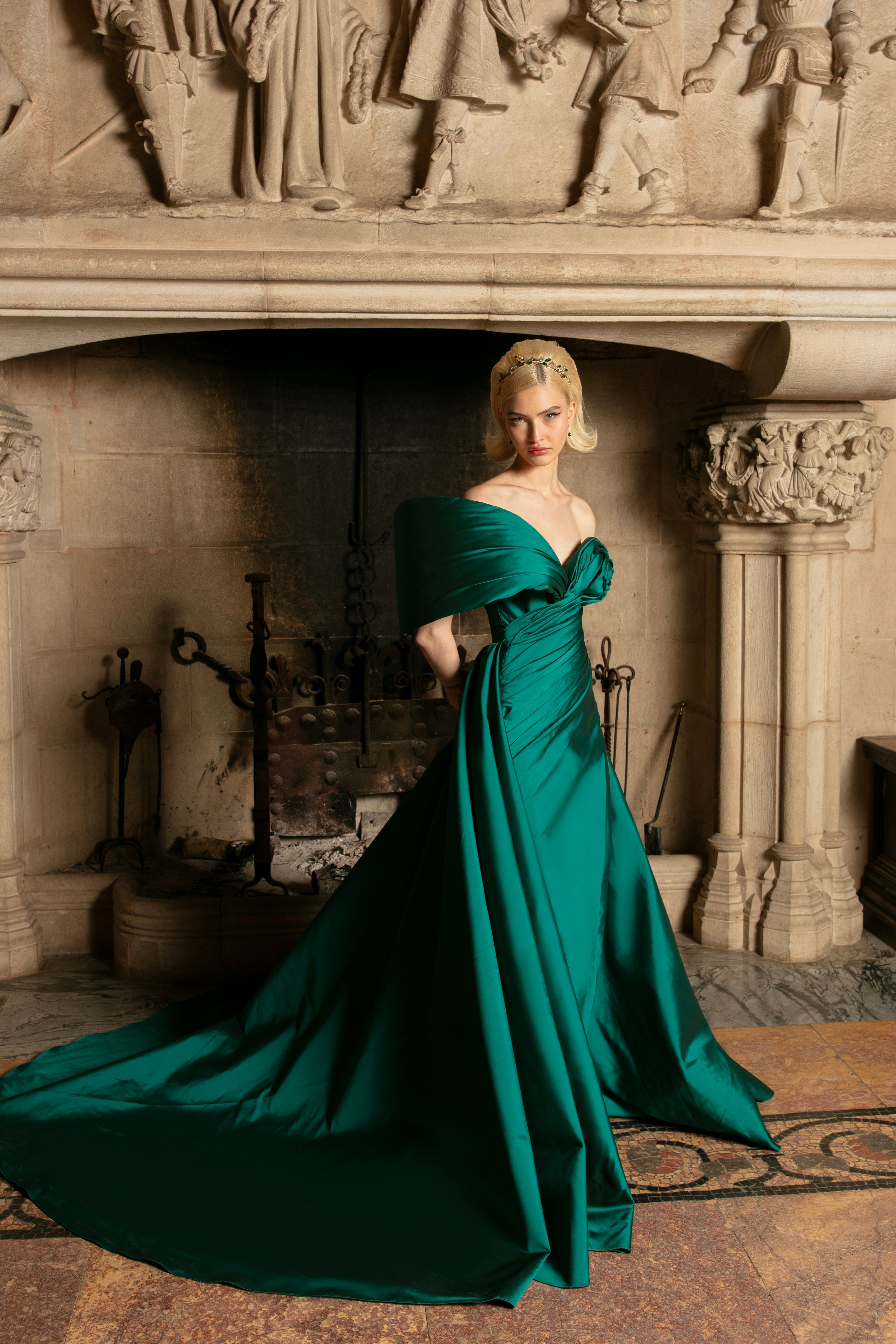 A sculptural masterpiece in emerald taffeta, this gown is defined by its artful draping and one-shoulder silhouette. The fluid lines gather into a bold fold detail, while a subtle slit reveals just enough movement and allure. A timeless fusion of drama and grace, tailored for modern evening opulence.