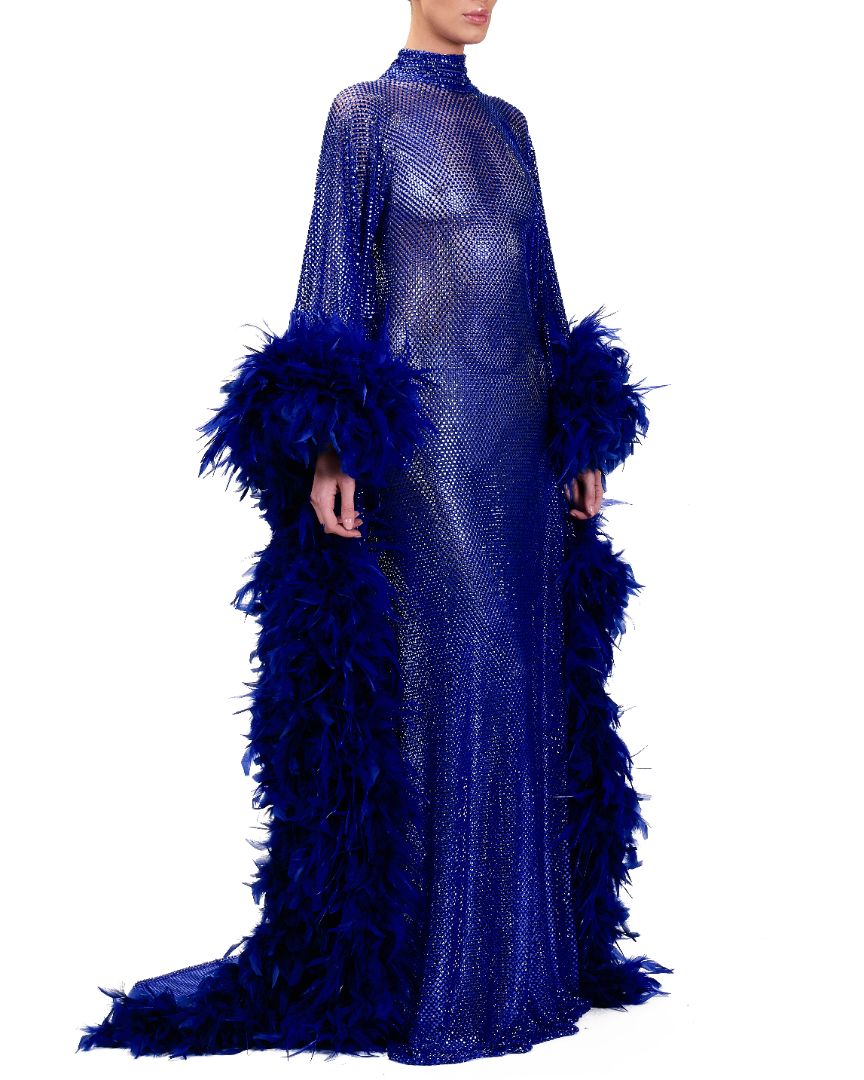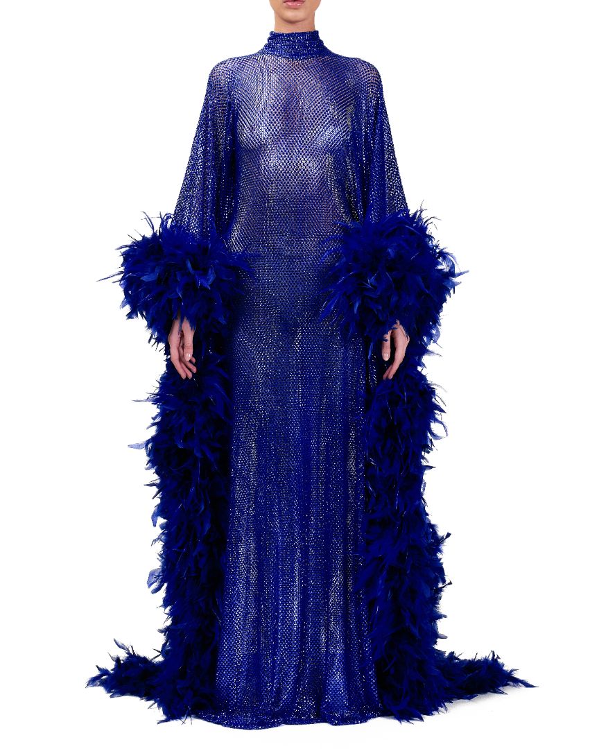 - Full-length sheer gown in metallic cobalt mesh with fluid drape