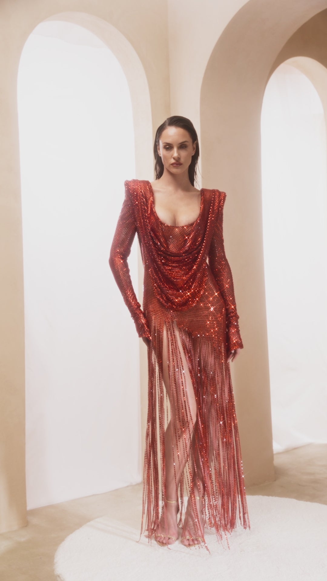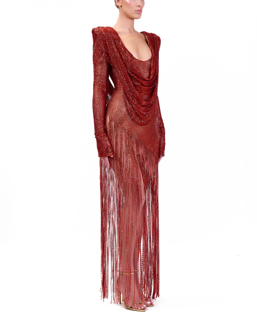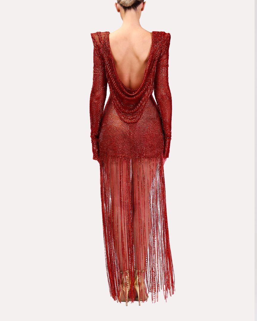This elegant red dress features a scoop neckline and structured shoulders, offering a polished silhouette. Long sleeves provide coverage and sophistication, while the fringed skirt adds movement and a touch of playful texture, making it perfect for standout occasions.
