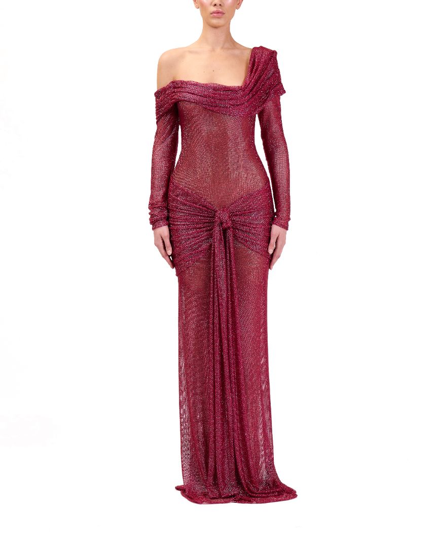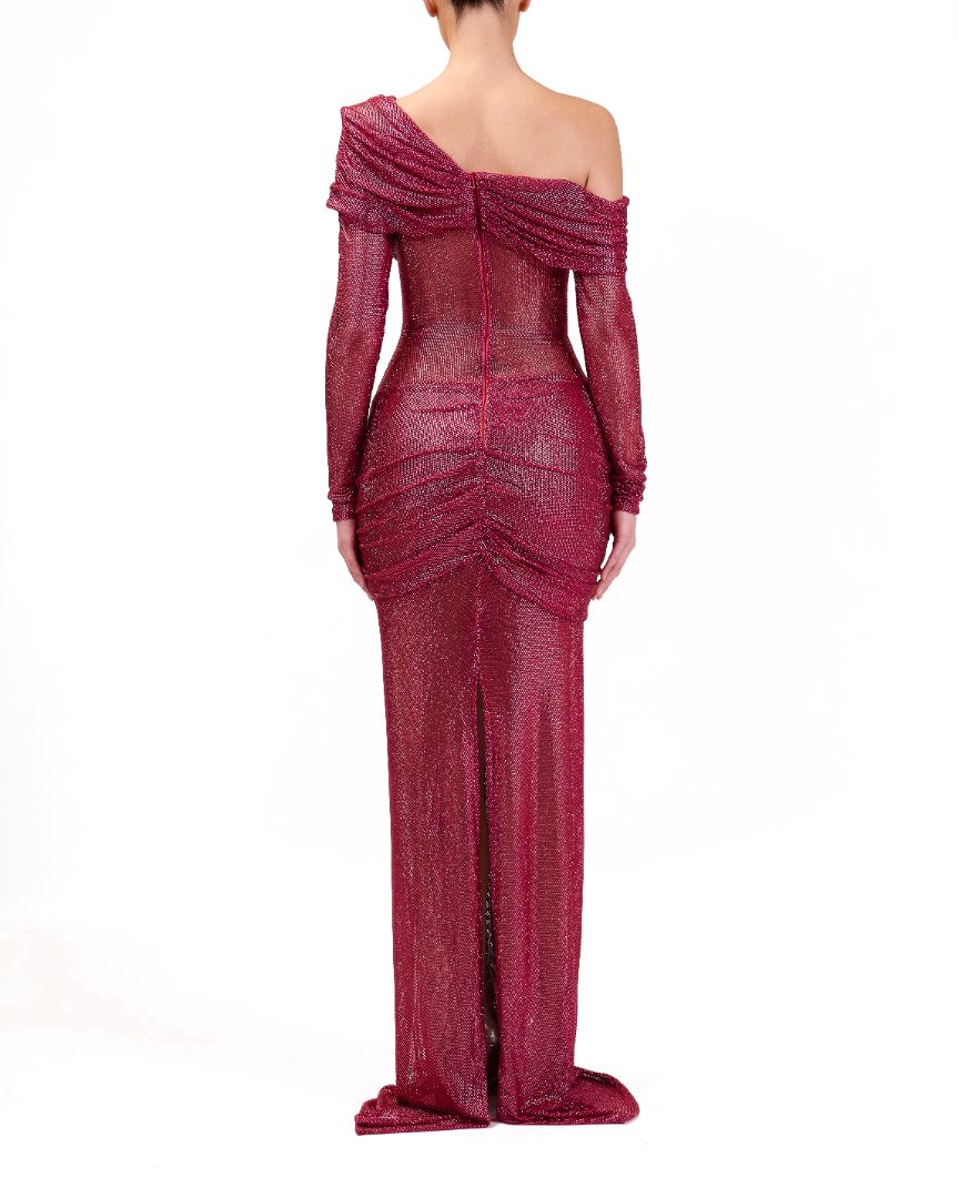 Elegant and sophisticated evening gown. The gown is designed with a striking off-shoulder neckline that adds a bold and dramatic flair.