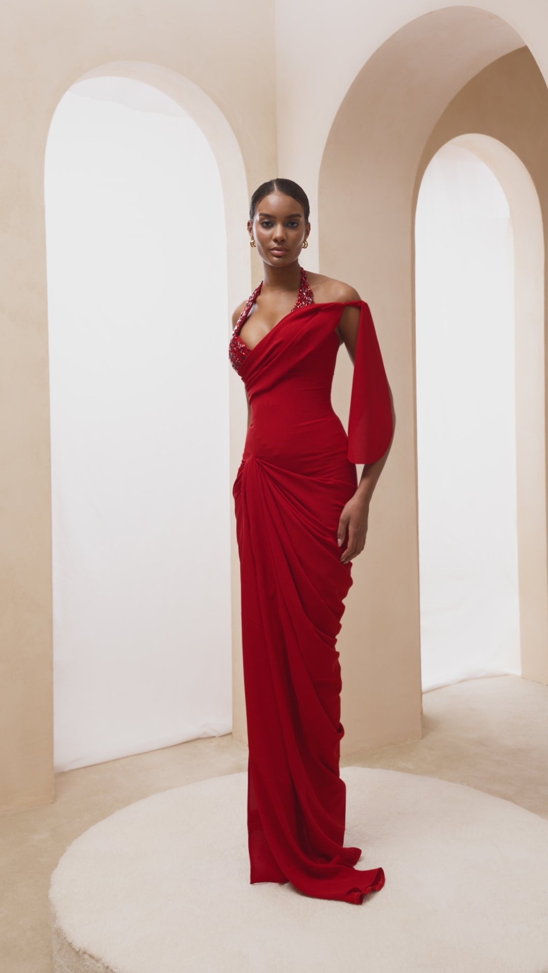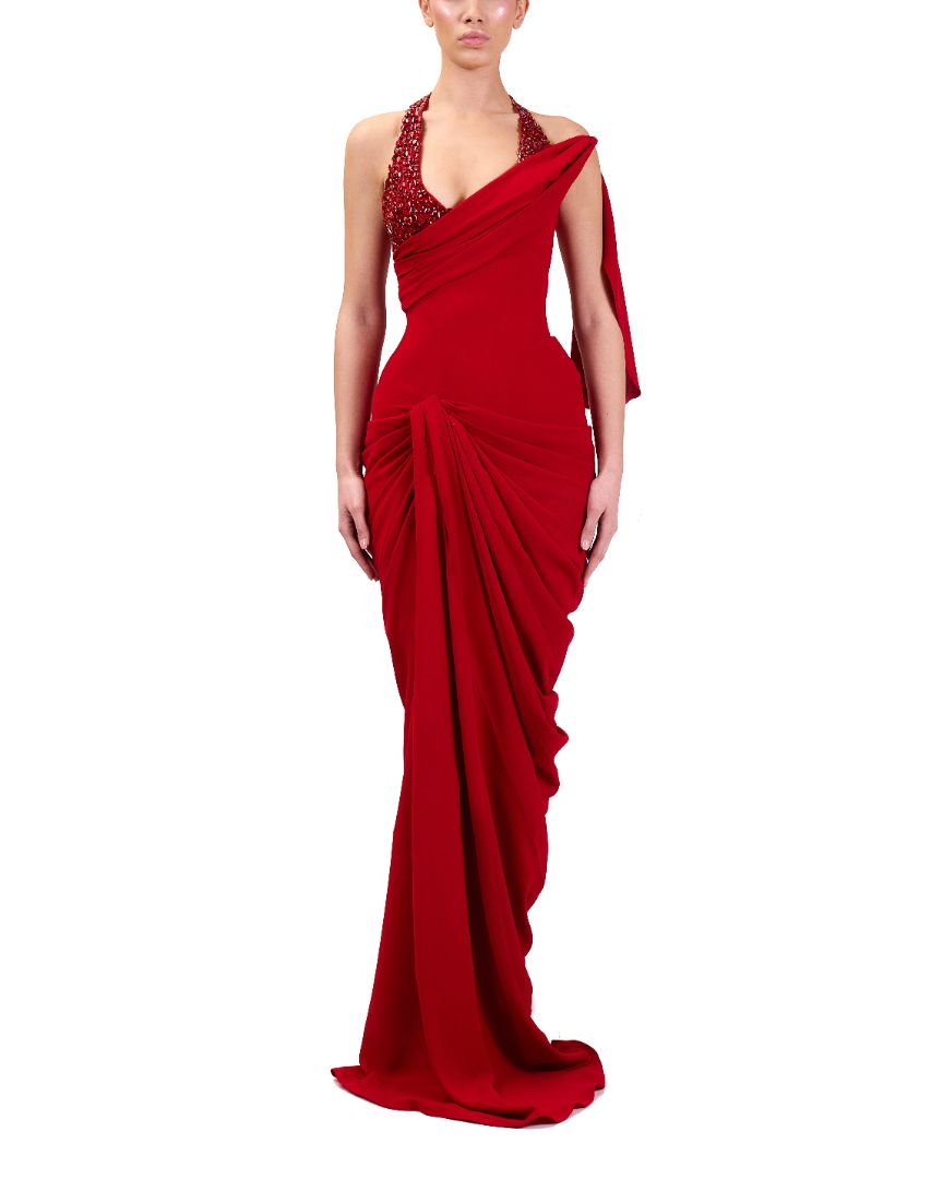 Red, one-shoulder, formal evening gown with a train.