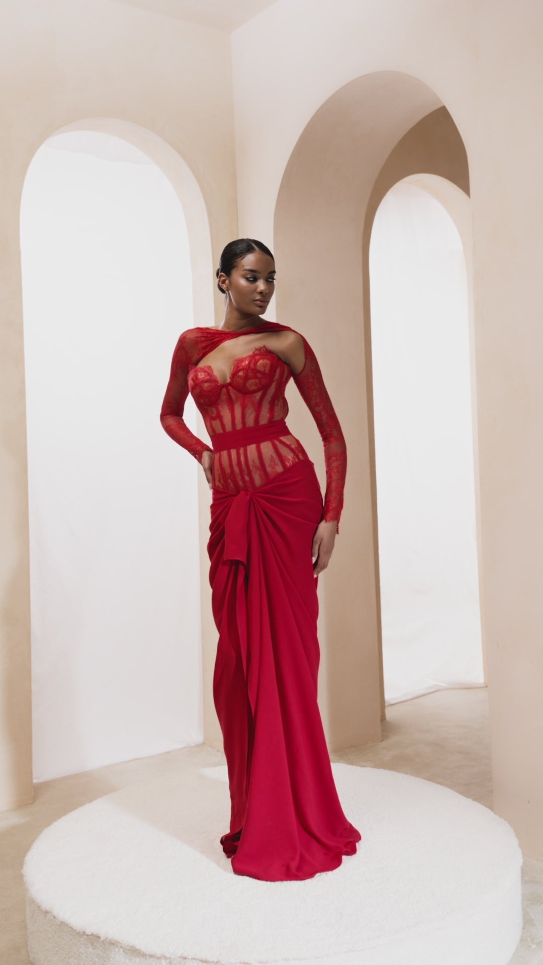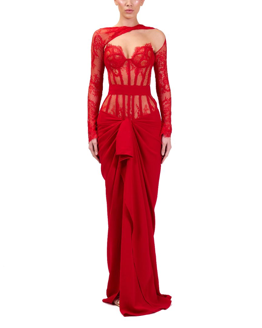 - Sheer corset bodice in red lace with exposed boning and built-in cups