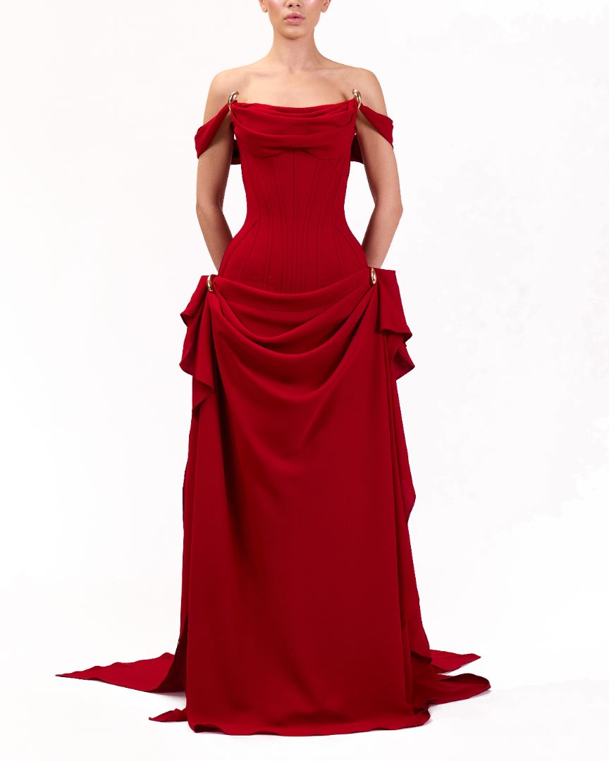 red, off-the-shoulder, floor-length dress with a train and bow details.