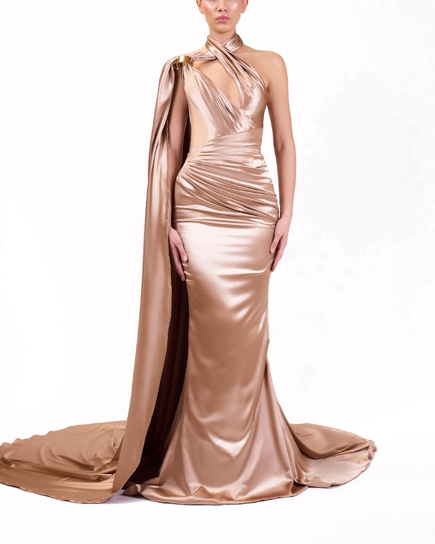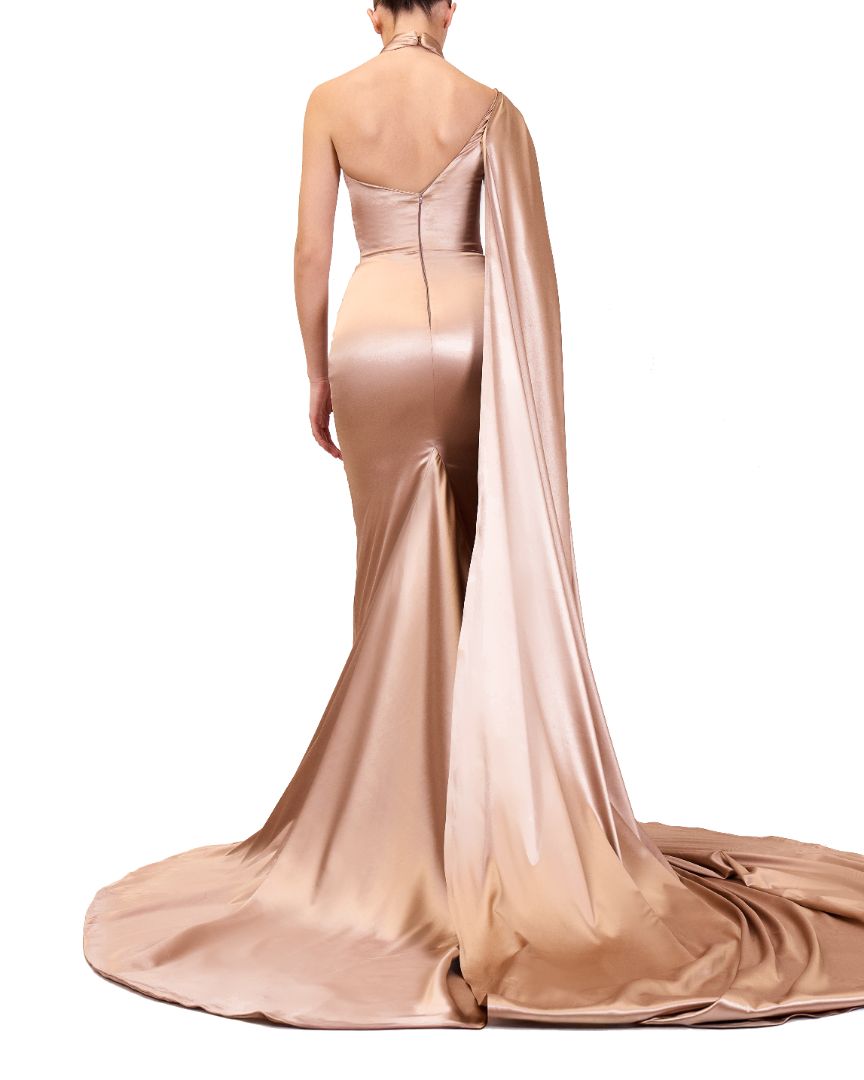 beige, one-shoulder, floor-length dress with a train, showcasing a formal attire style.