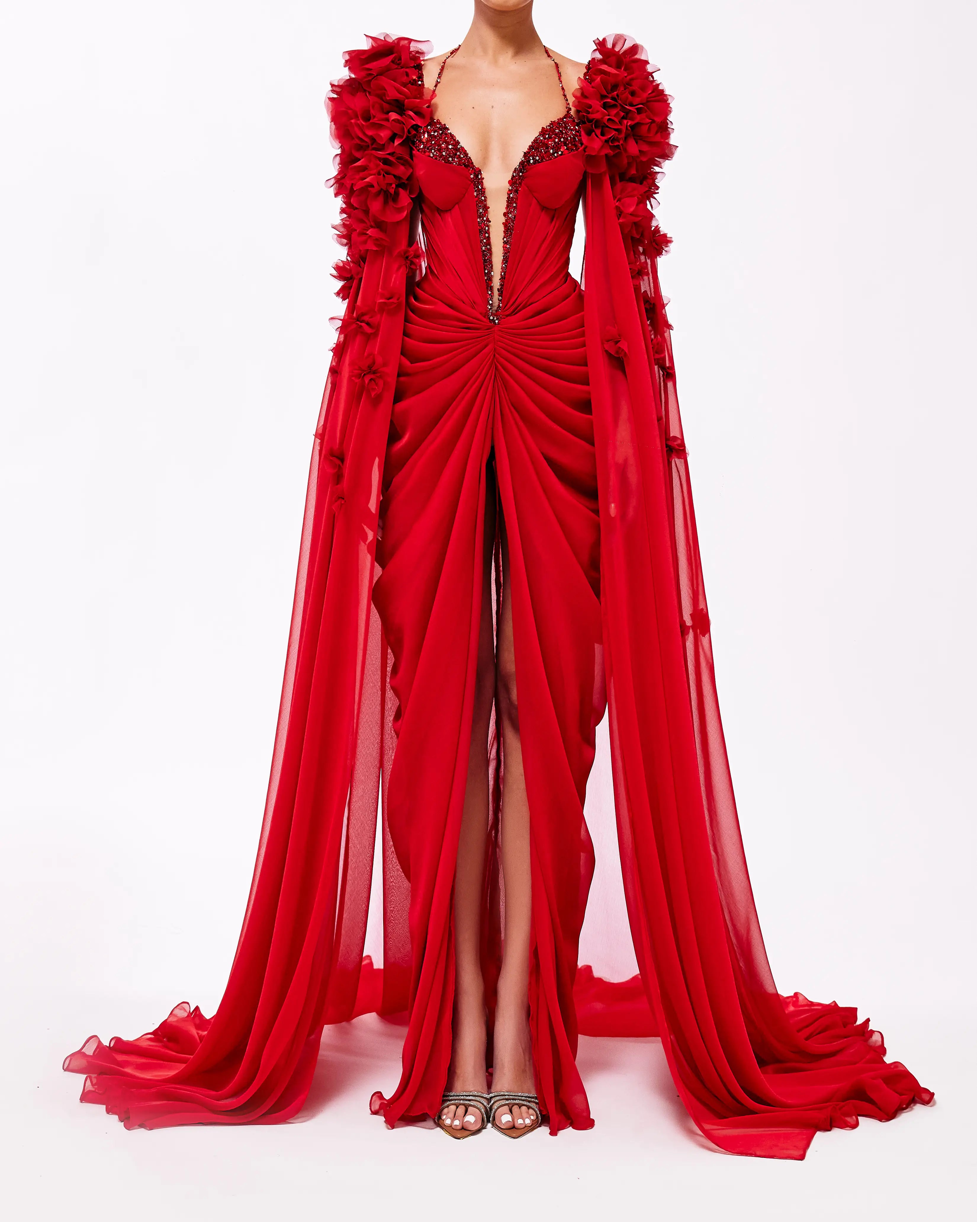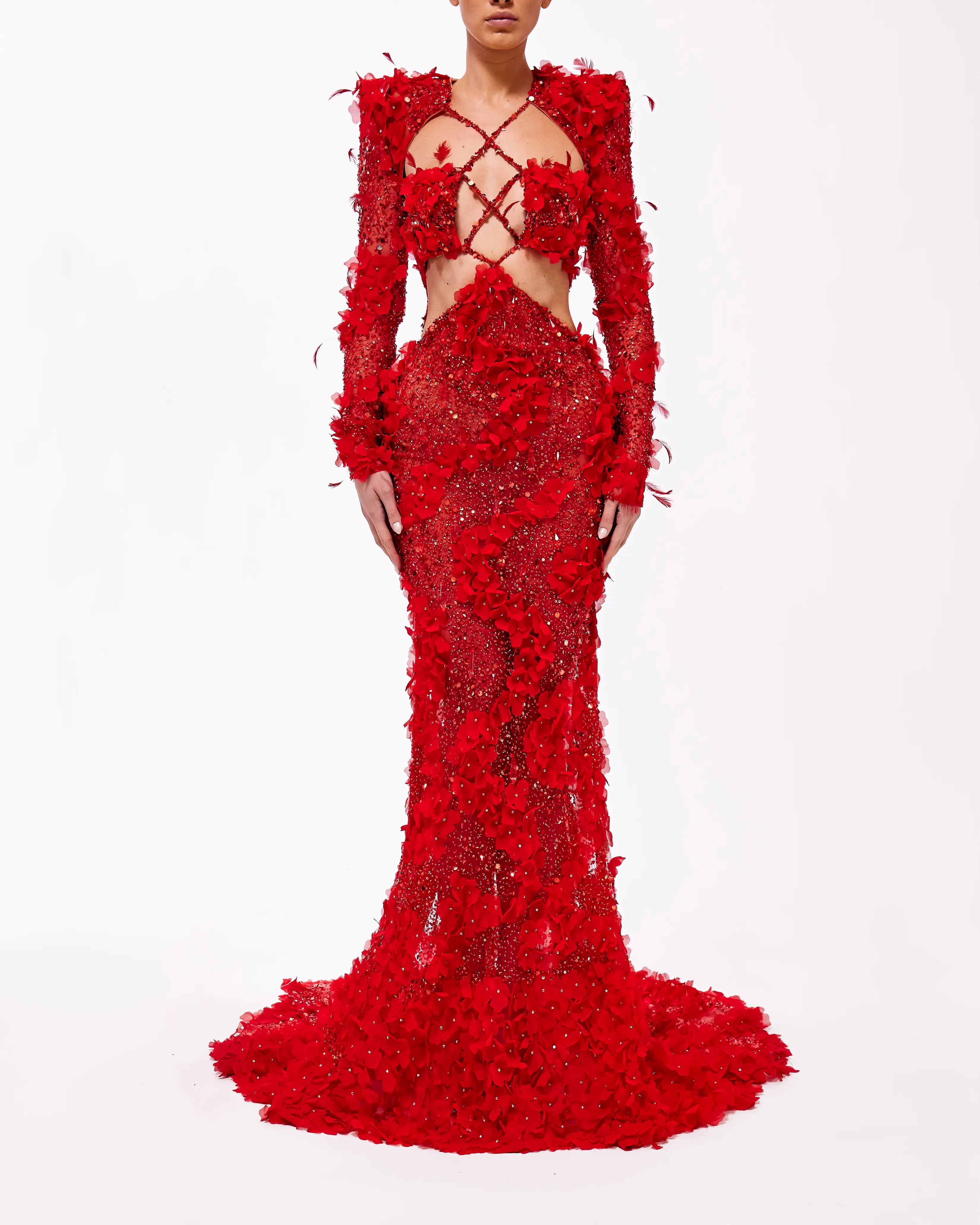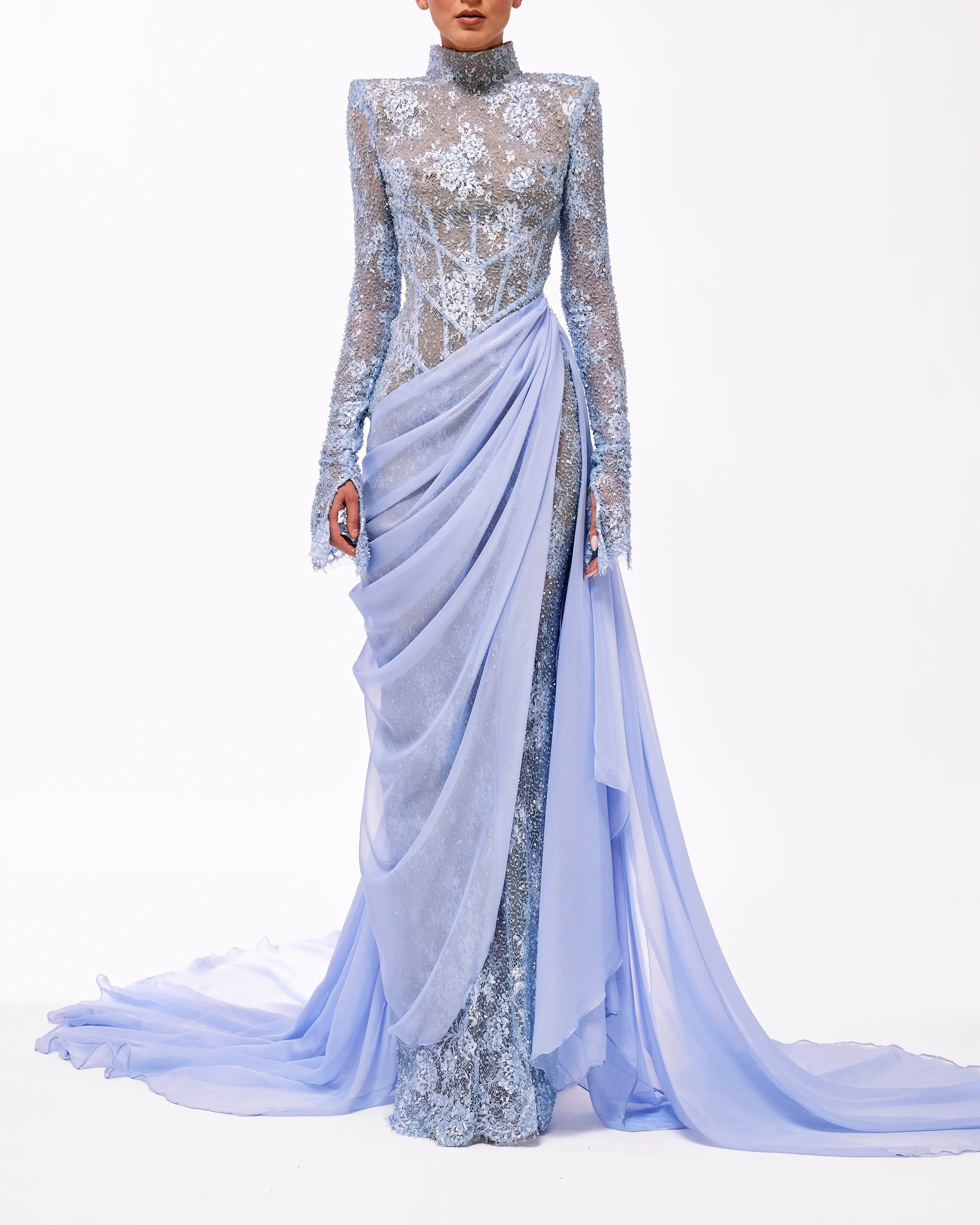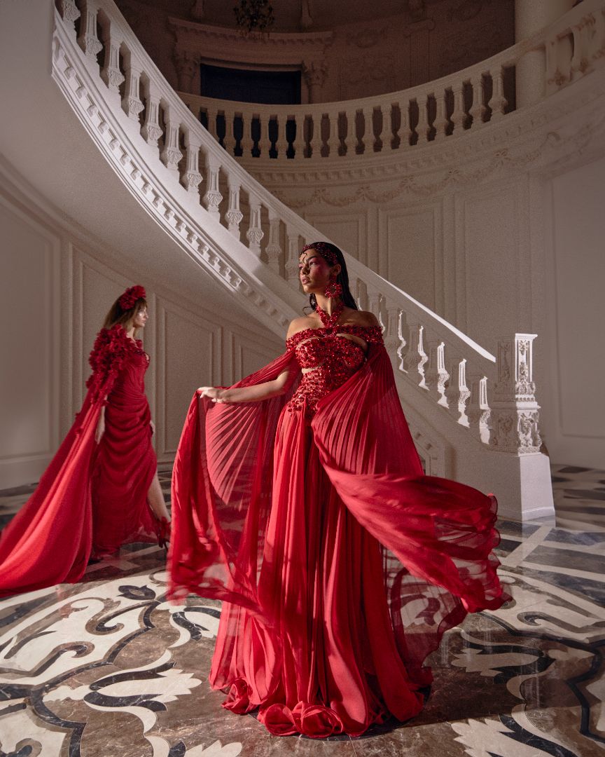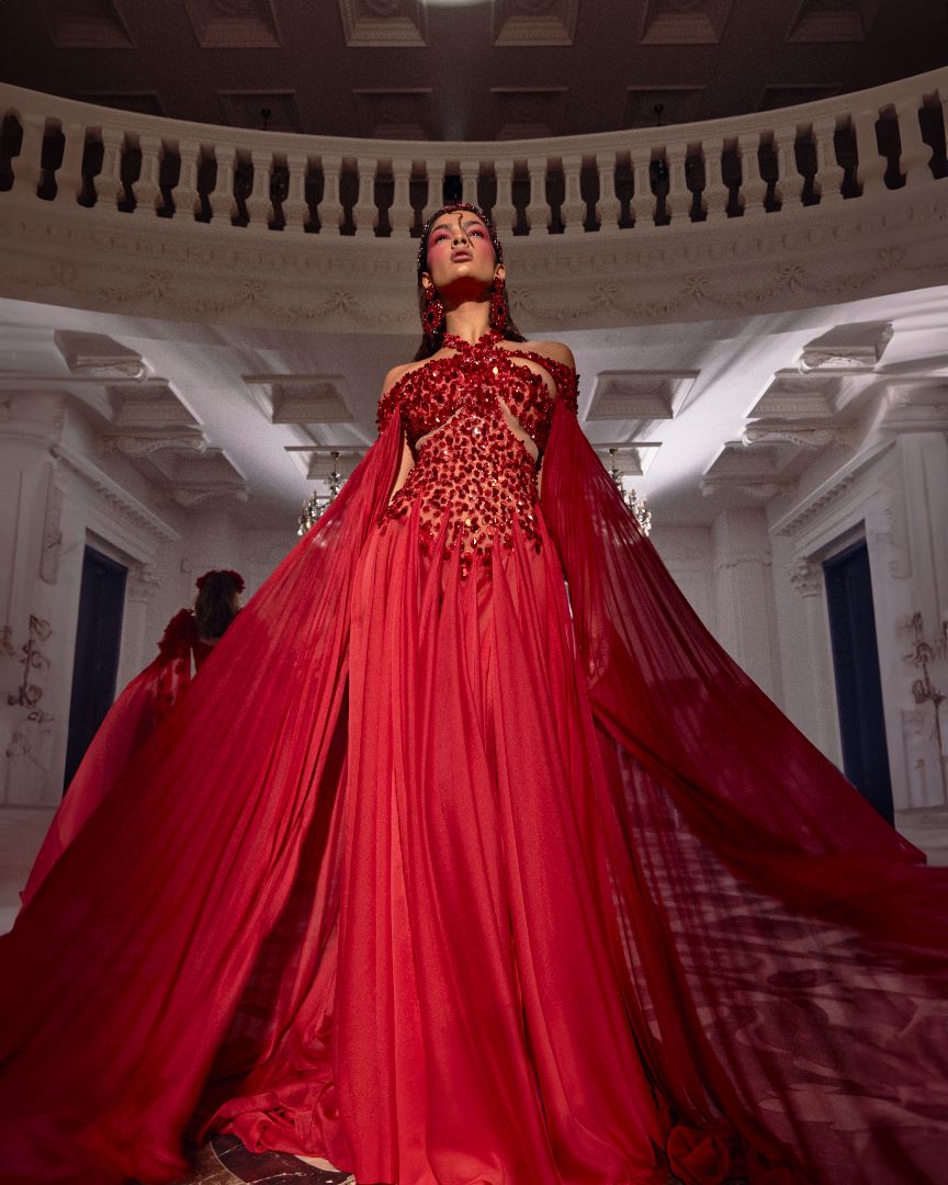 A collection full of life, Haute Allure brings your imagination to reality. With a vast selection in hues, these gowns provide ample options for extravagant events. This collection is elegantly maximalistic, with the floral lace material, cape aspect, and other unique features. Enter a world of colorful drama through Valdrin Sahiti.