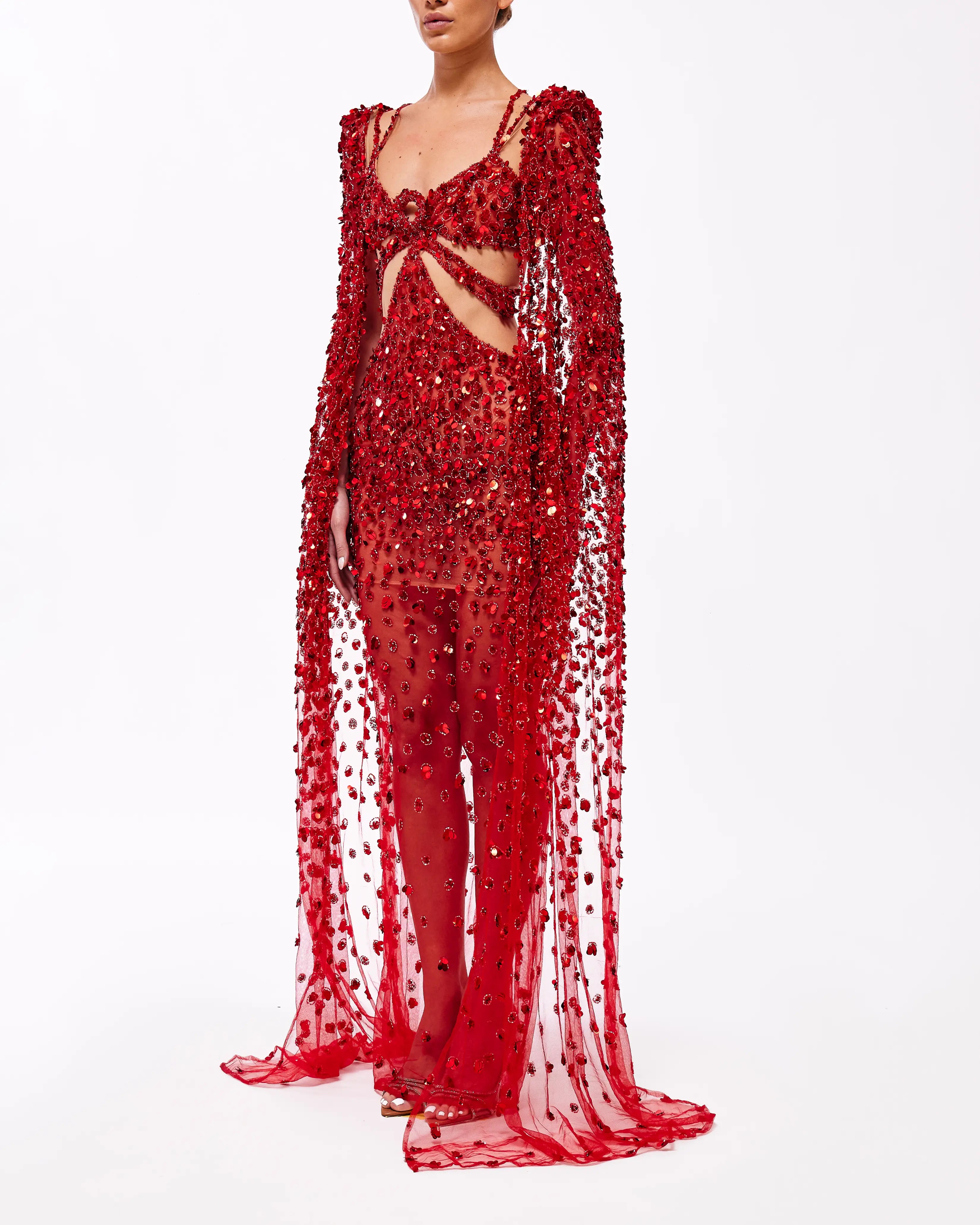 Red beaded gown.