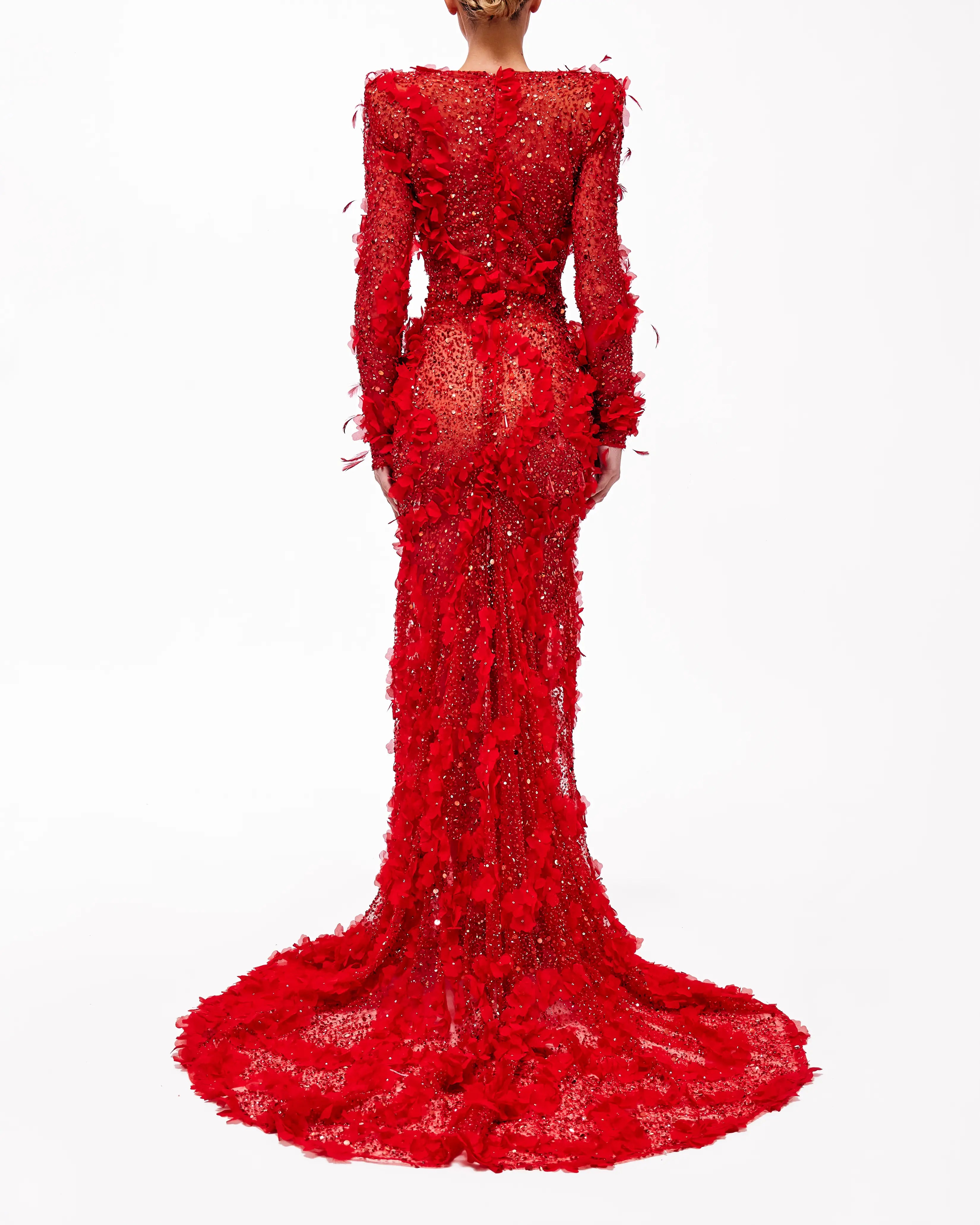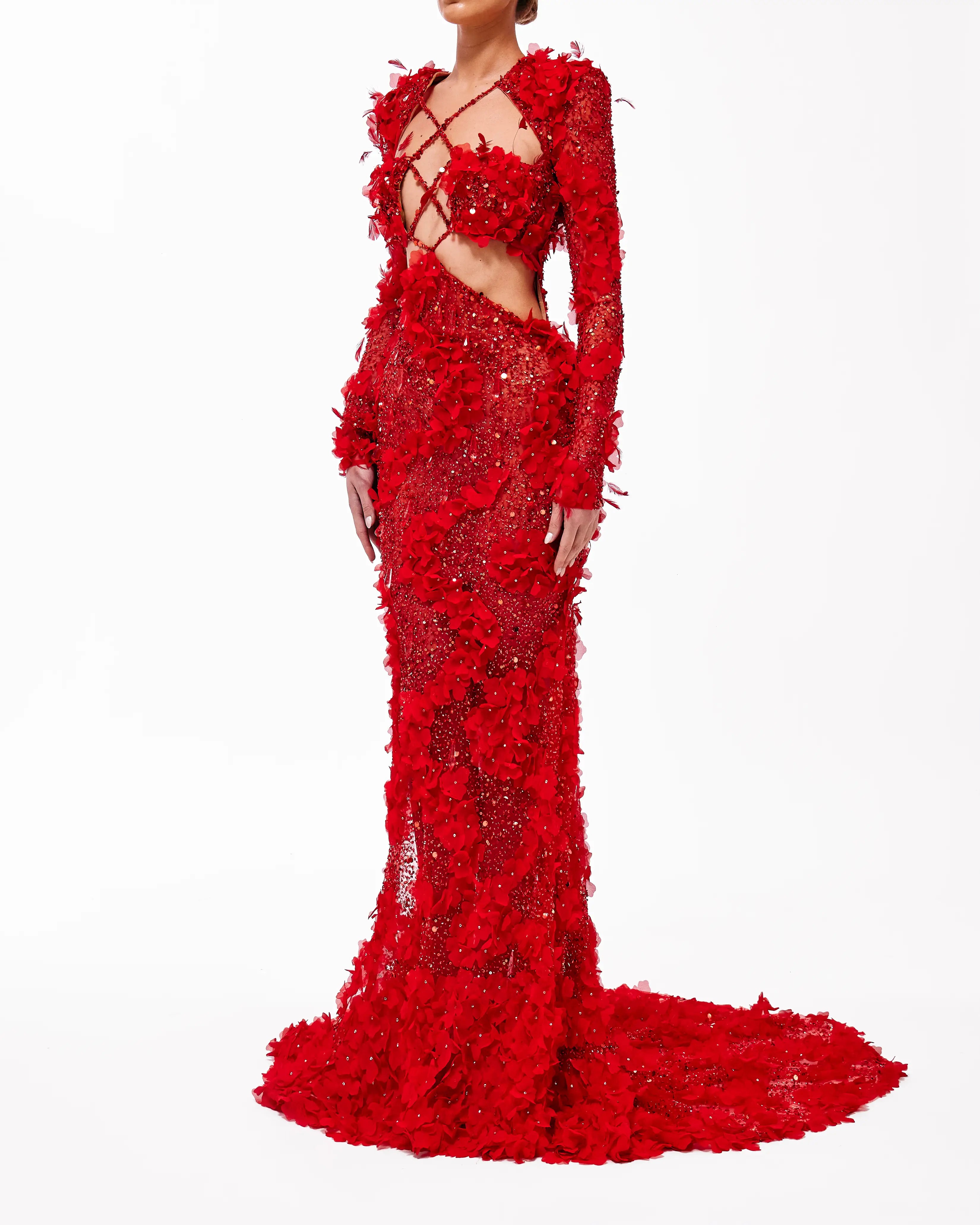 Long red gown with front cut outs, long sleeves & mermaid cut.