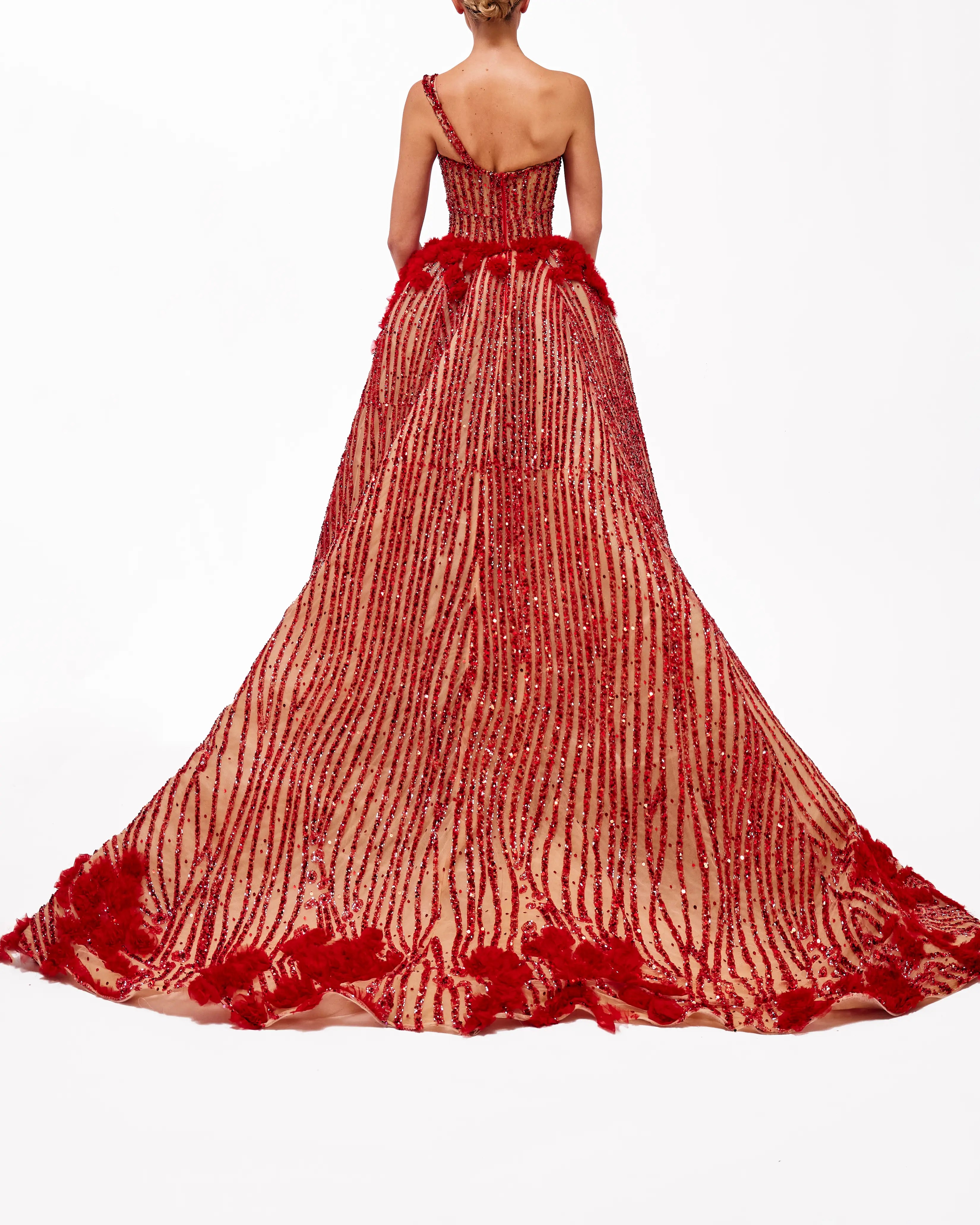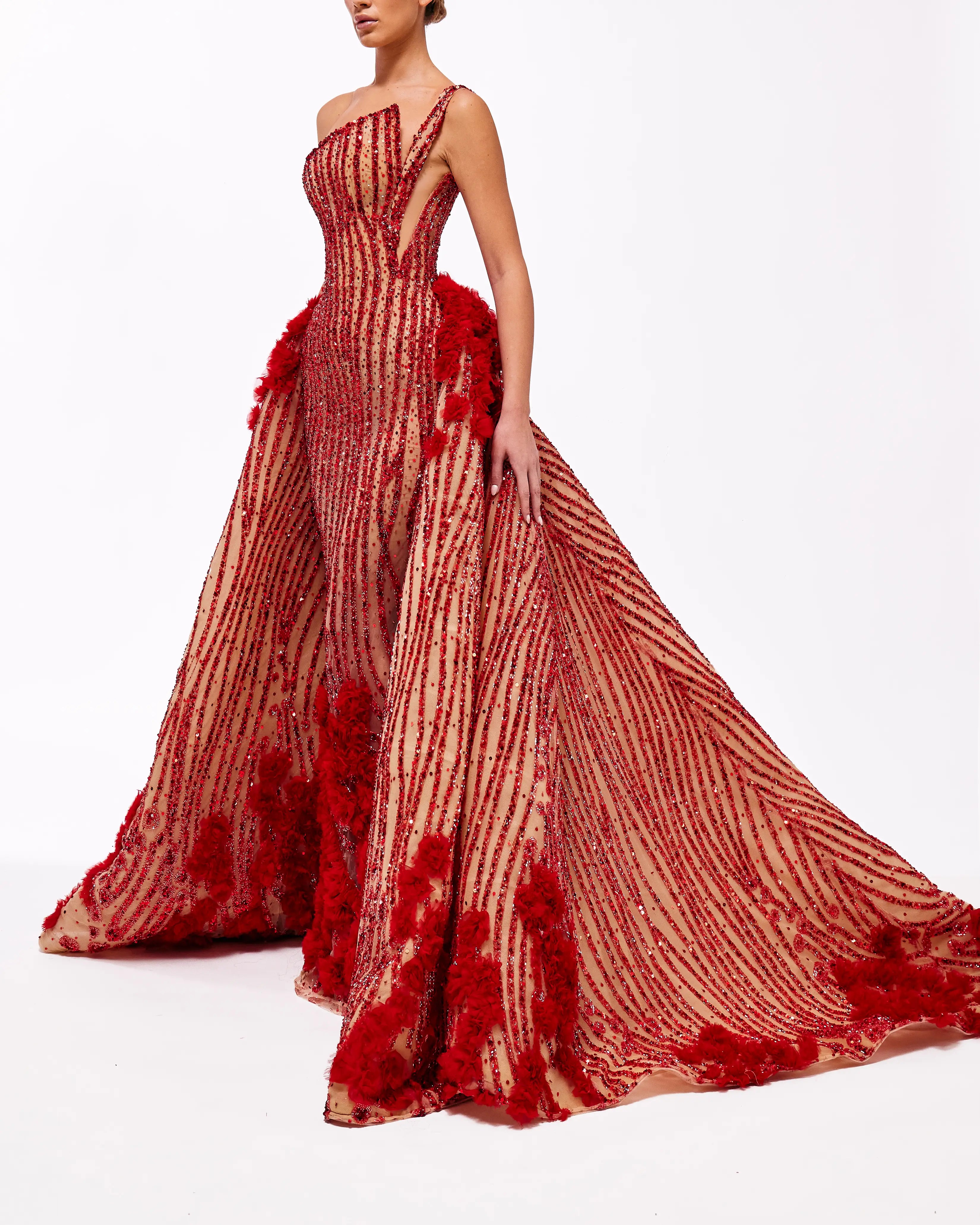 Red & nude asymmetric gown with detachable overskirt.