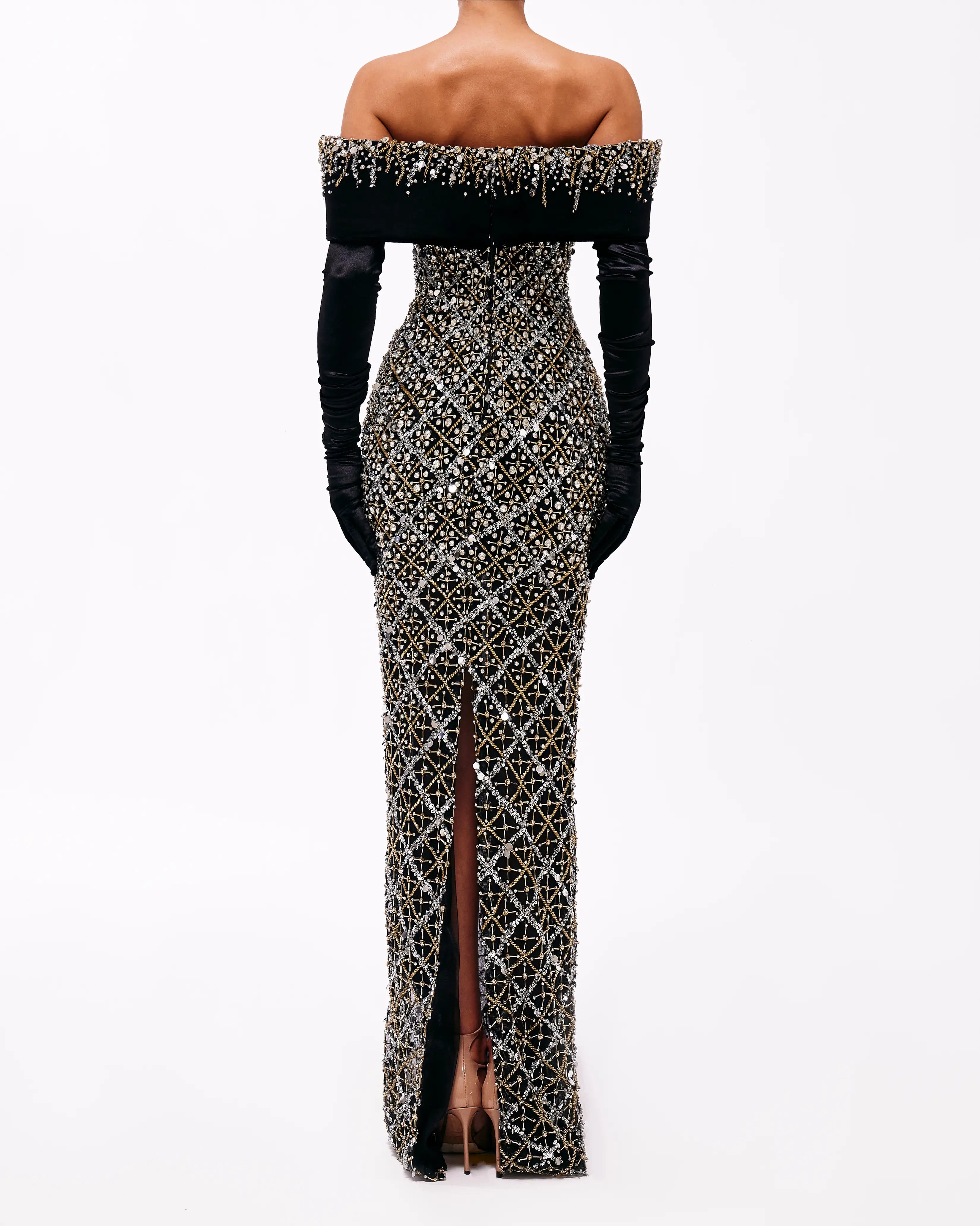 Off shoulder black & silver gown.