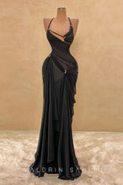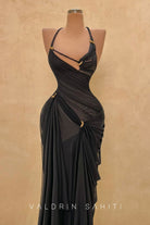A statement of power and precision — this black gown by Valdrin Sahiti sculpts the body through strategic draping and sheer contouring. Gold-toned metal details punctuate the design, adding structure and edge to the fluid silhouette. A masterful balance of seduction and sophistication, made for the woman who commands every room she enters.